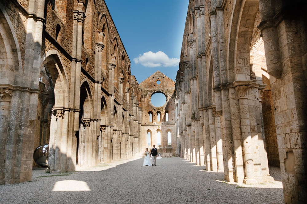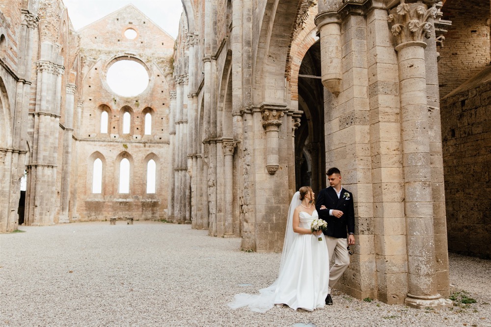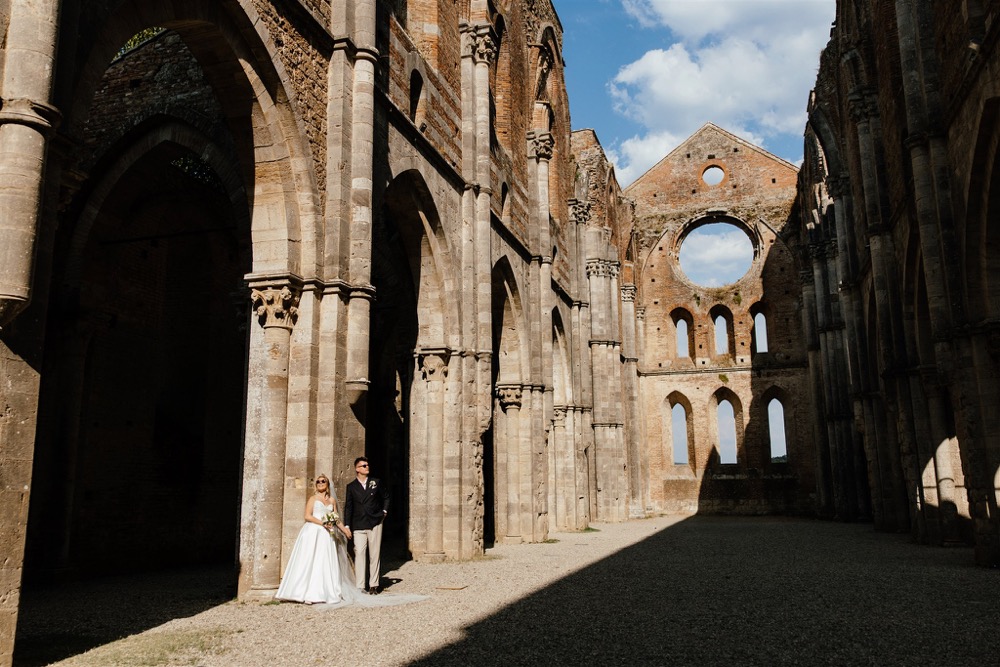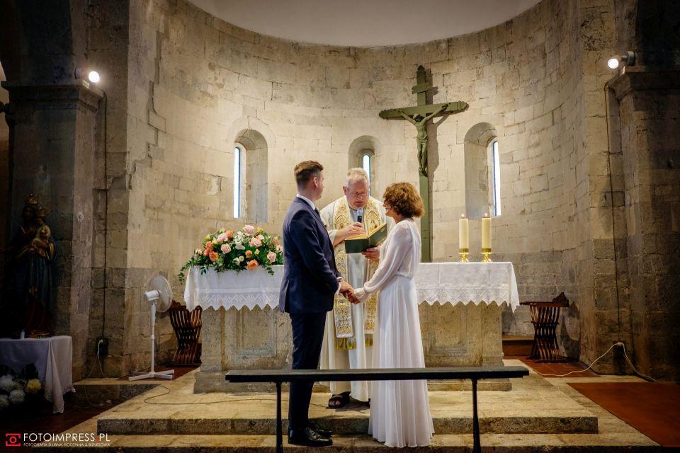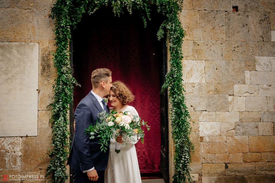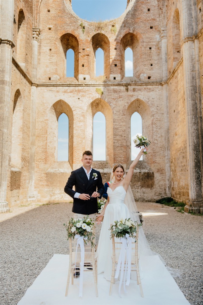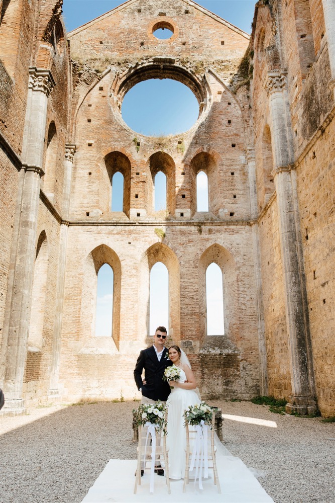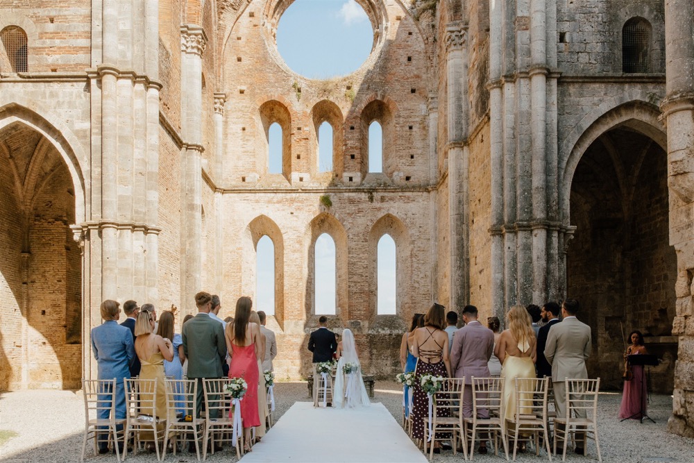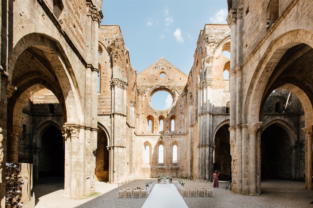 Ślub w pięknym, kamiennym budynku dawnego kościoła, z otwartym dachem.