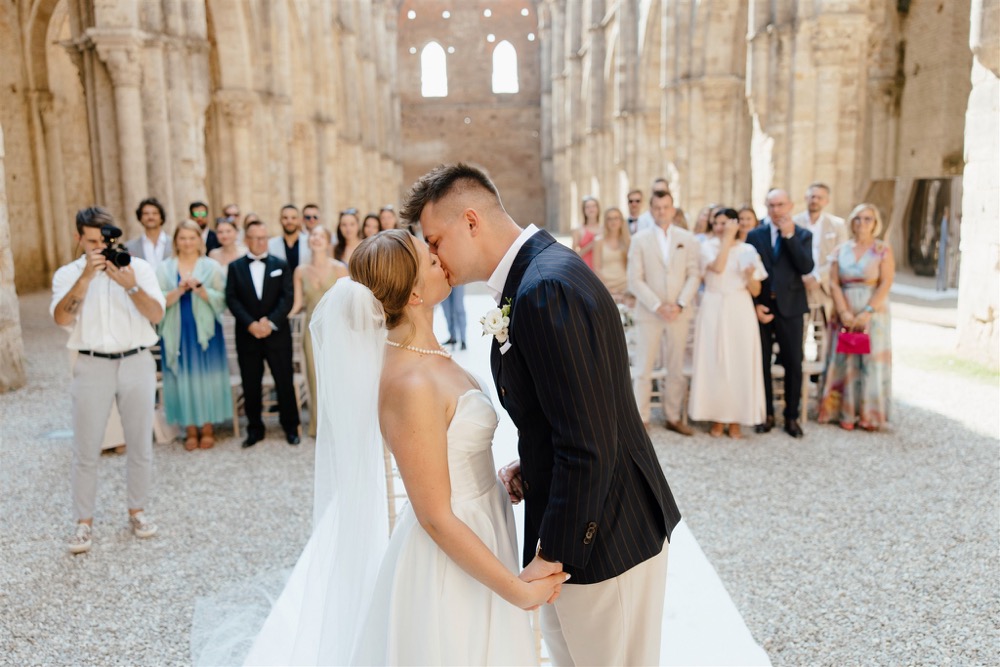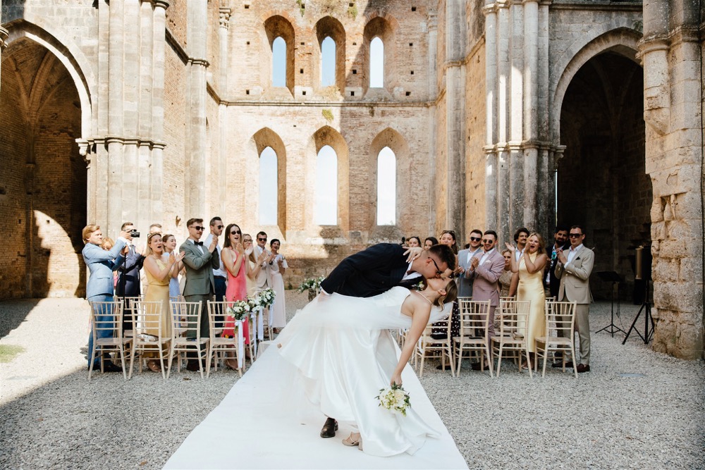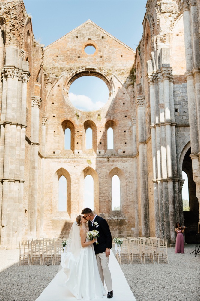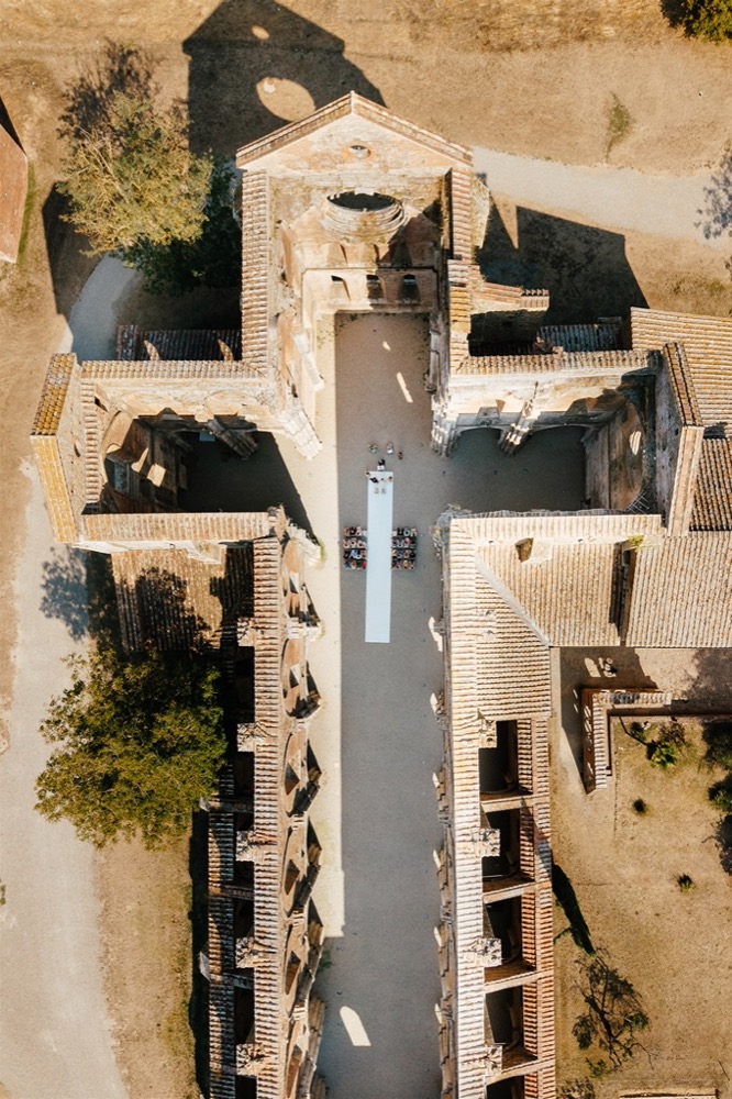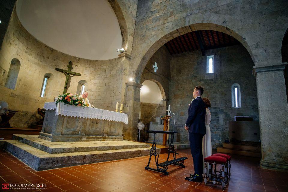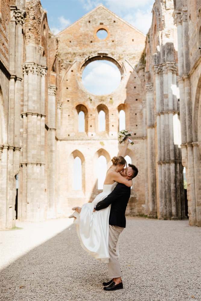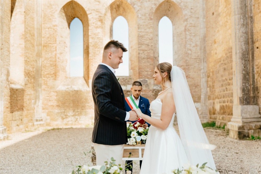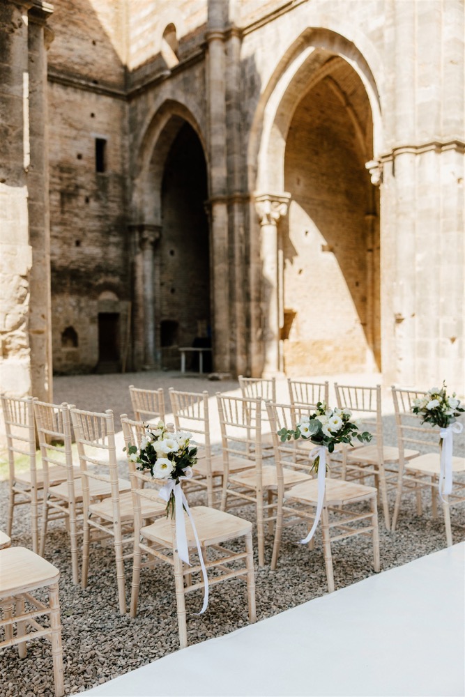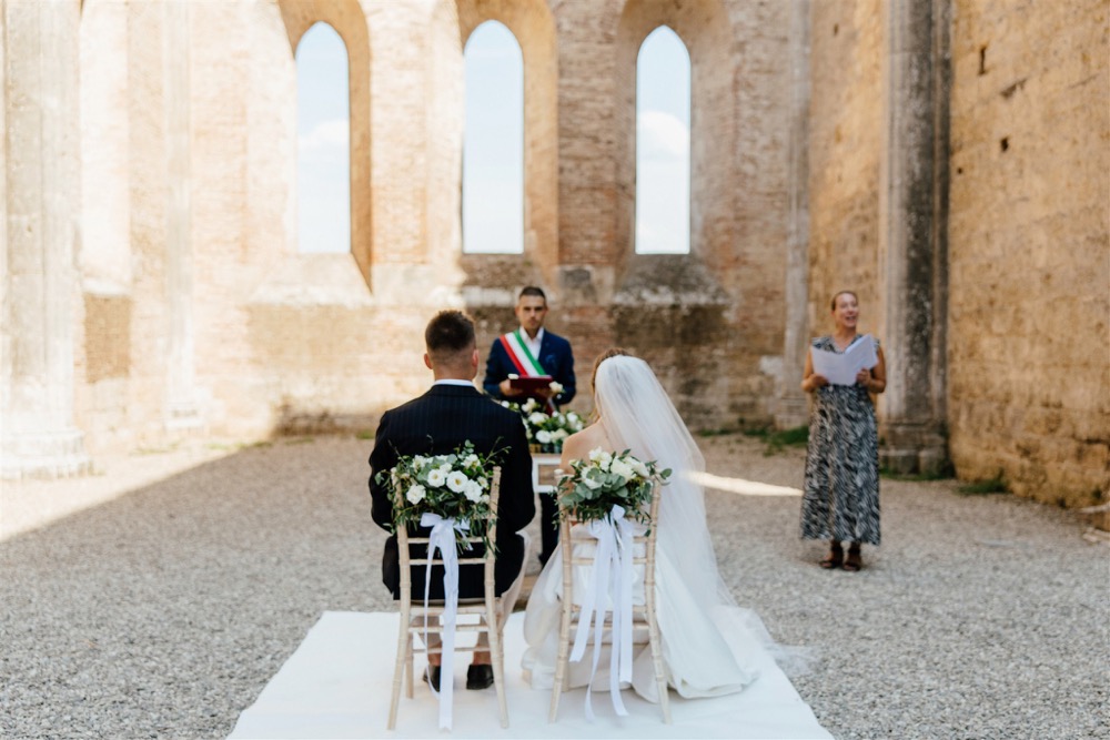 Ślub w pięknym, kamiennym budynku dawnego kościoła, z otwartym dachem.