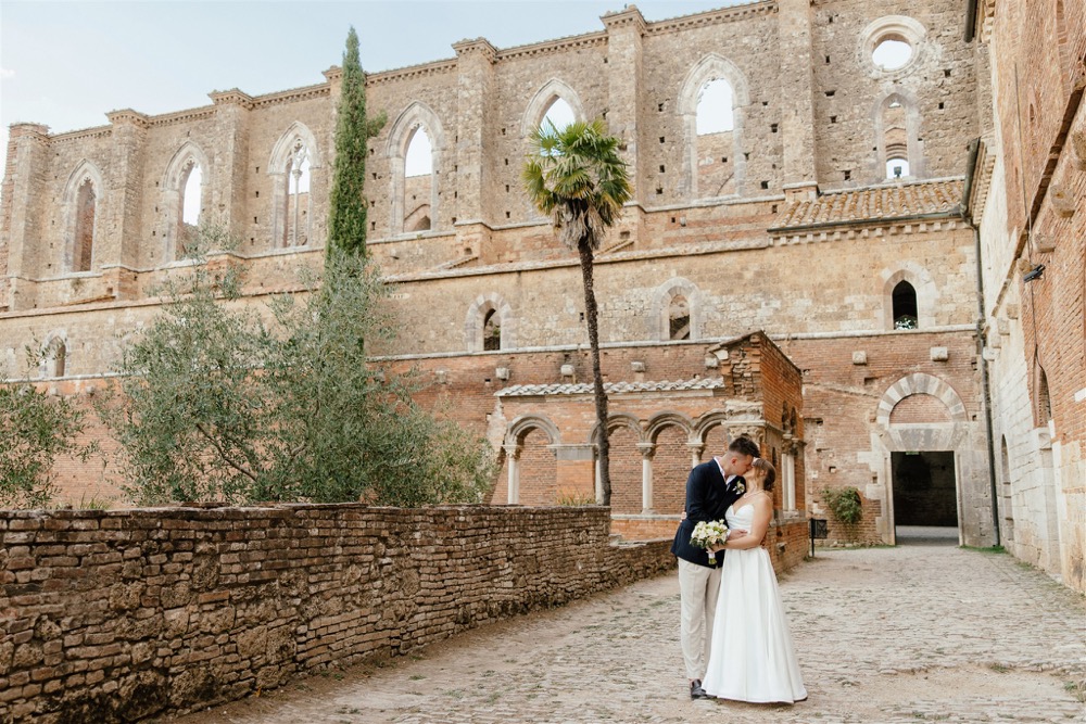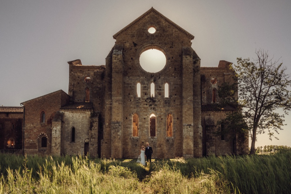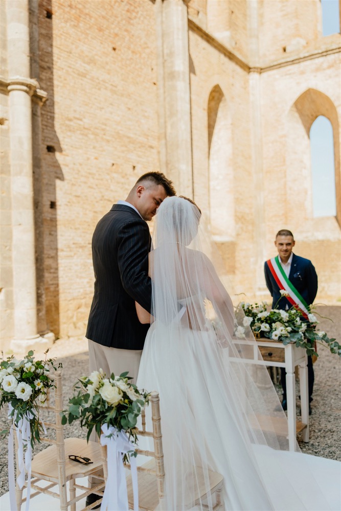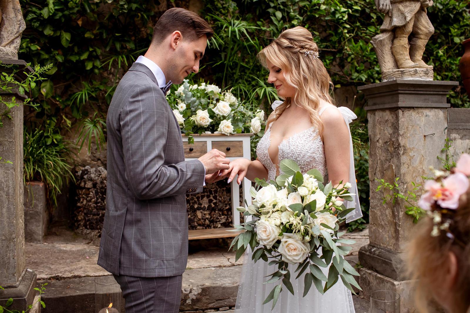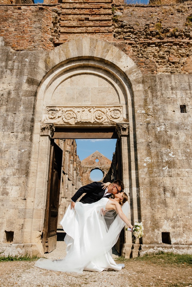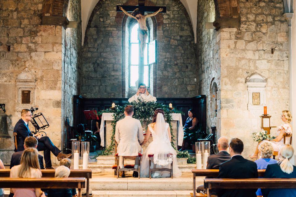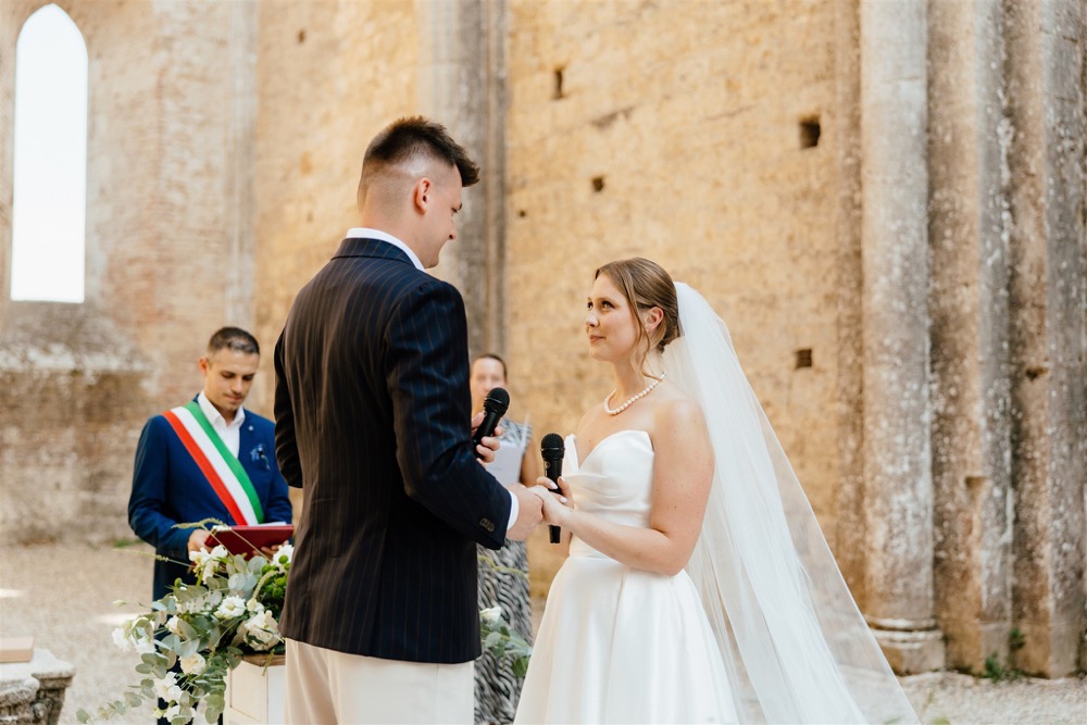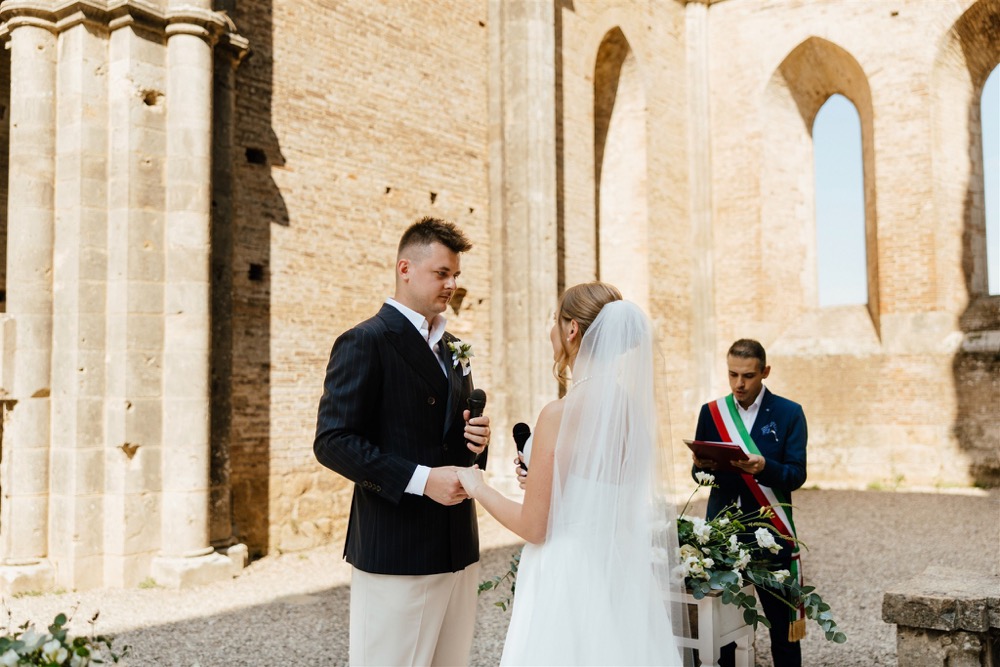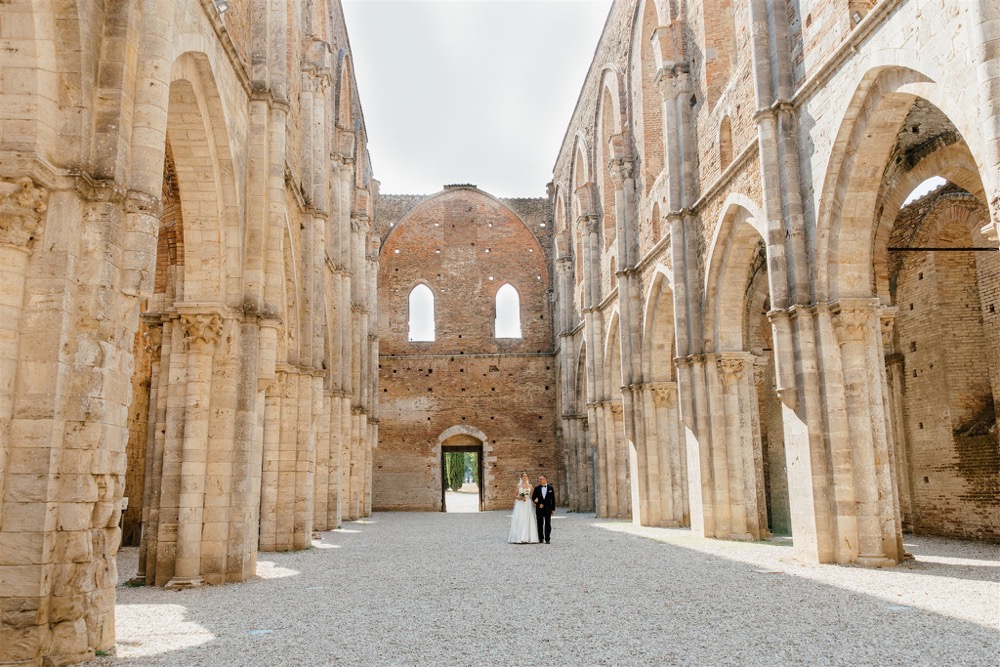 Ślub w pięknym, kamiennym budynku dawnego kościoła, z otwartym dachem.