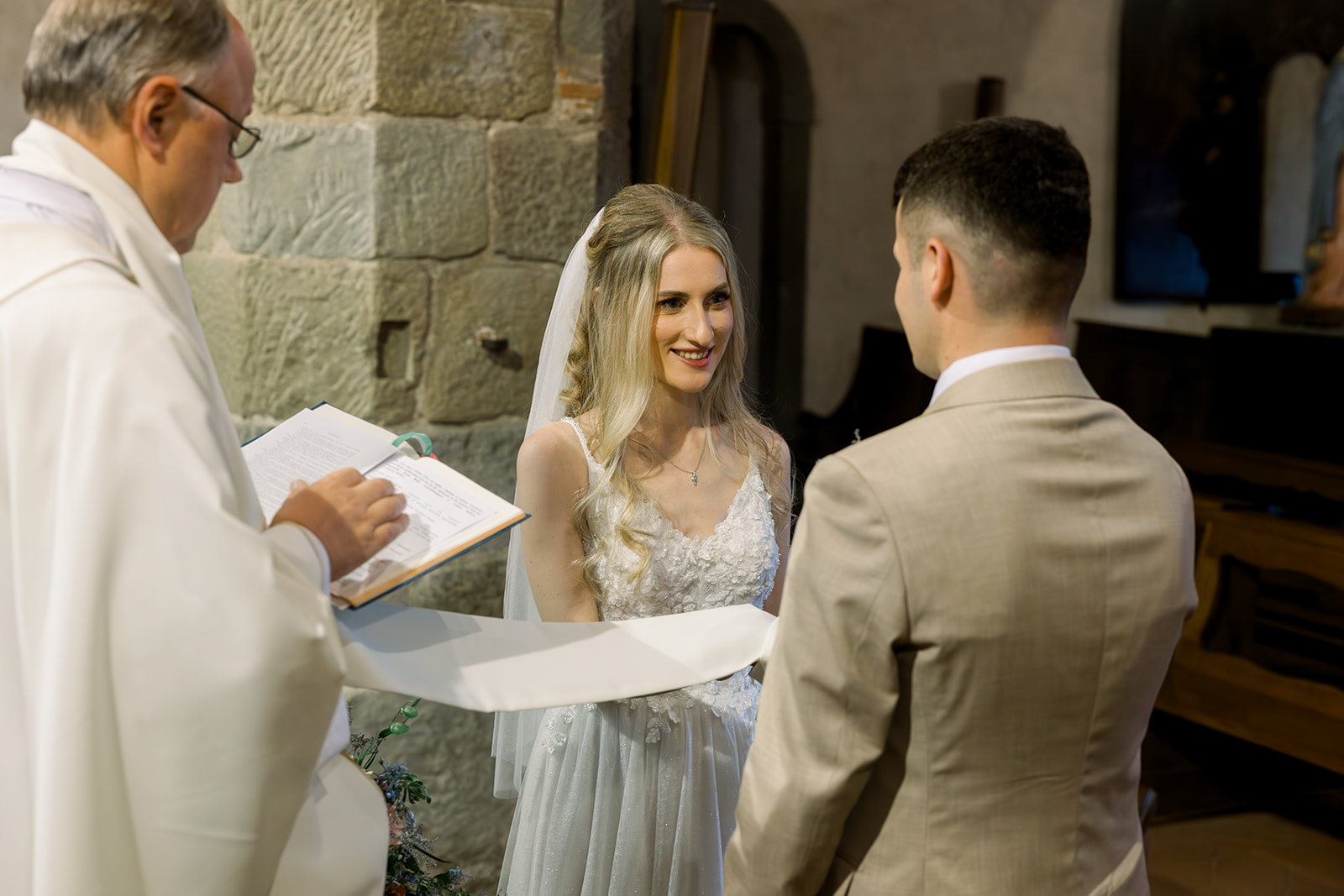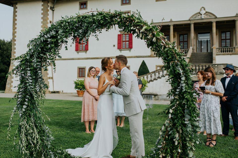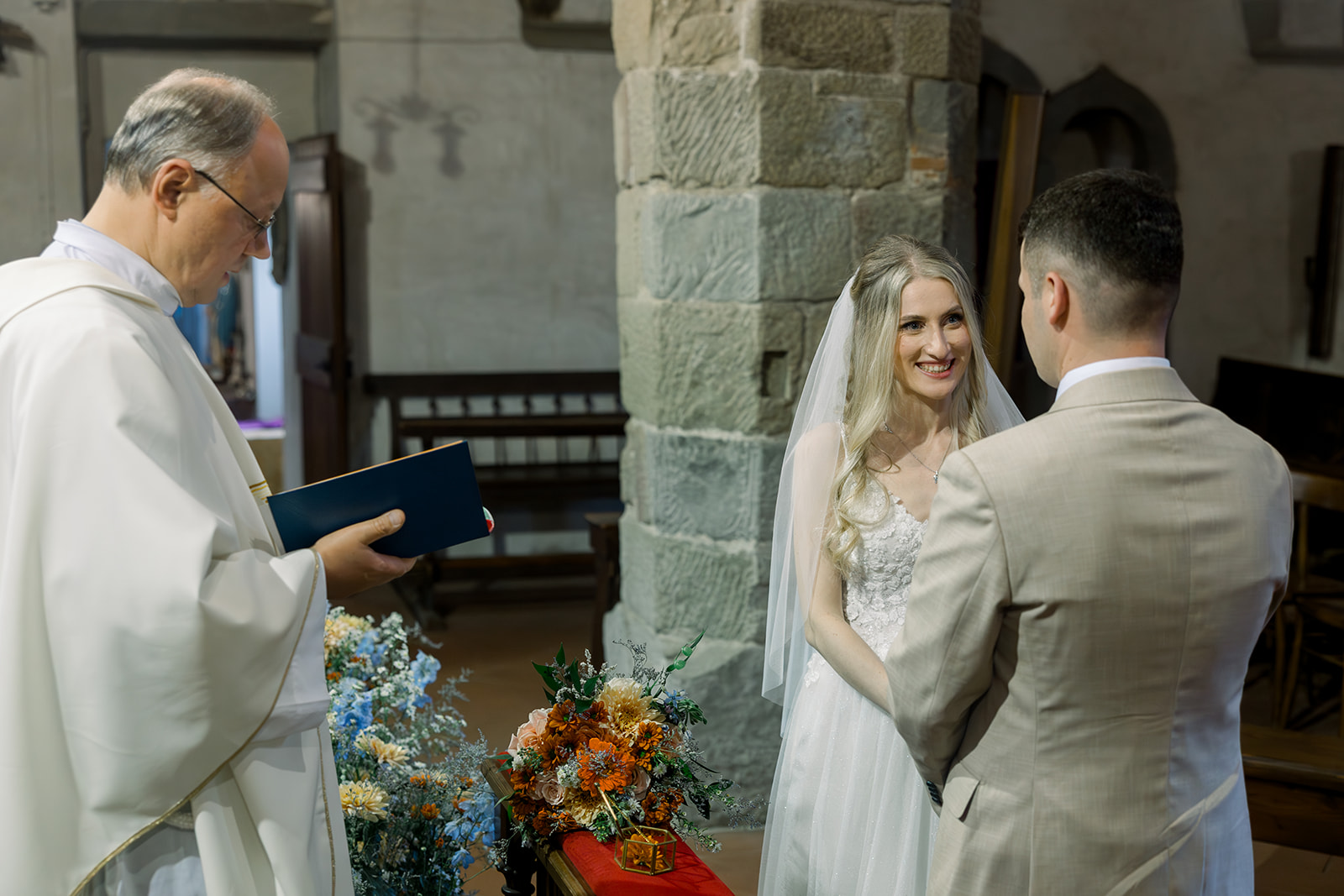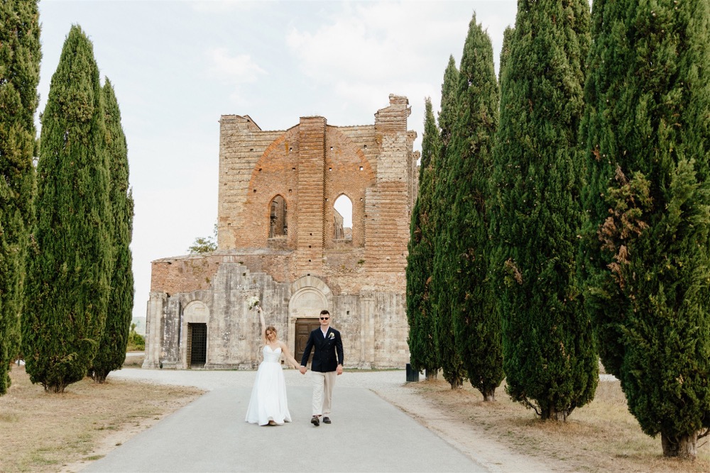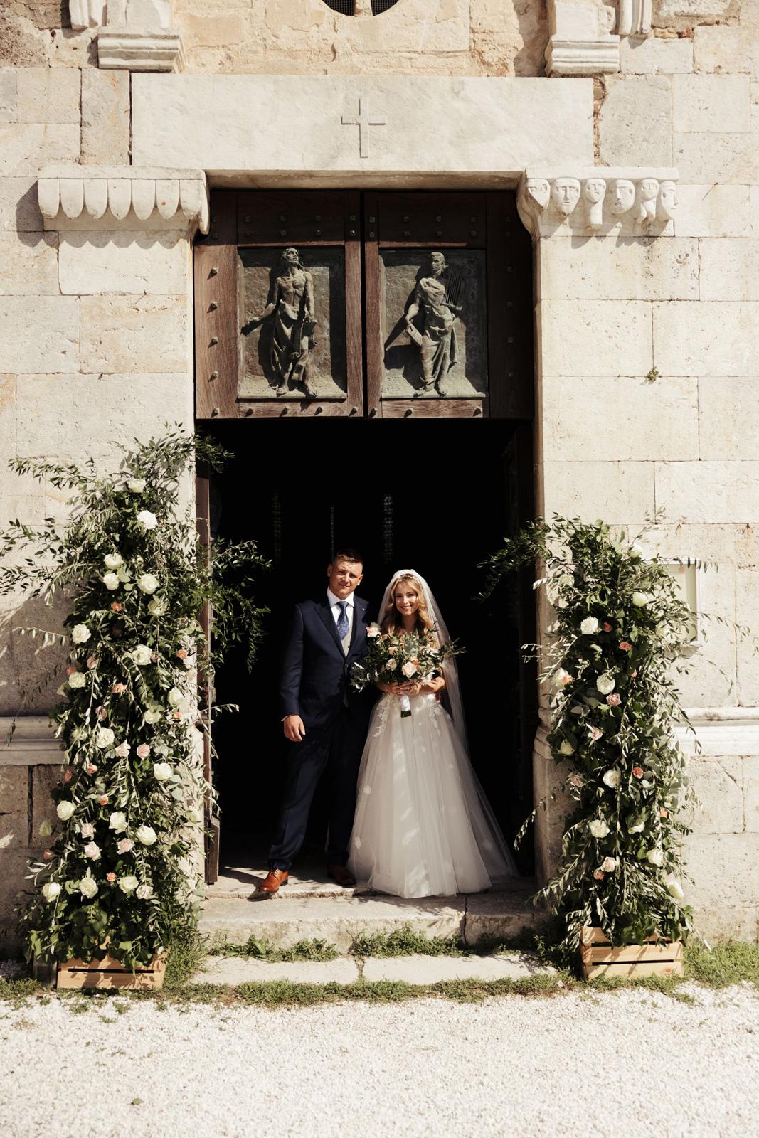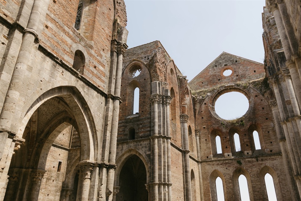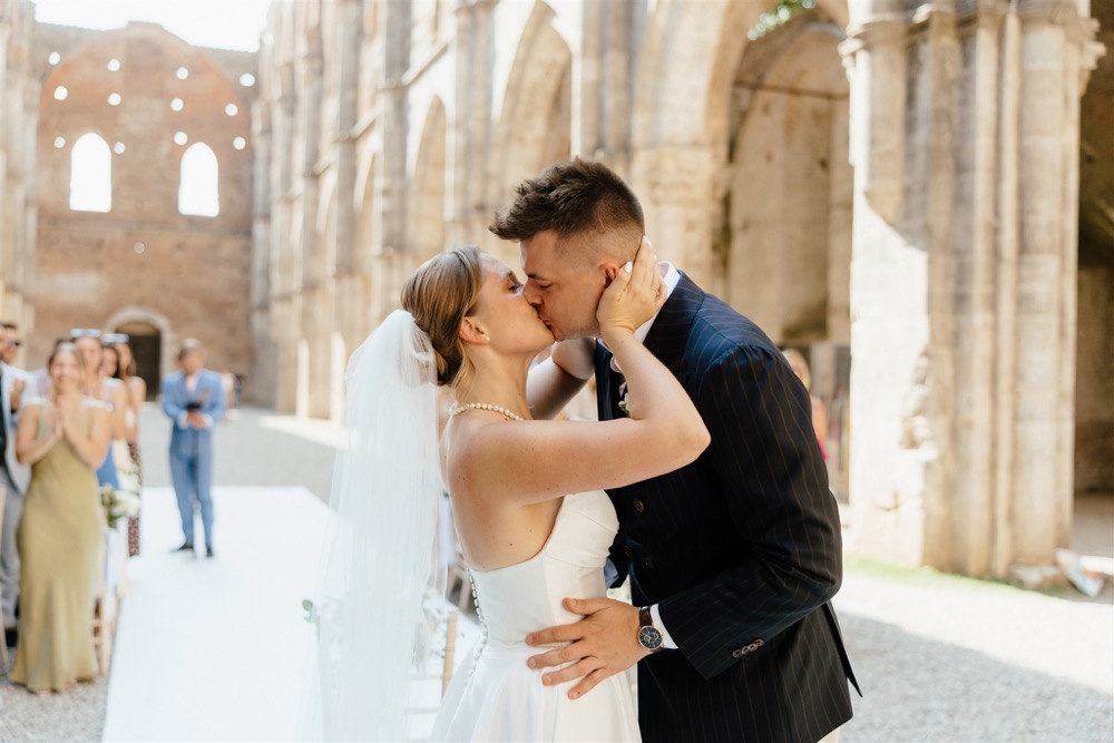 Ślub w pięknym, kamiennym budynku dawnego kościoła, z otwartym dachem.