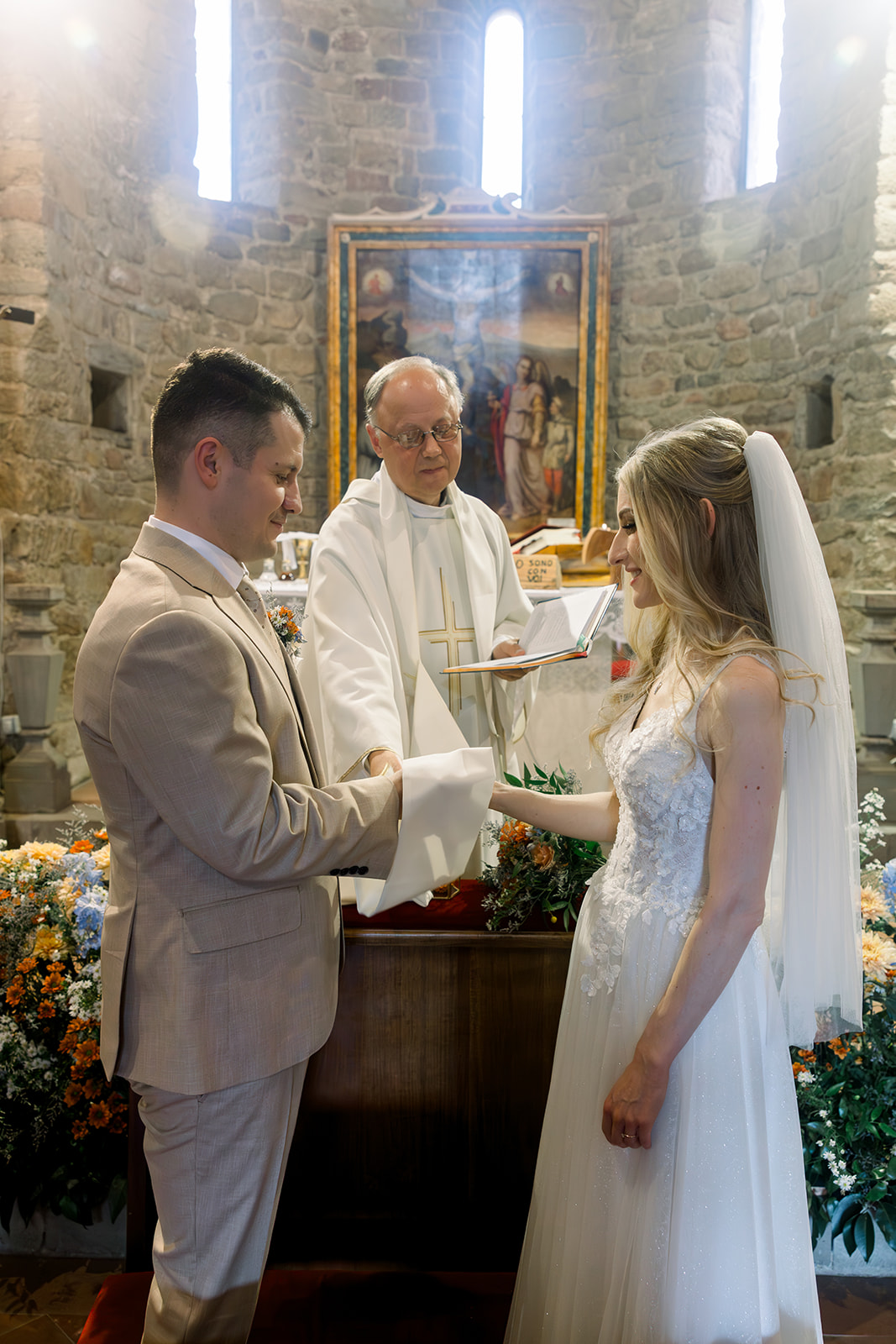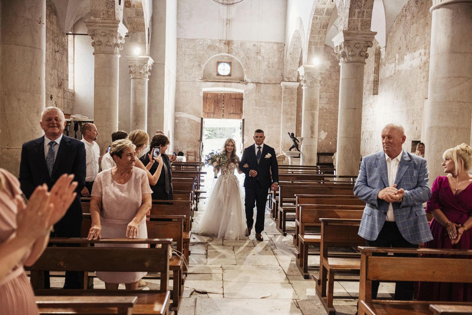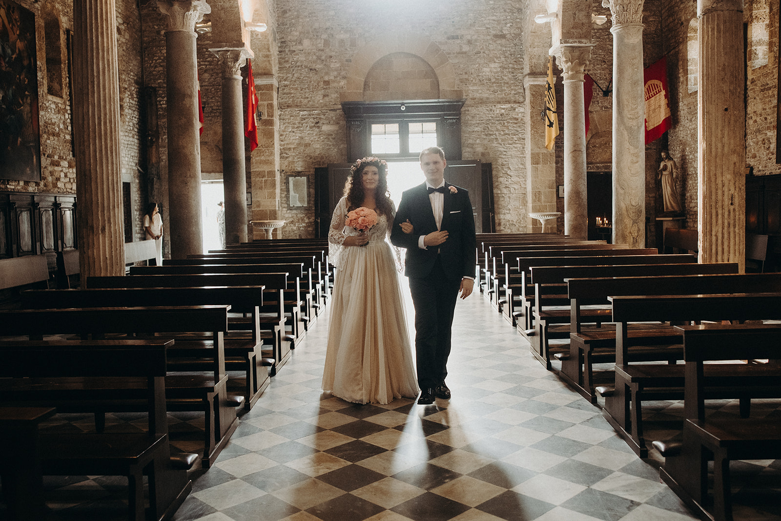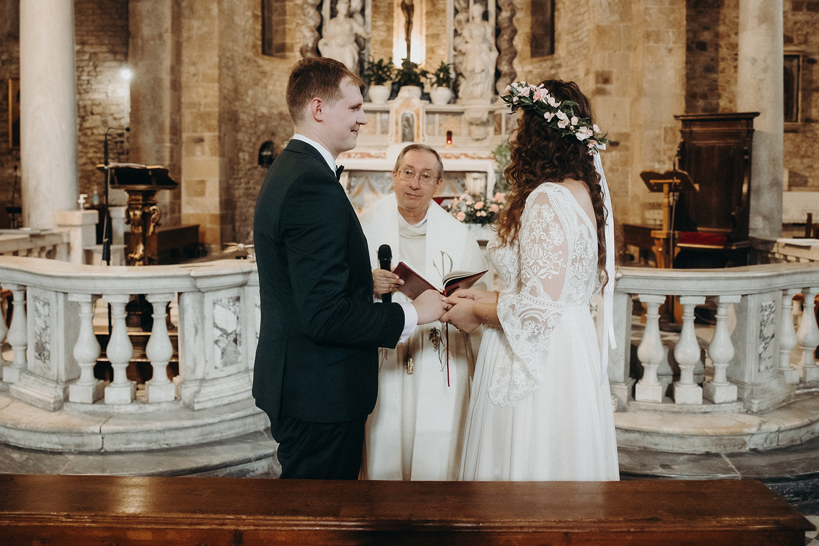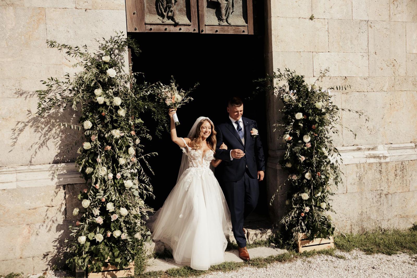 Ślub w pięknym, kamiennym budynku dawnego kościoła, z otwartym dachem.