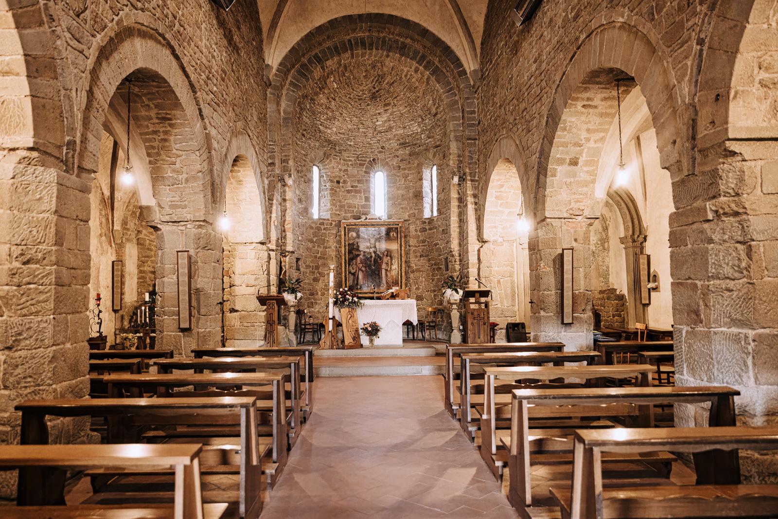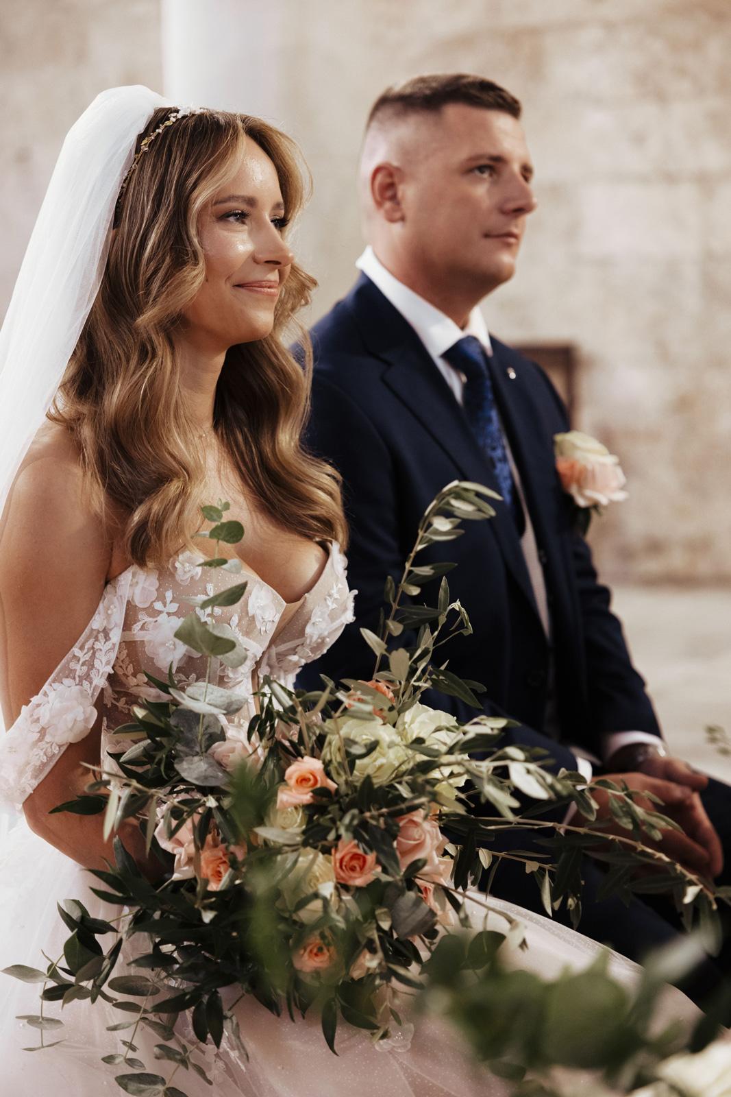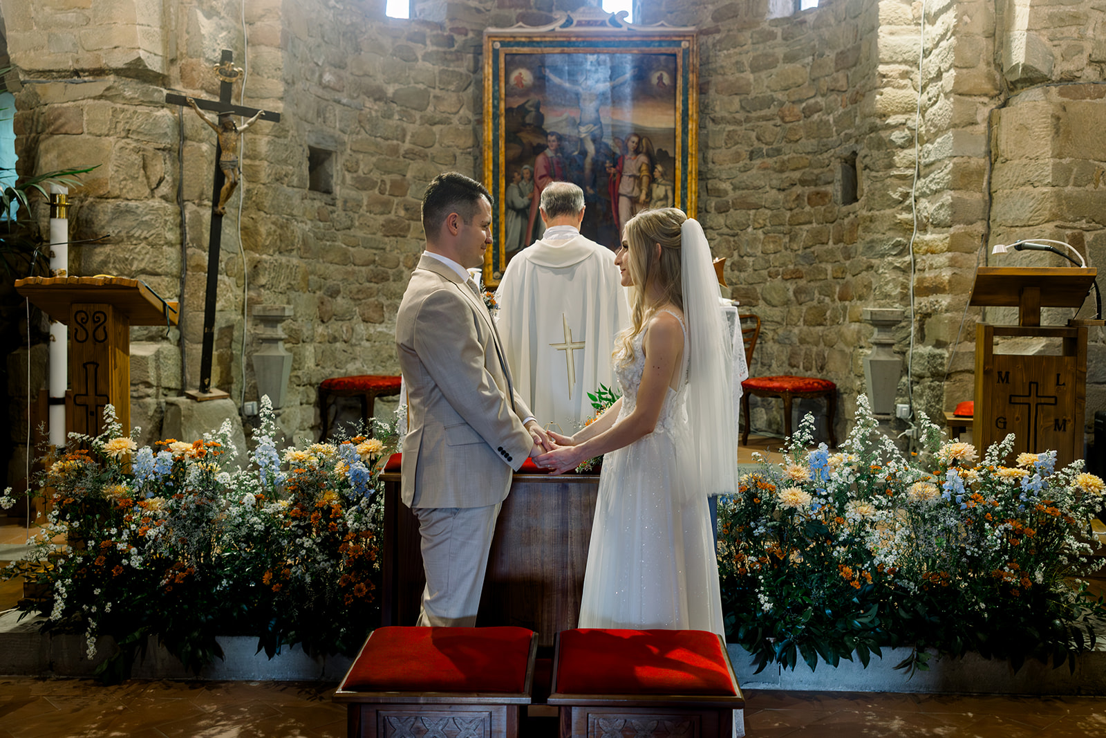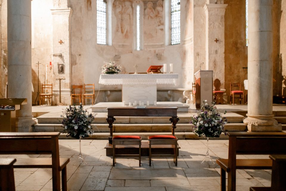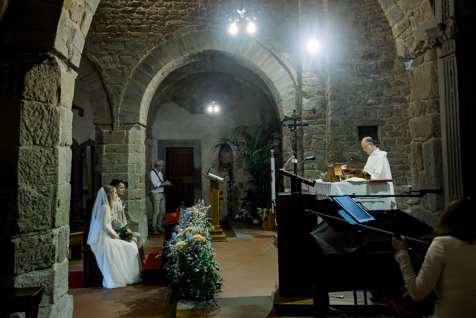 Ślub w pięknym, kamiennym budynku dawnego kościoła, z otwartym dachem.