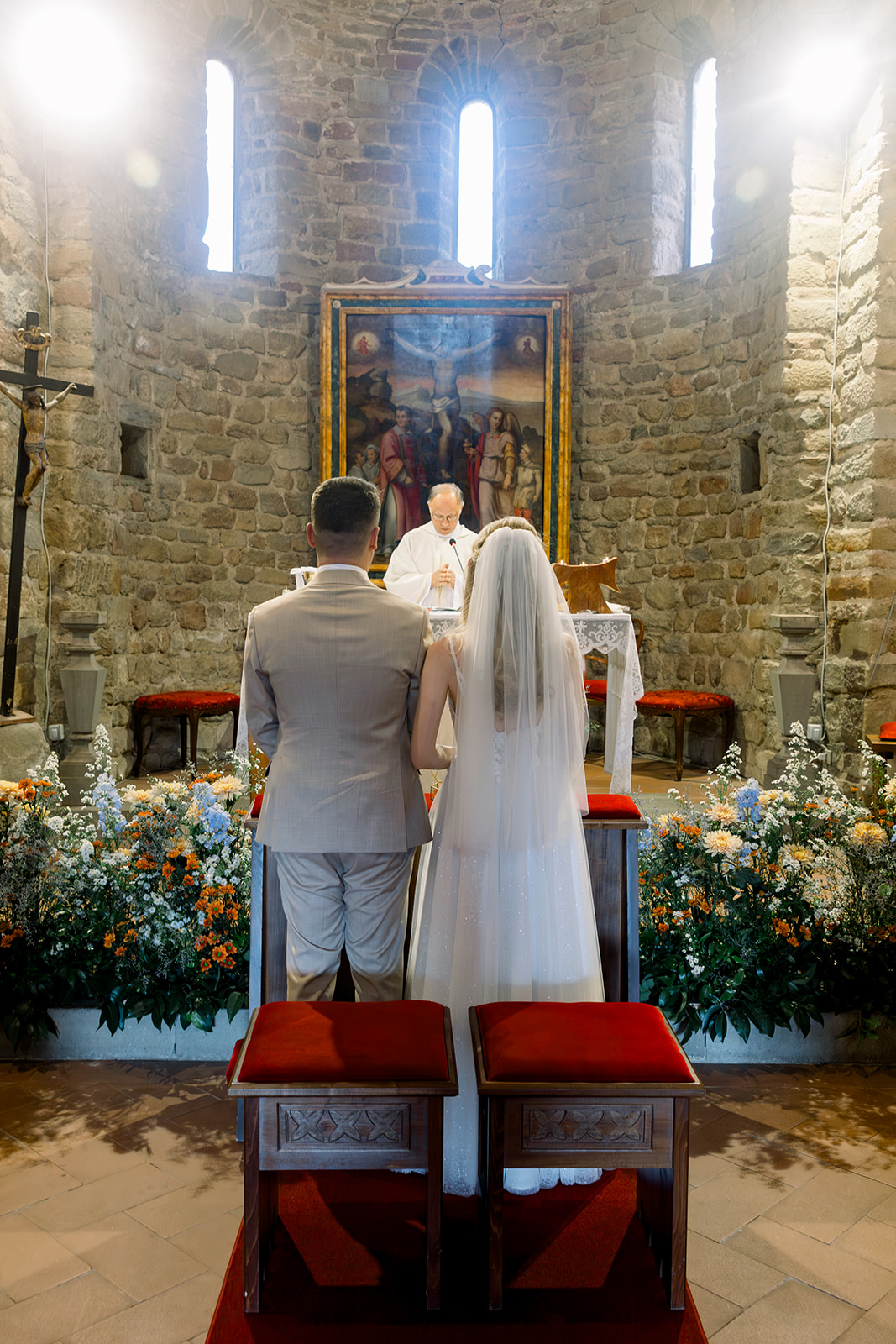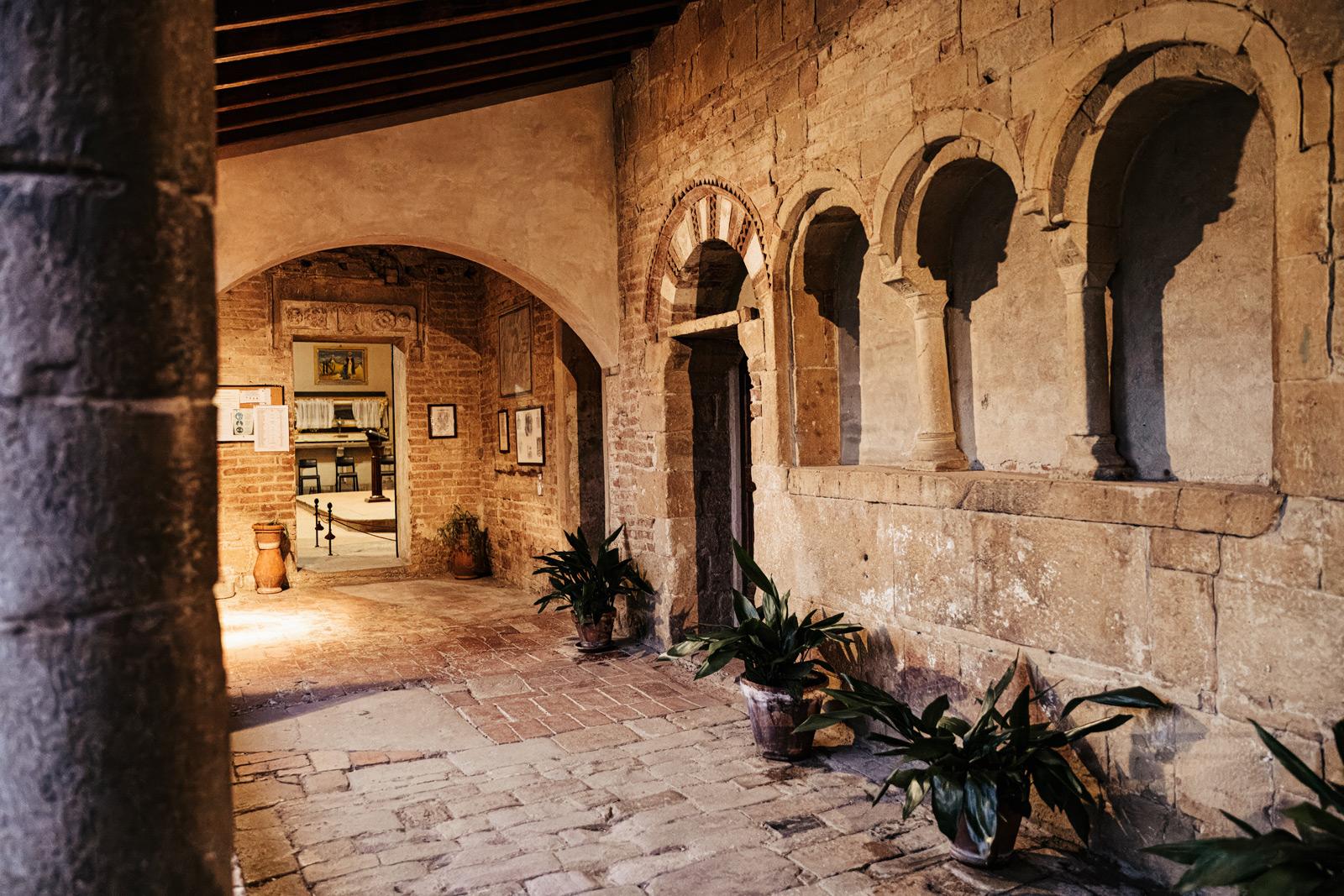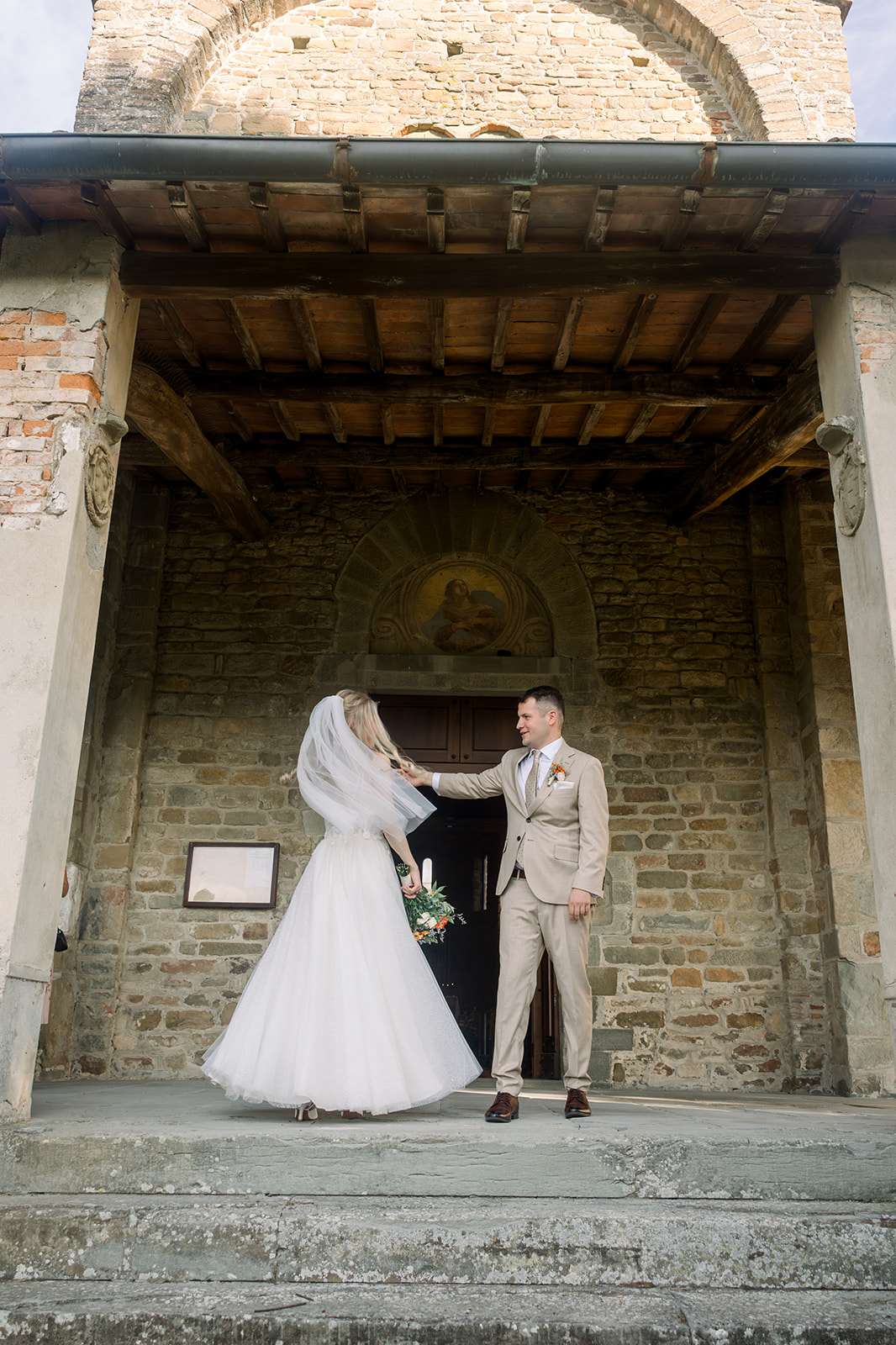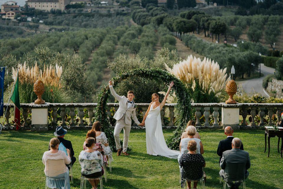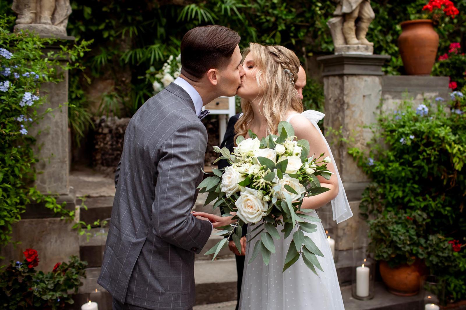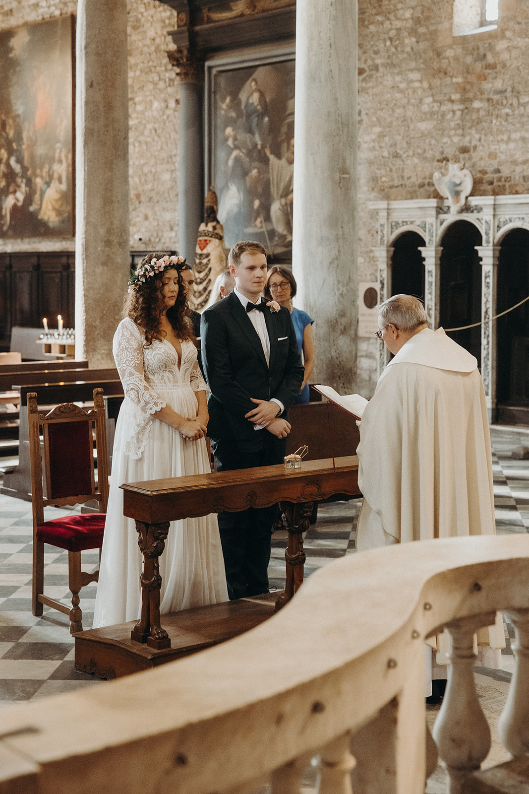 Ślub w pięknym, kamiennym budynku dawnego kościoła, z otwartym dachem.