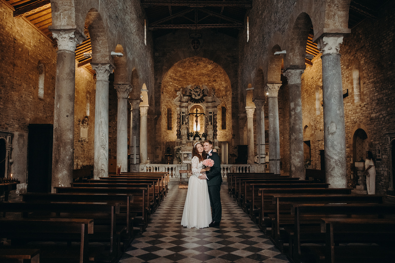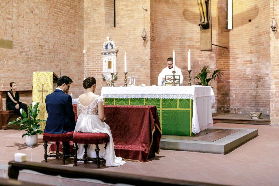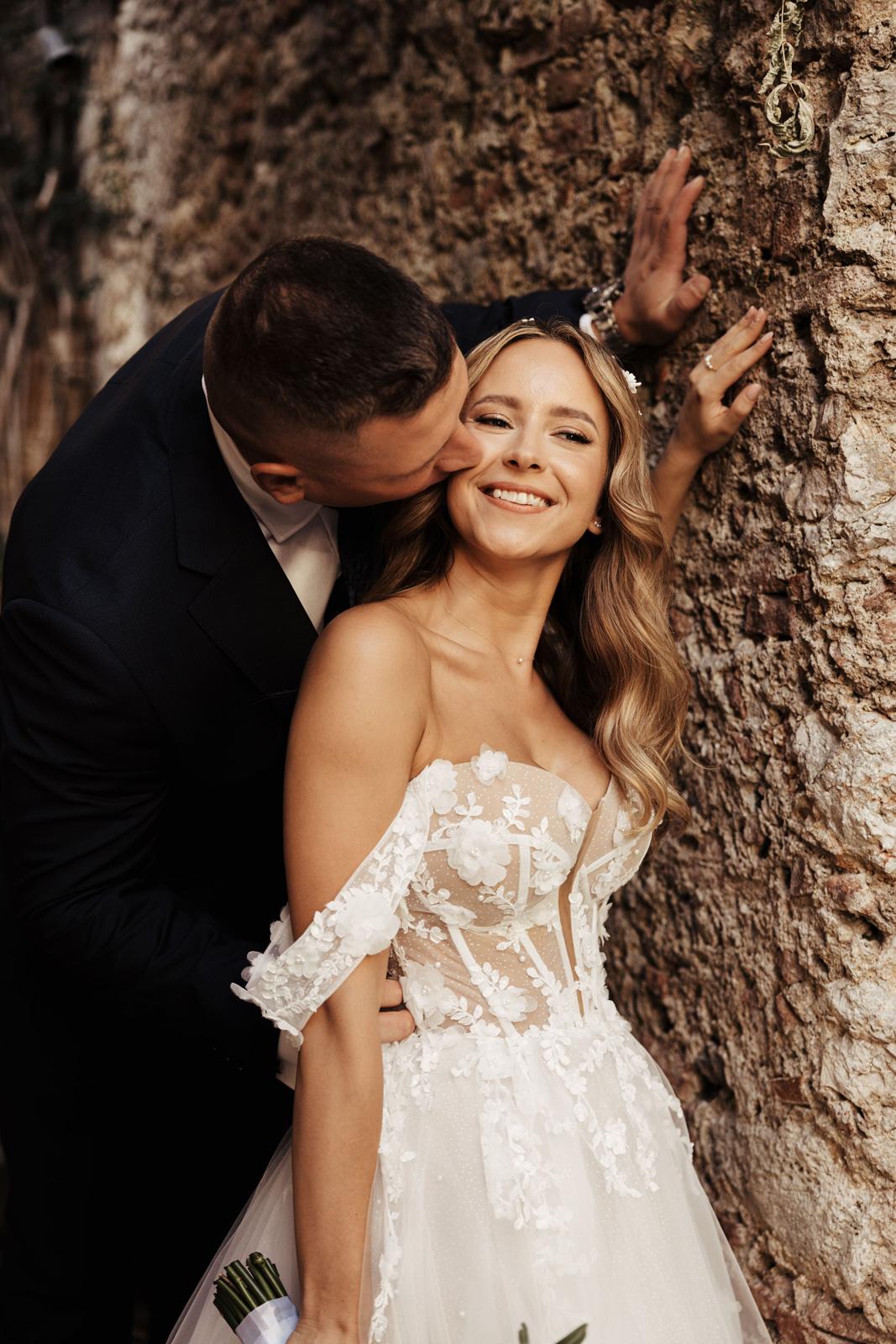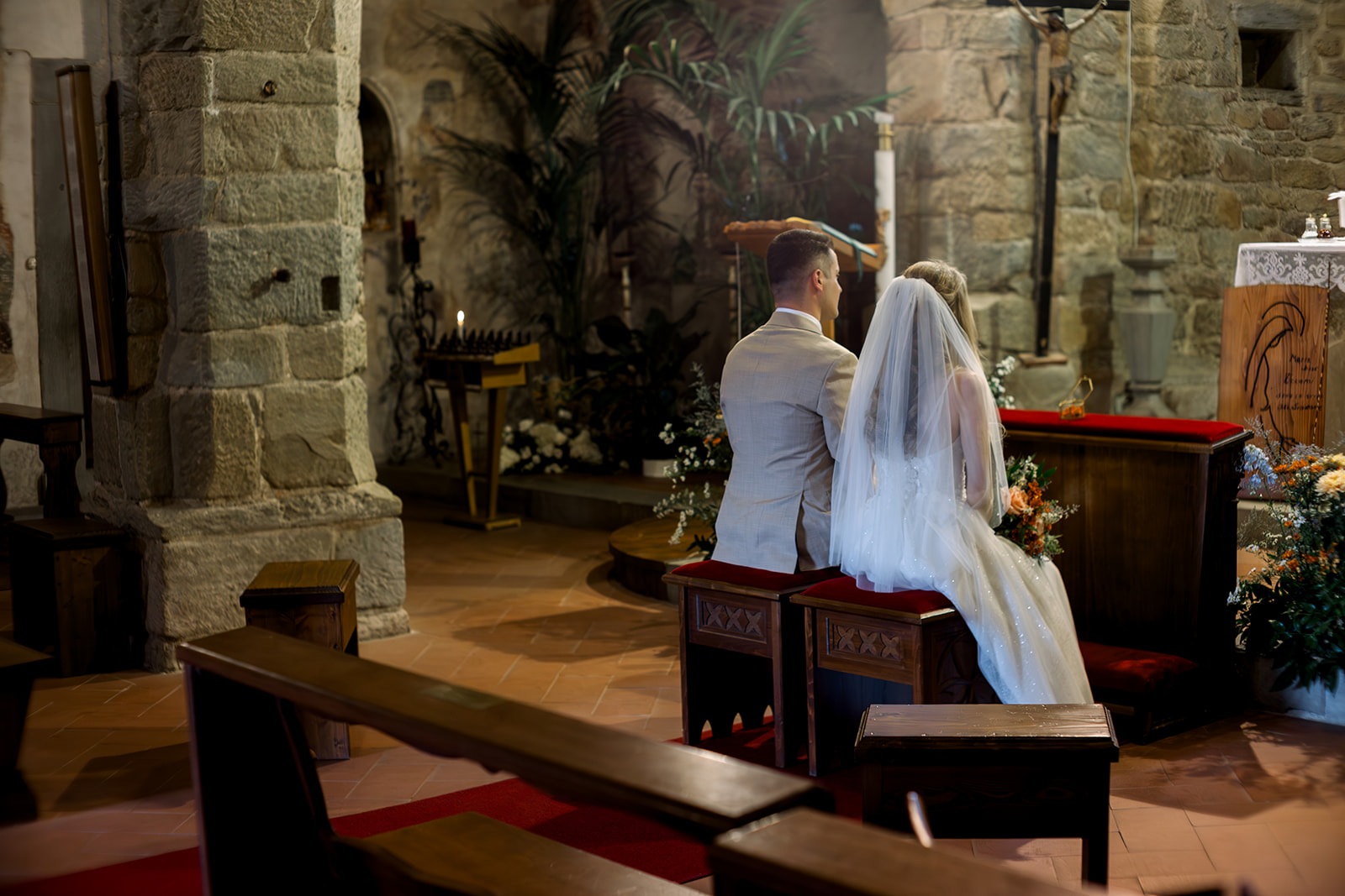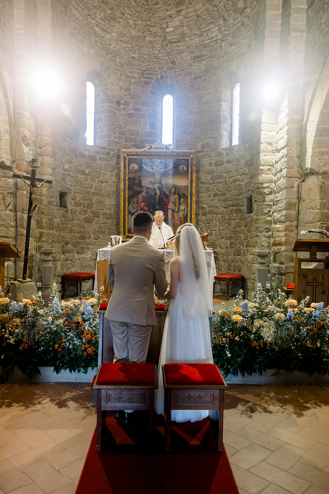 Ślub w pięknym, kamiennym budynku dawnego kościoła, z otwartym dachem.