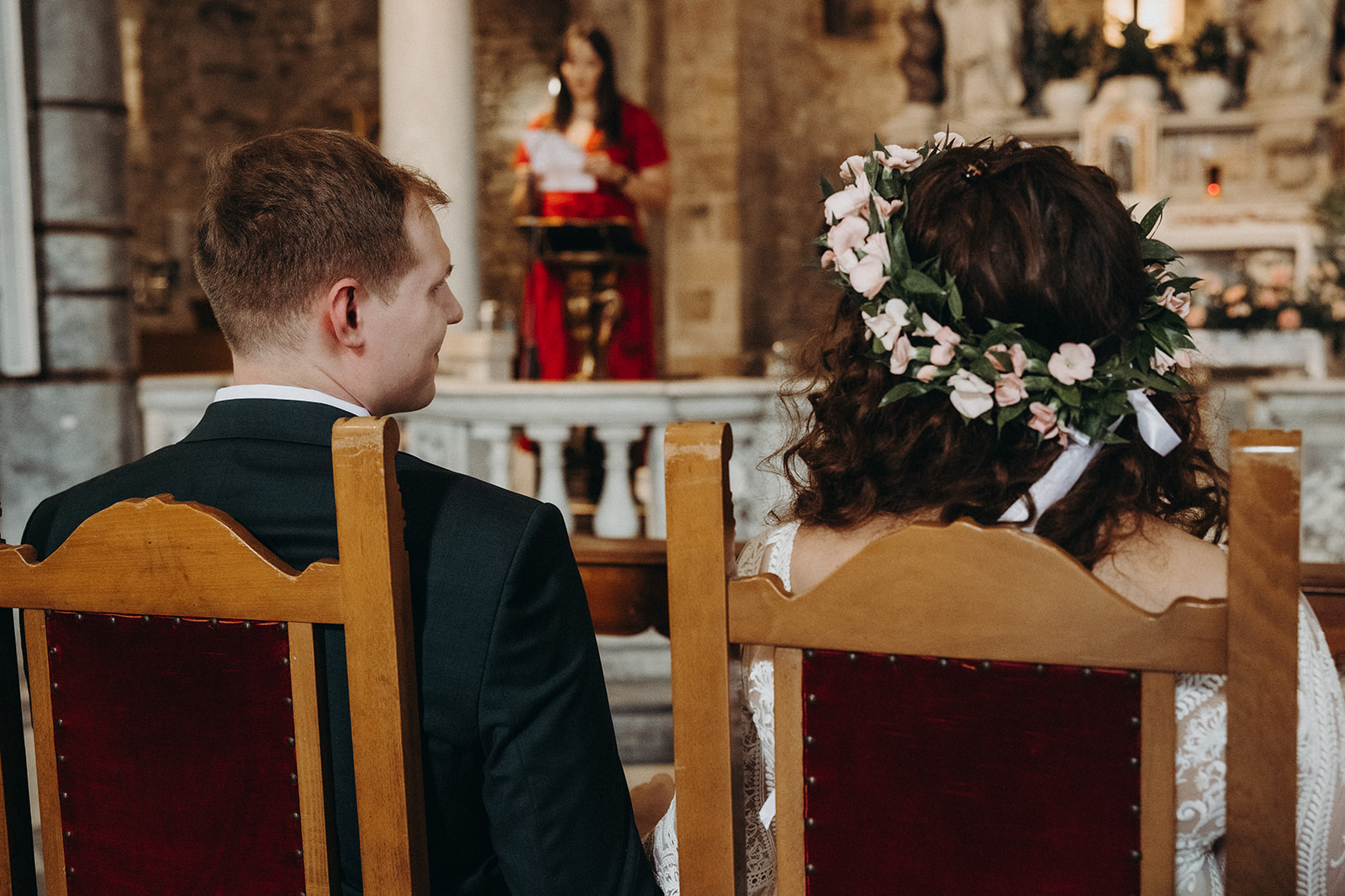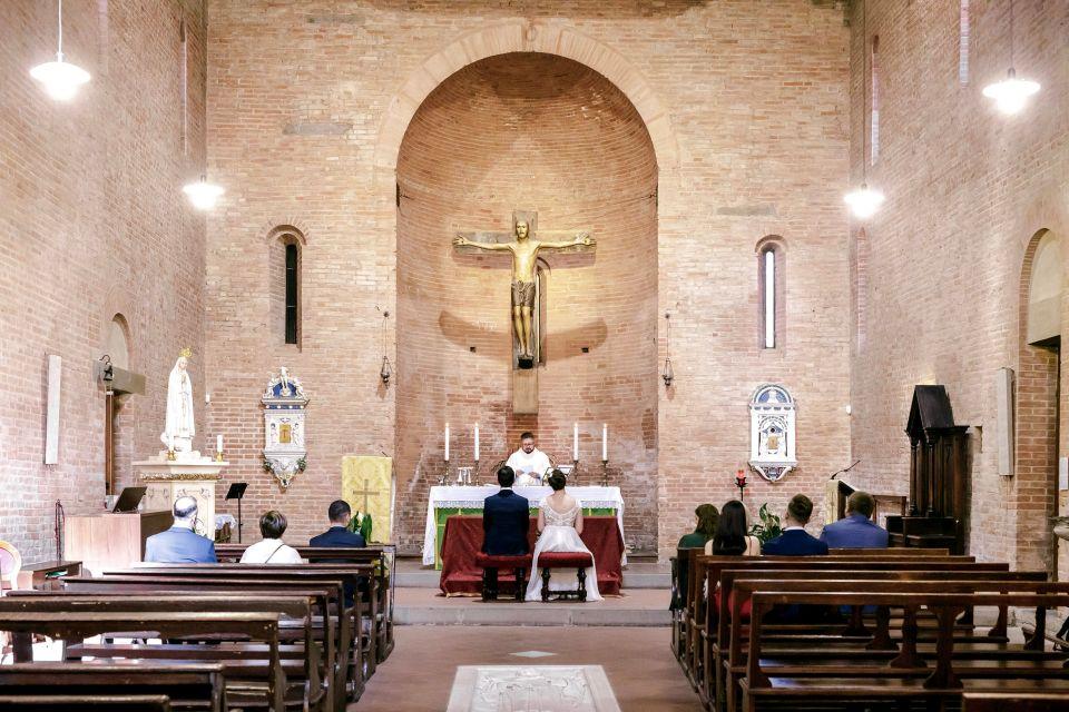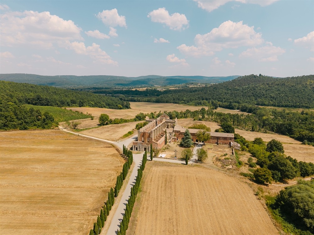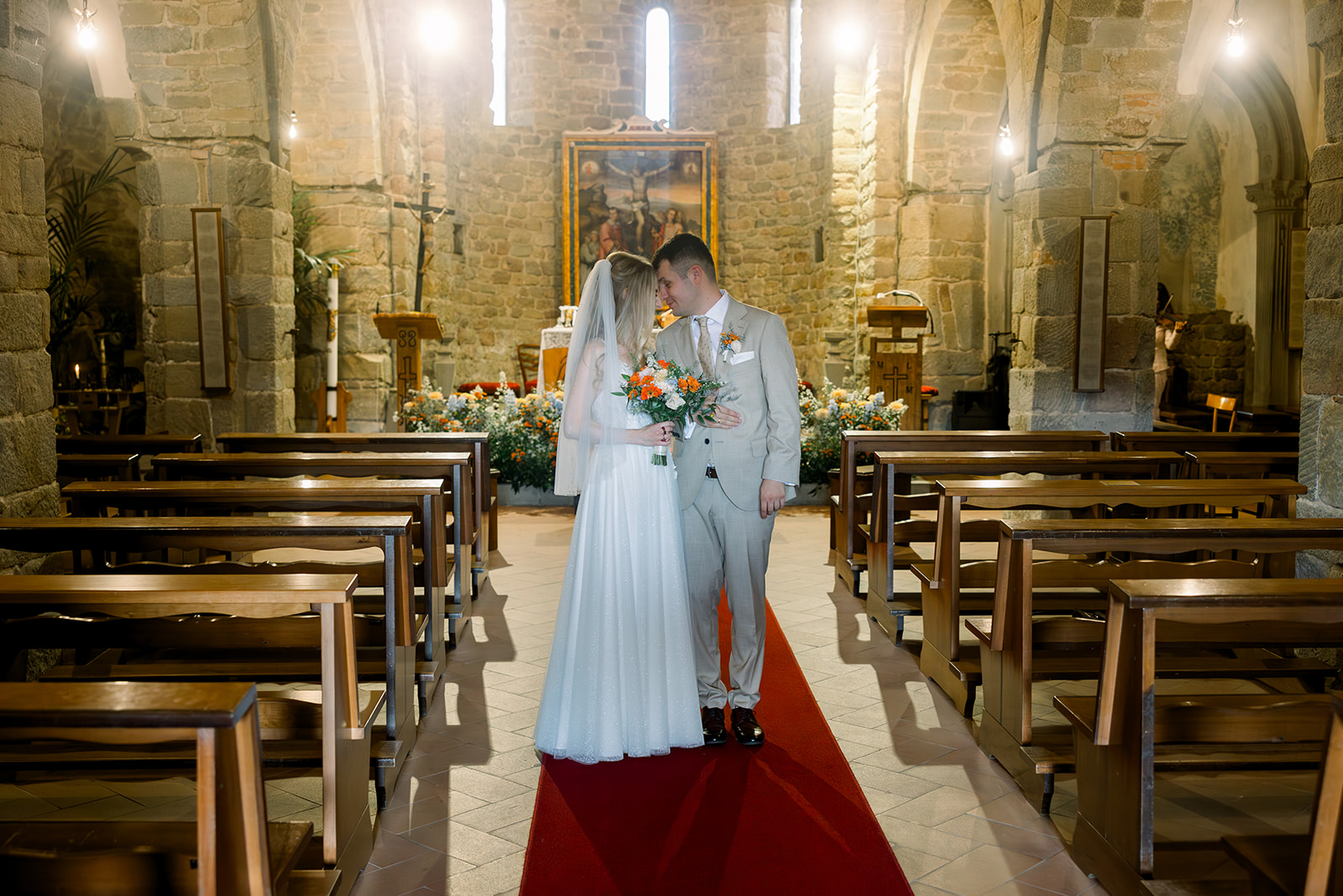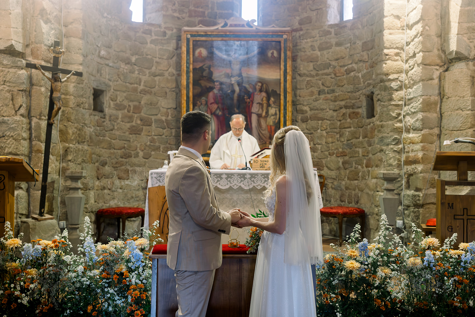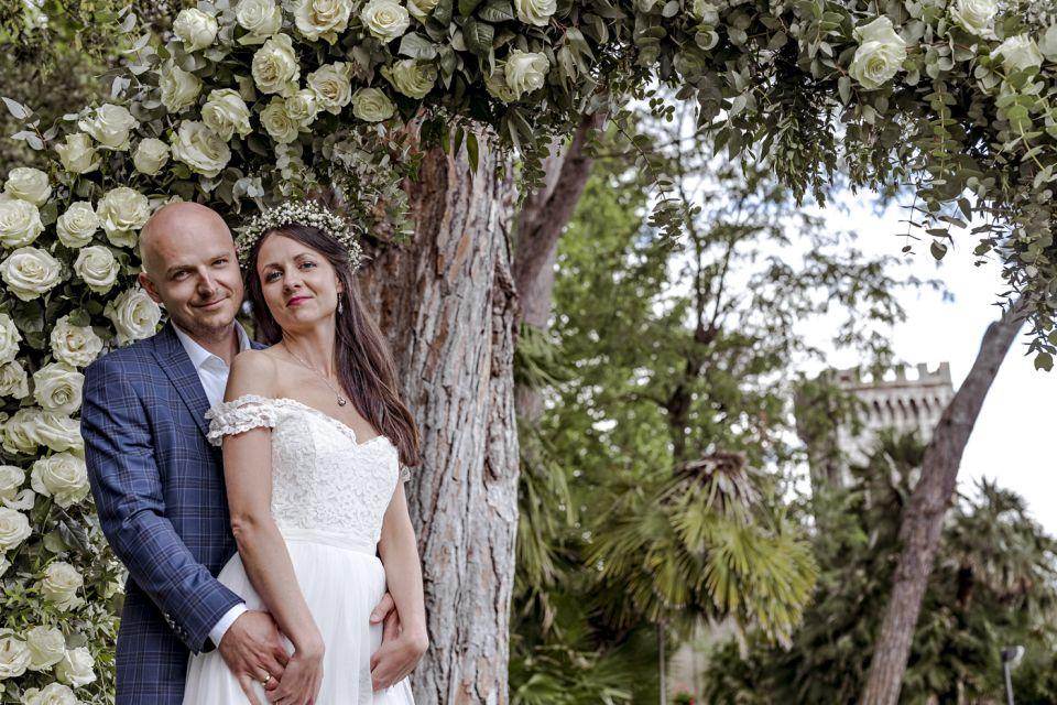 Ślub w pięknym, kamiennym budynku dawnego kościoła, z otwartym dachem.
