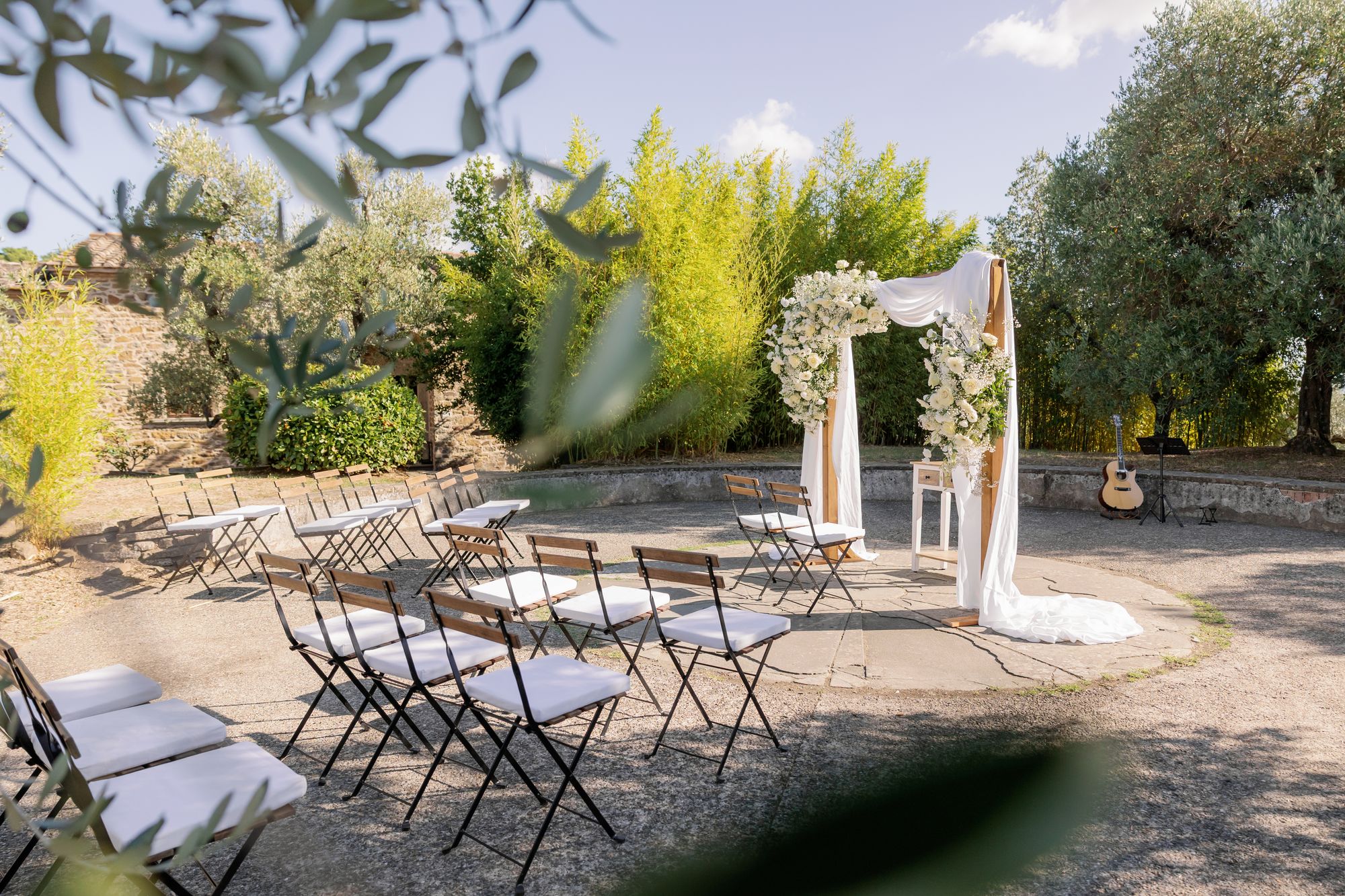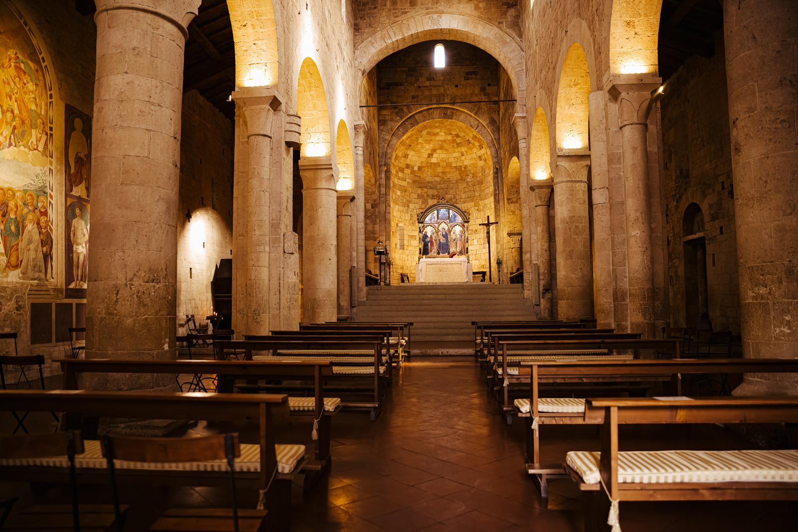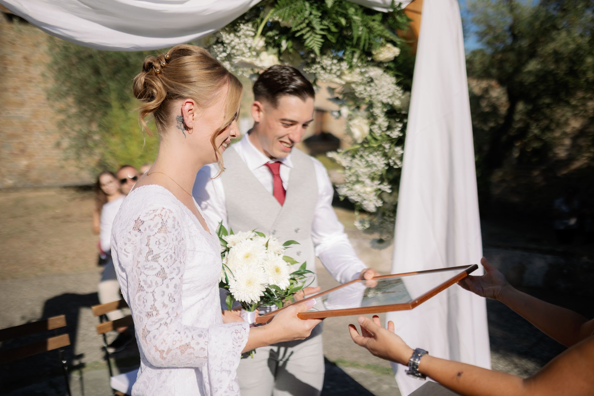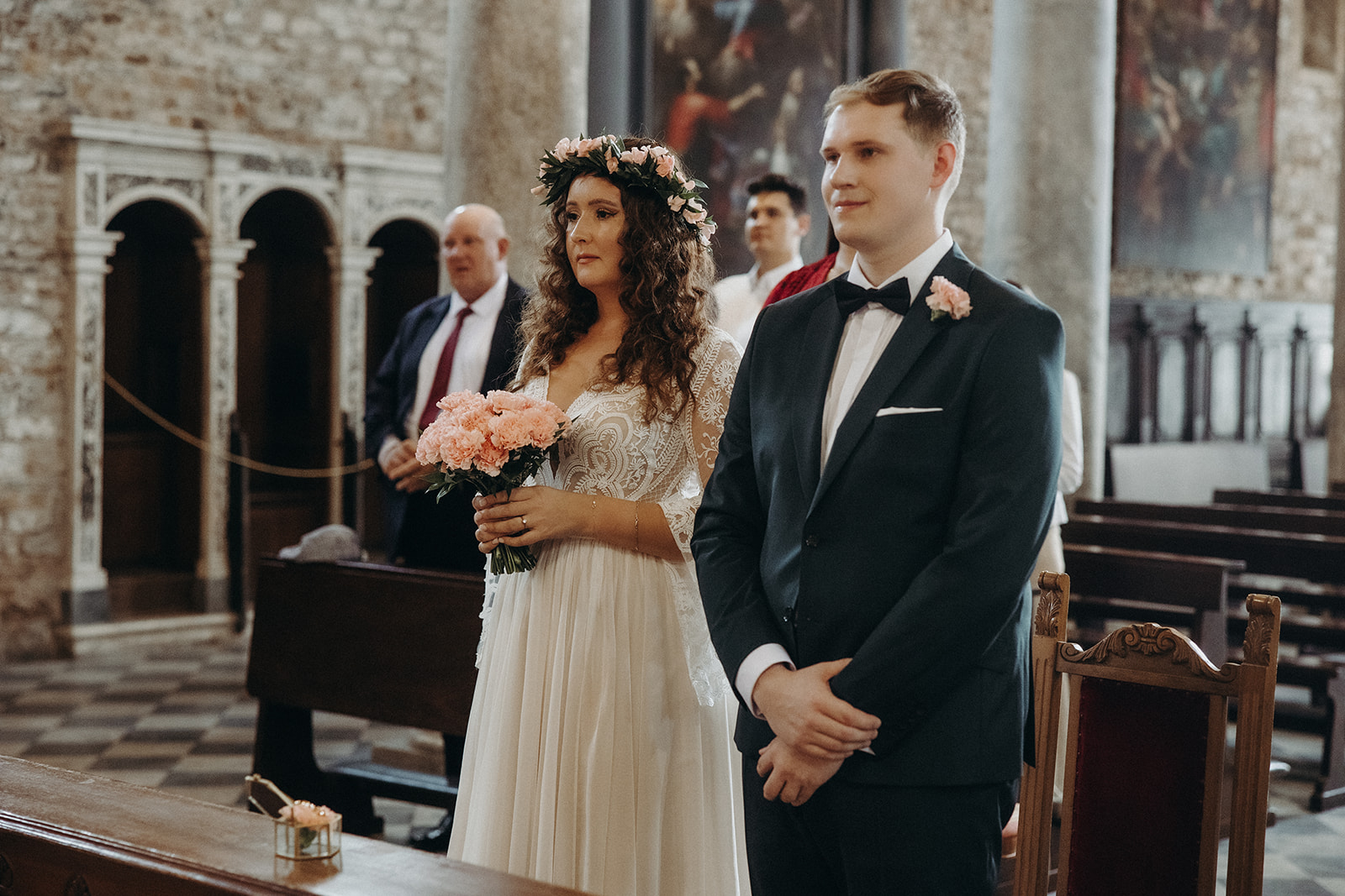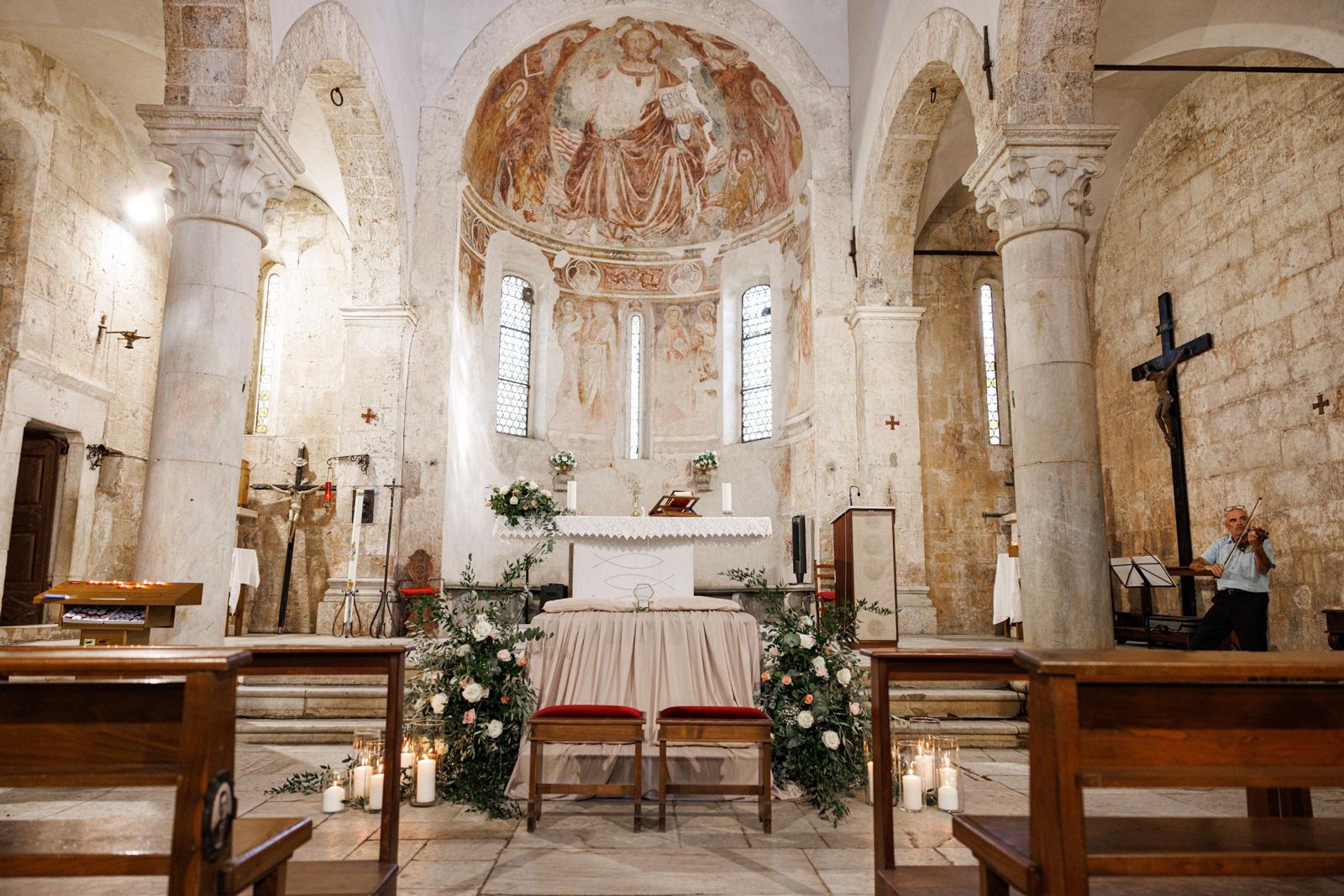 Ślub w pięknym, kamiennym budynku dawnego kościoła, z otwartym dachem.