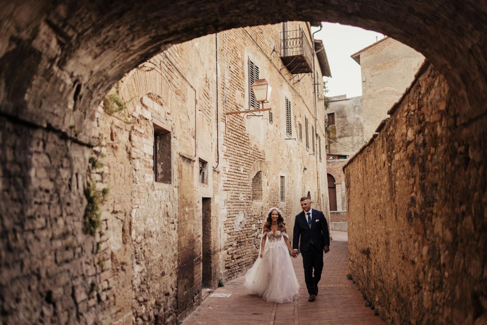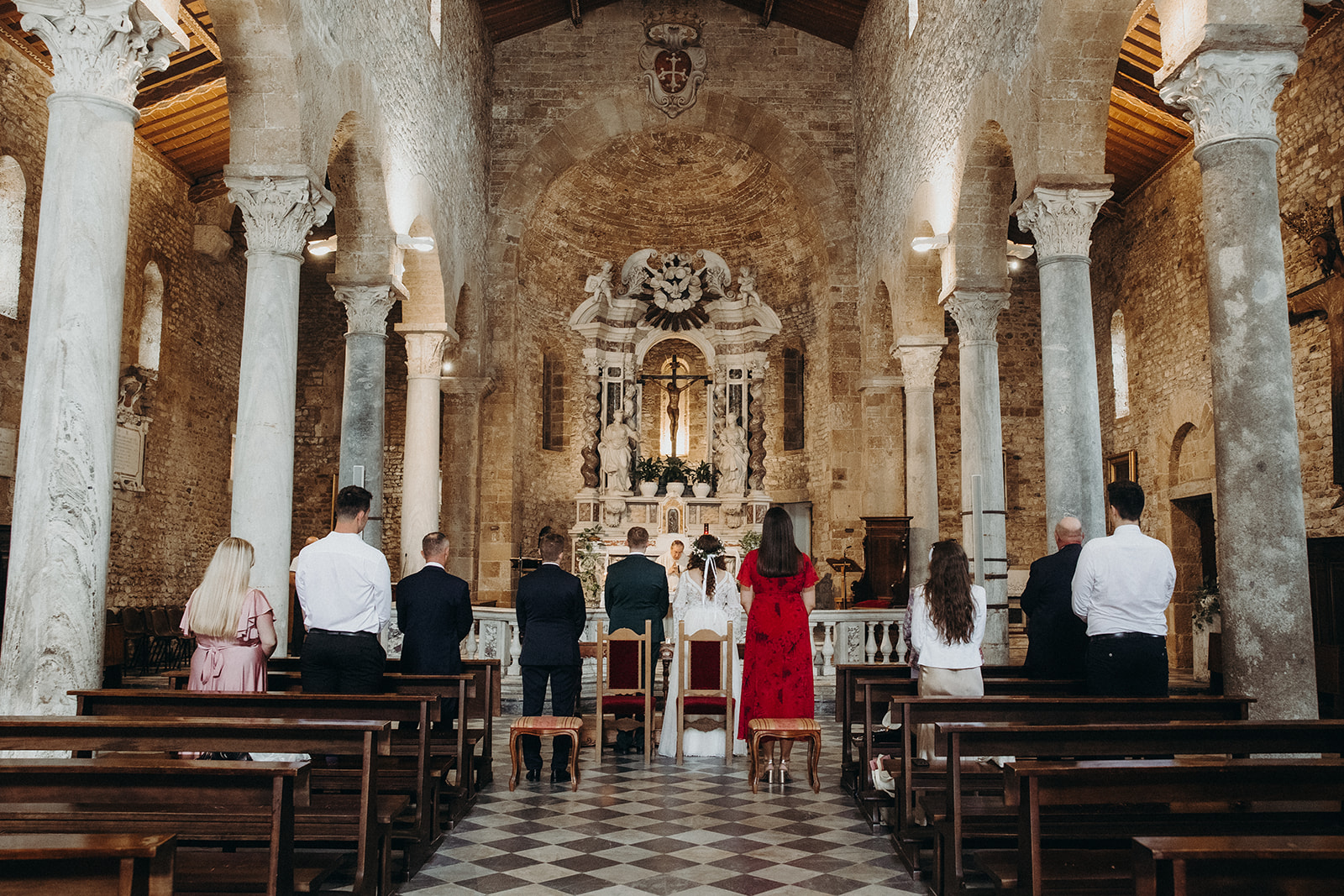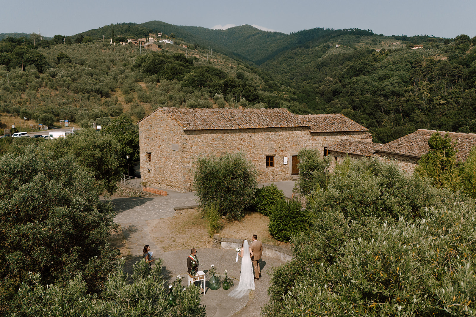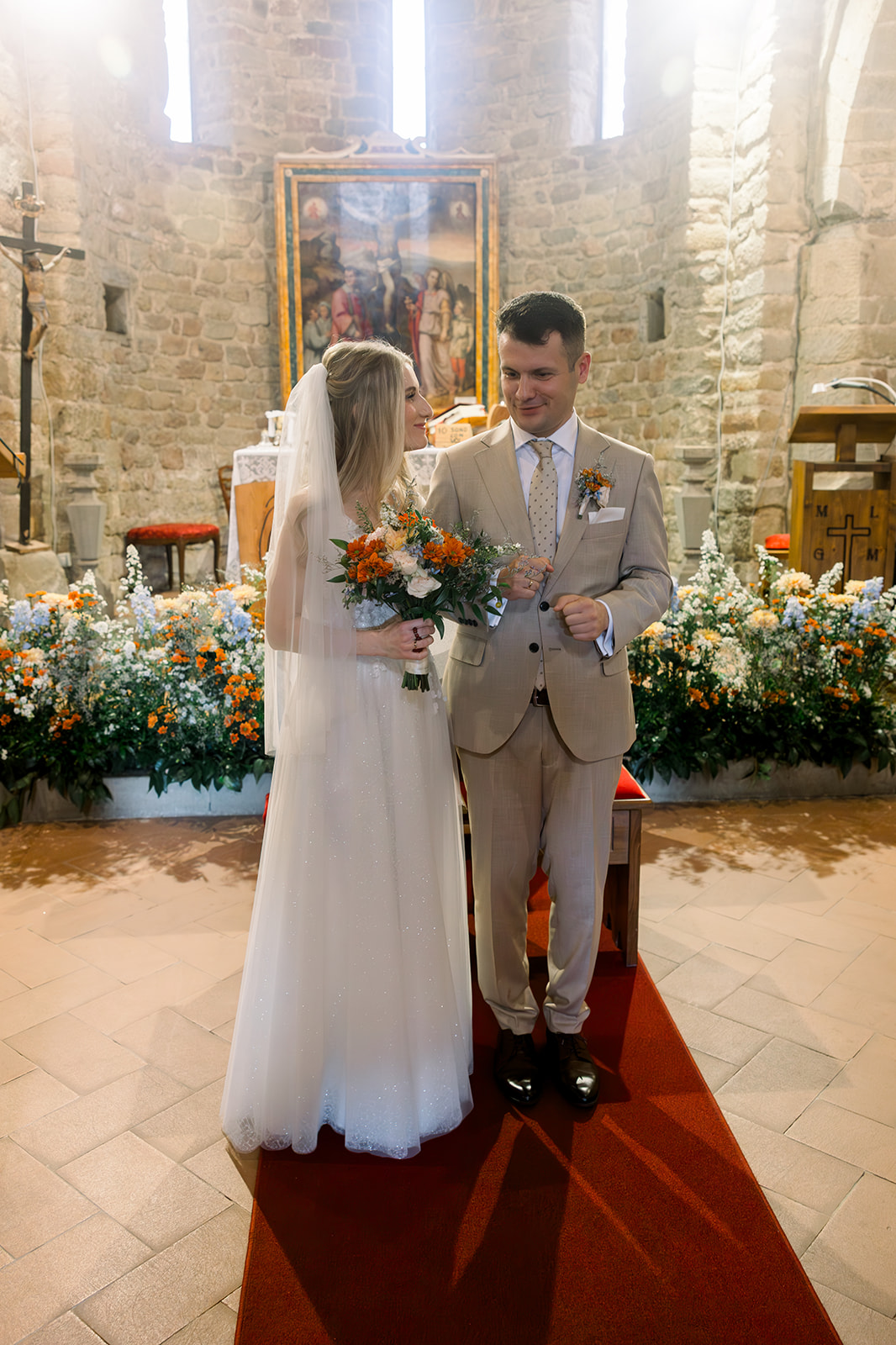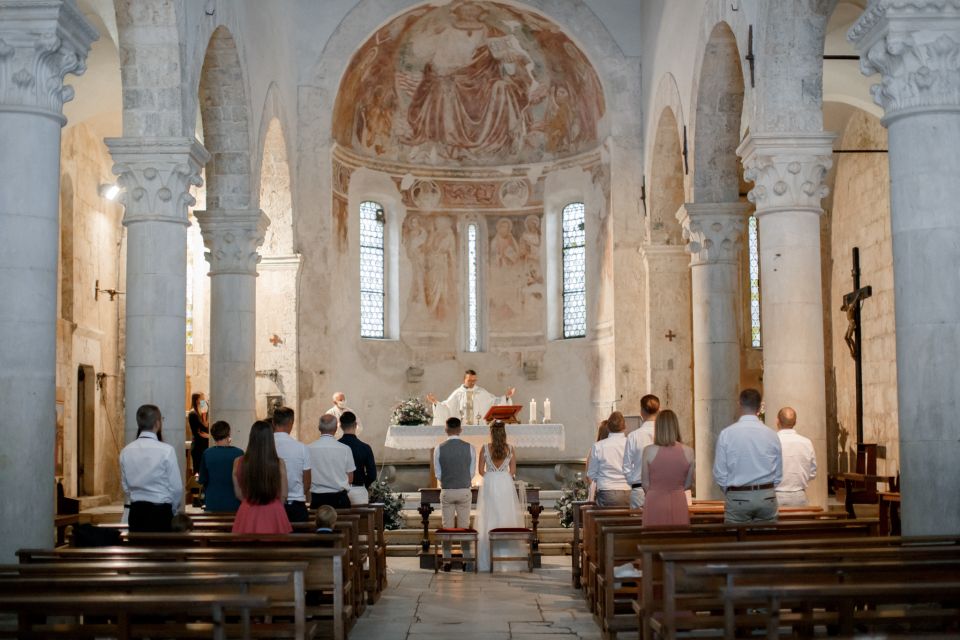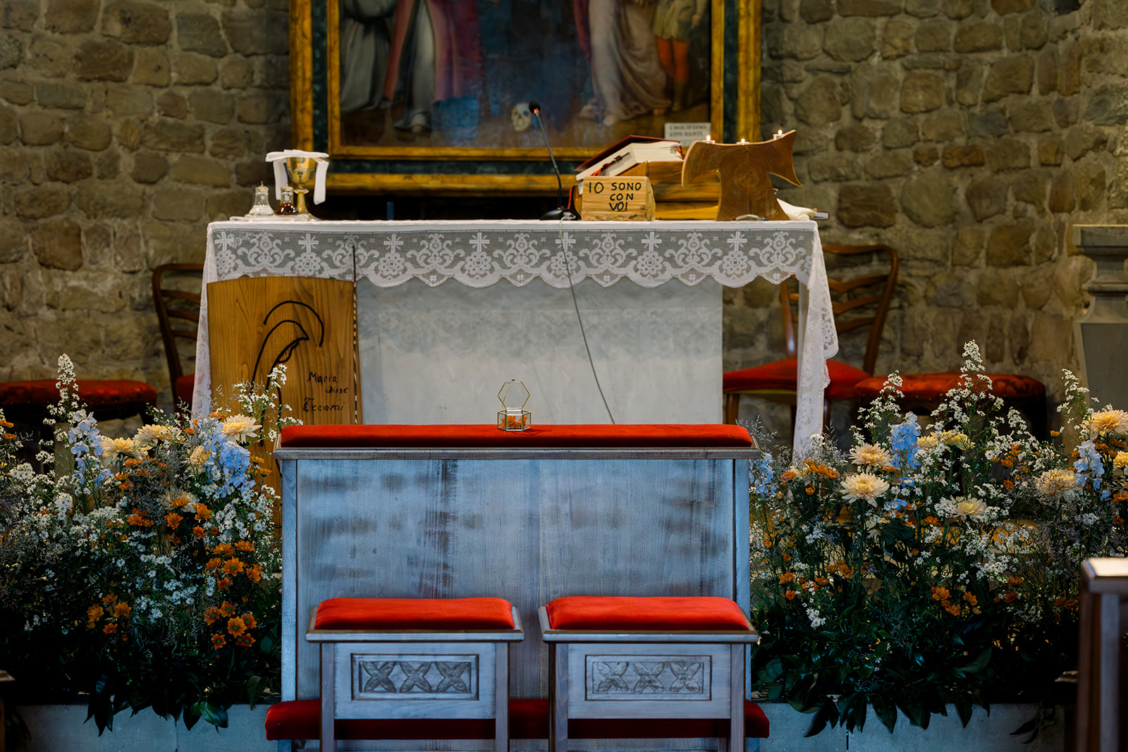 Ślub w pięknym, kamiennym budynku dawnego kościoła, z otwartym dachem.