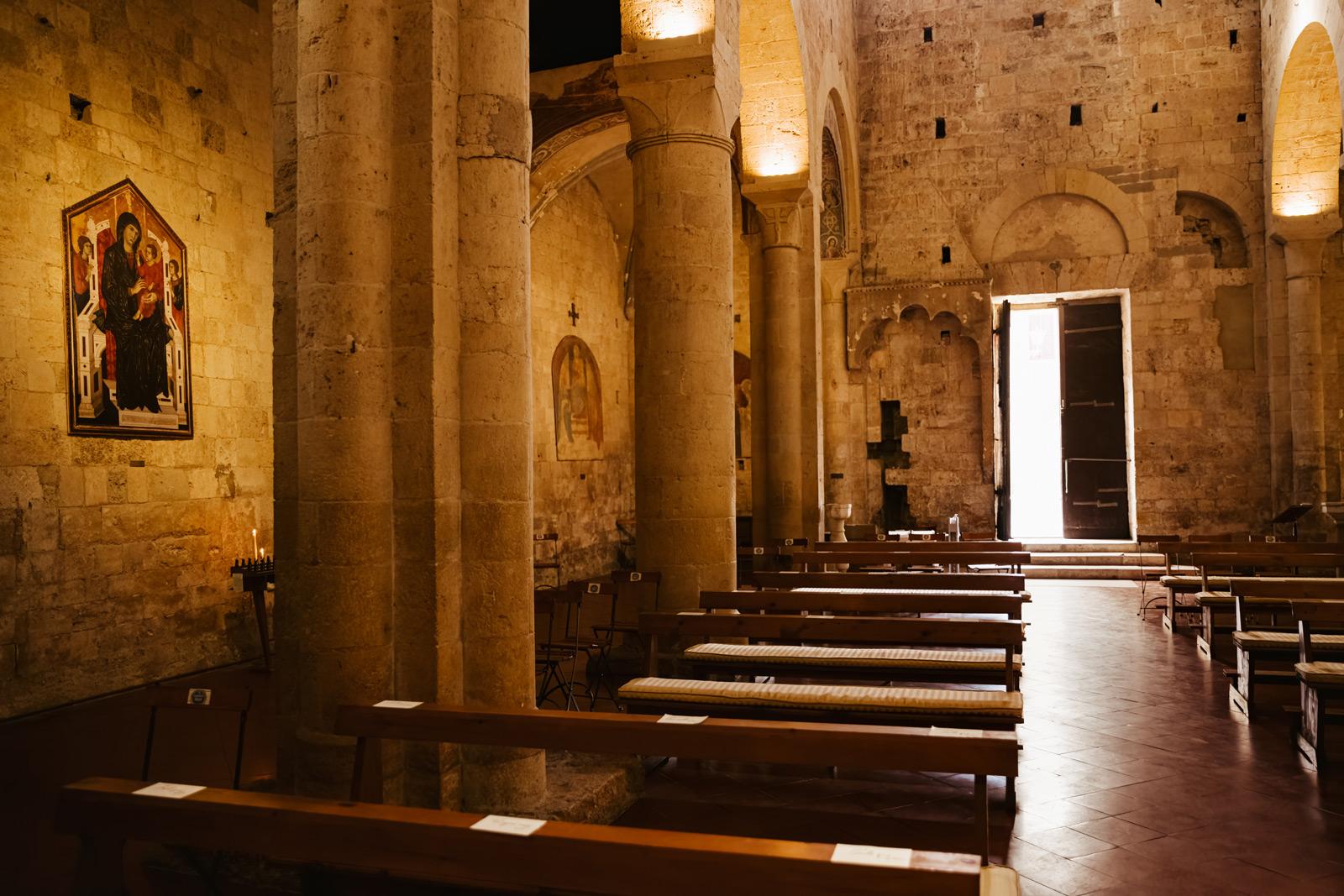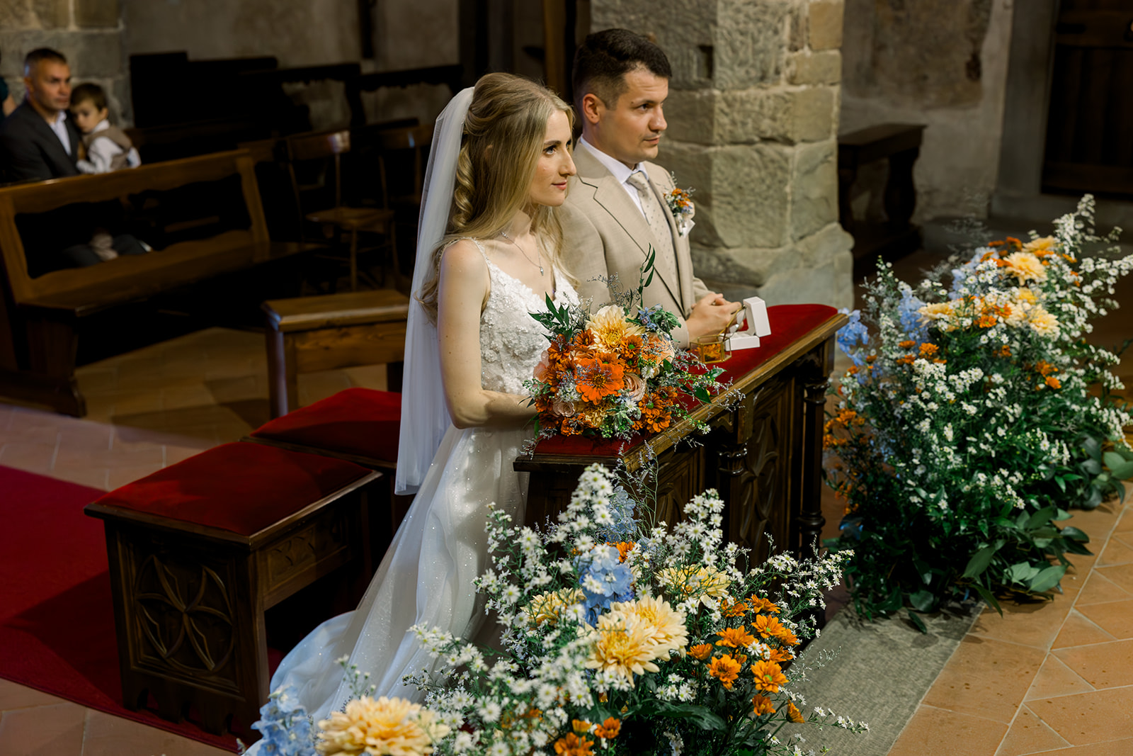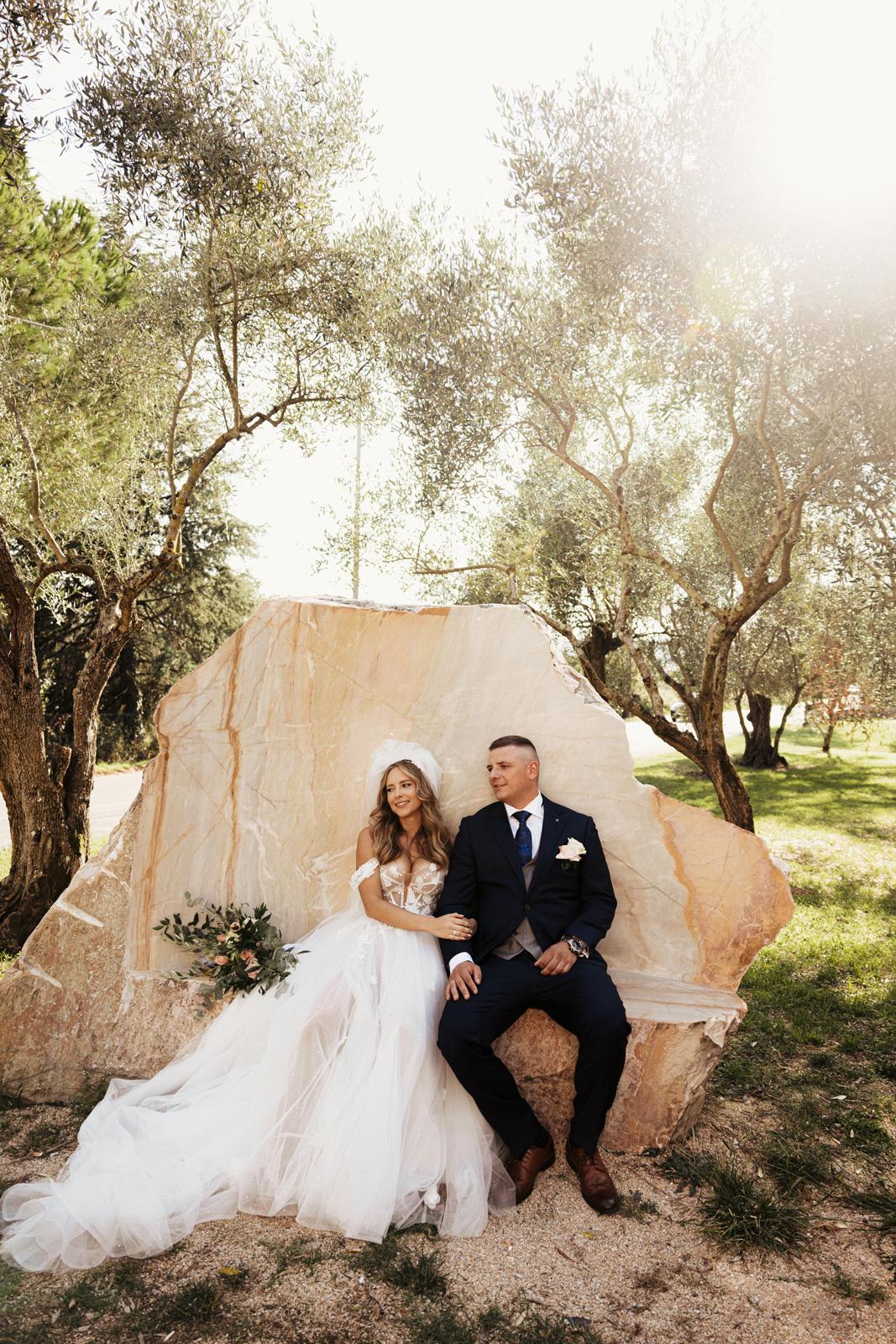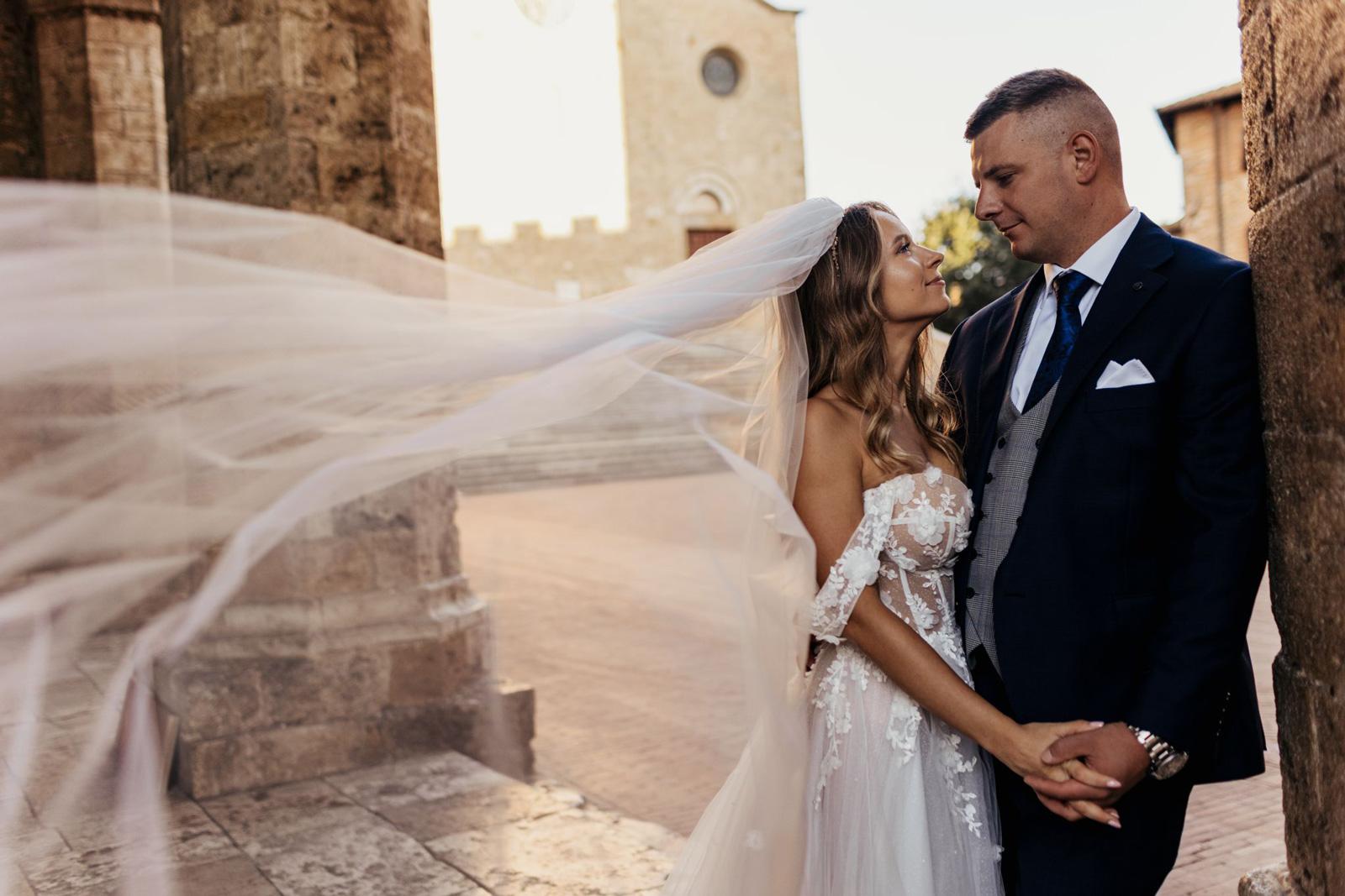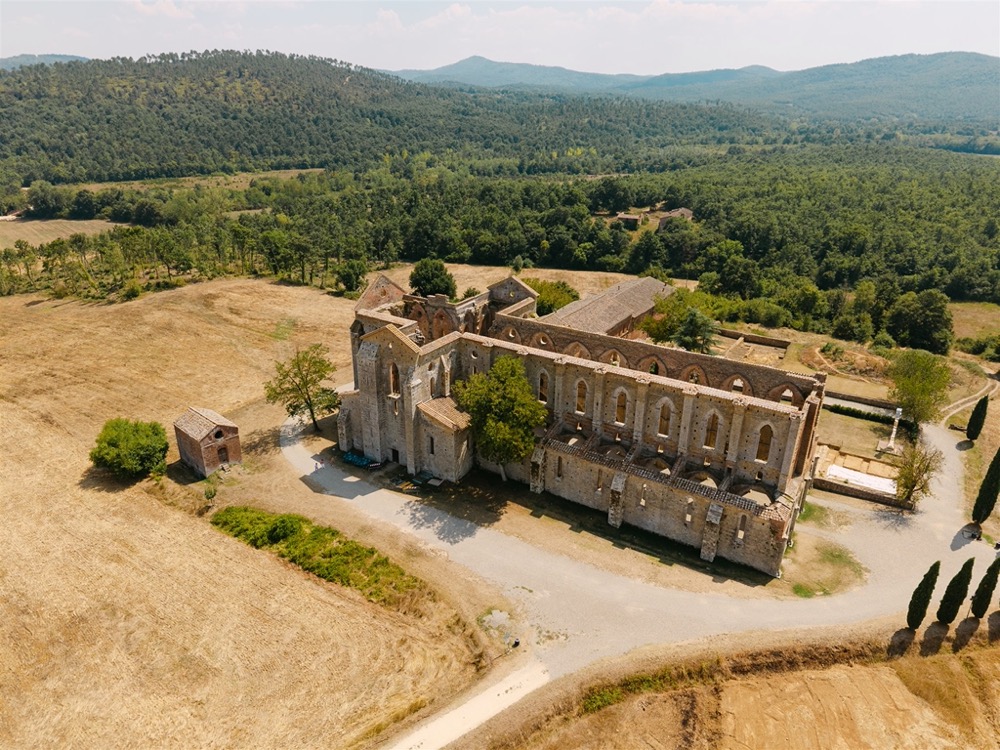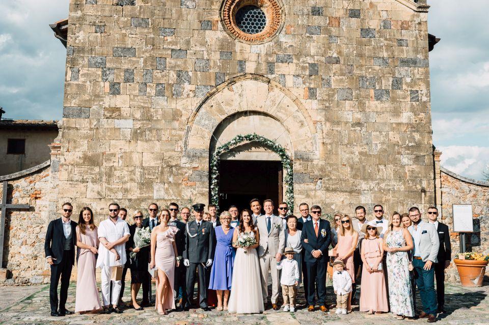 Ślub w pięknym, kamiennym budynku dawnego kościoła, z otwartym dachem.