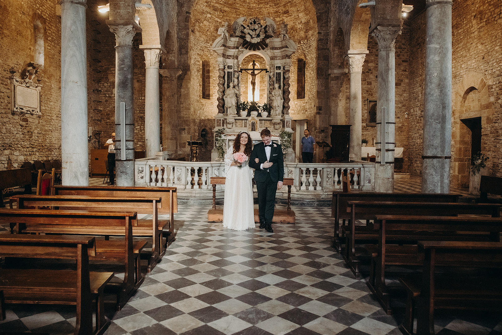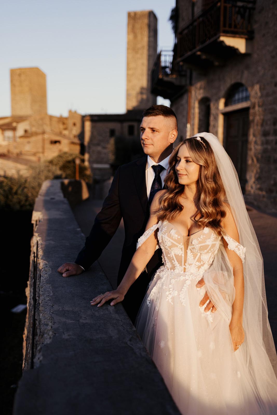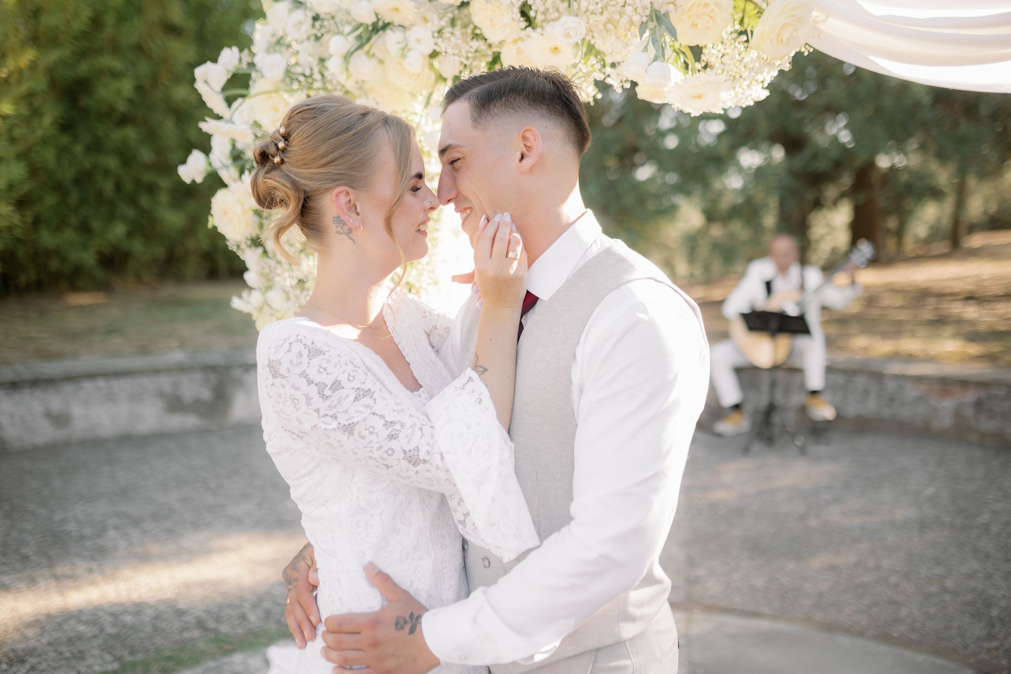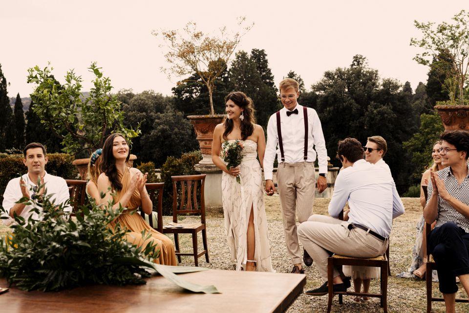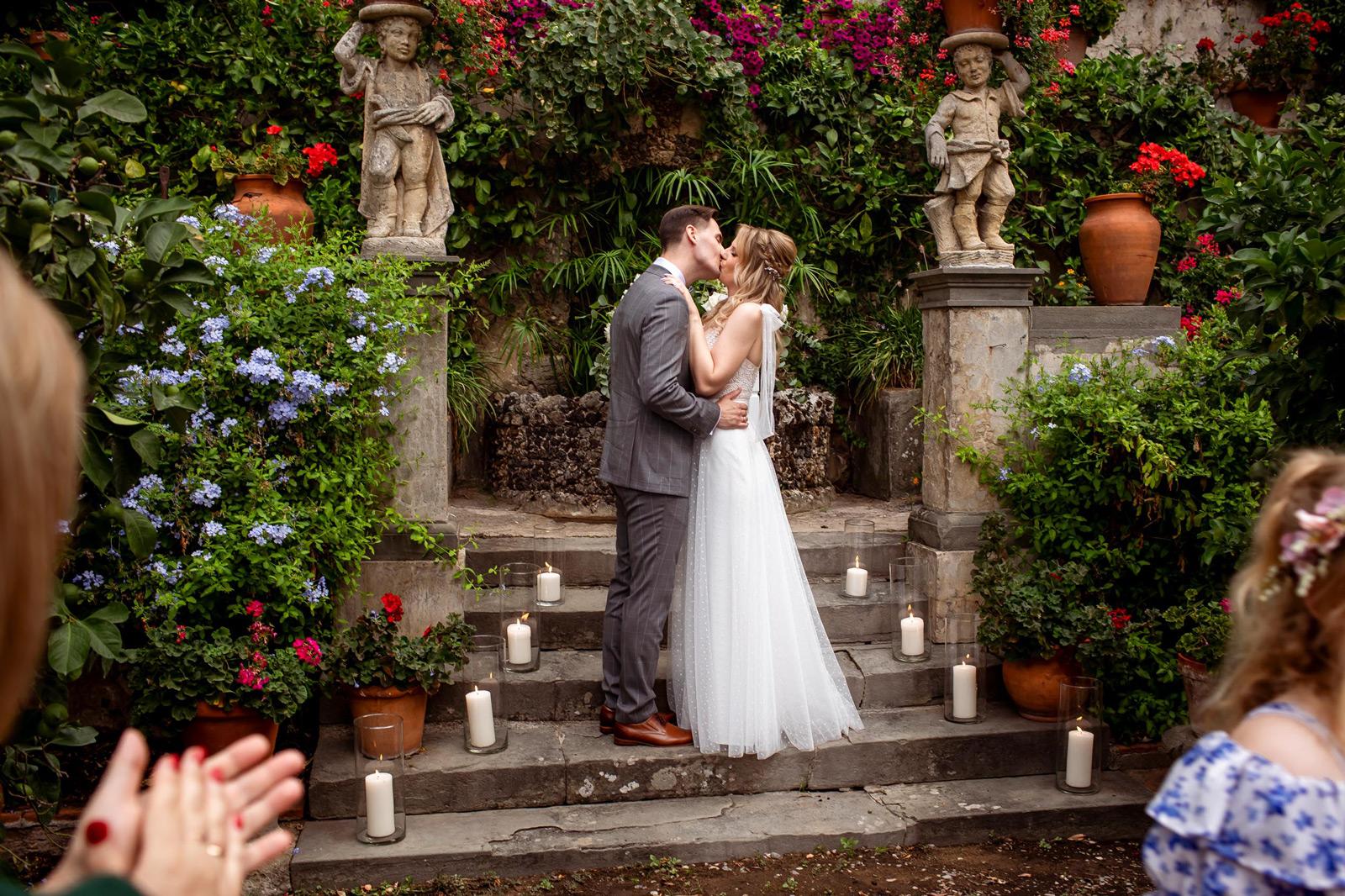 Ślub w pięknym, kamiennym budynku dawnego kościoła, z otwartym dachem.