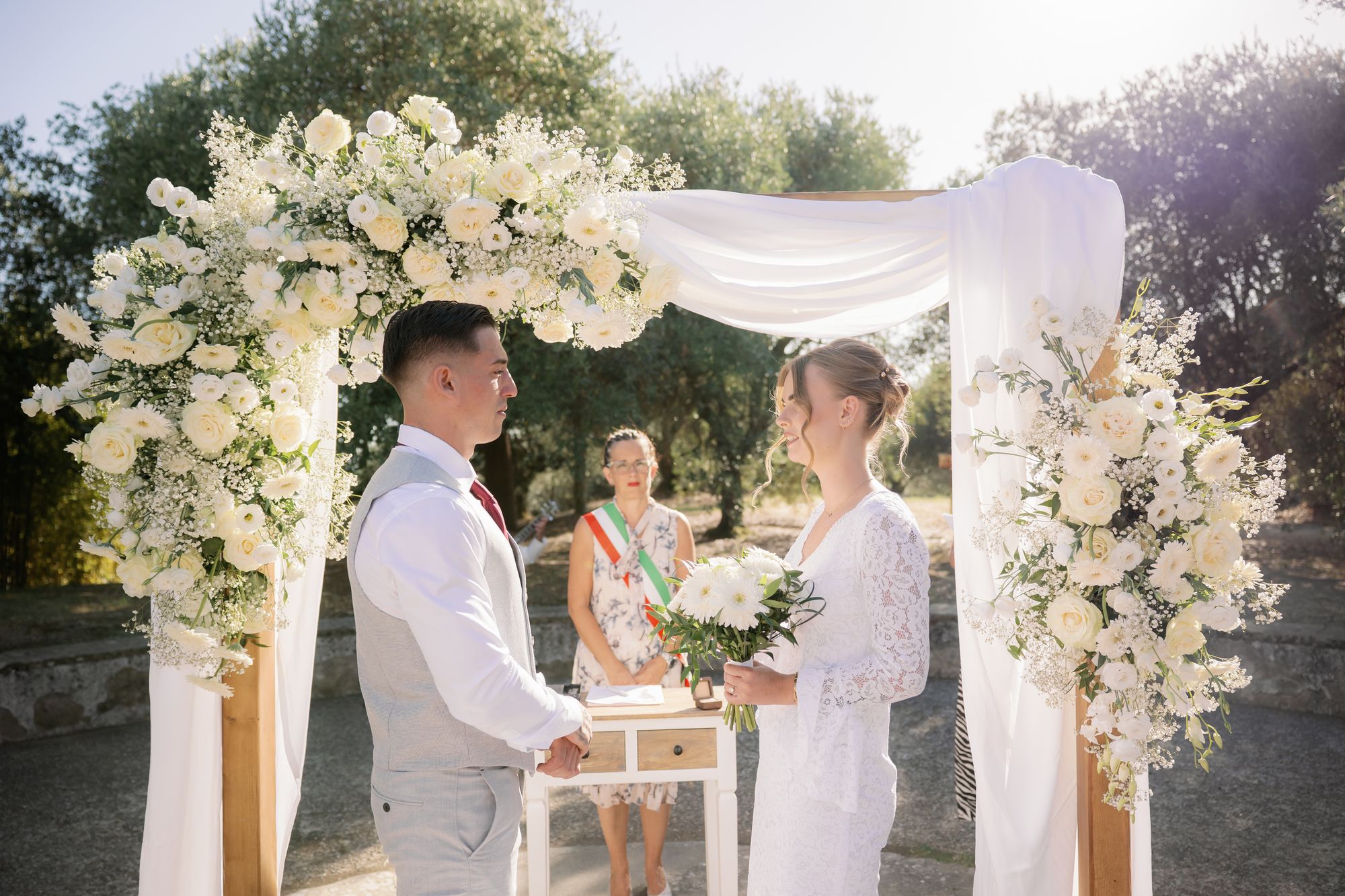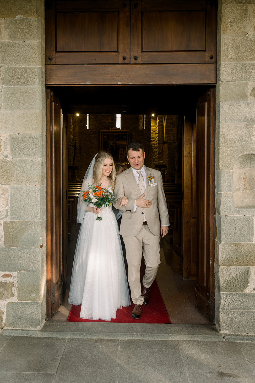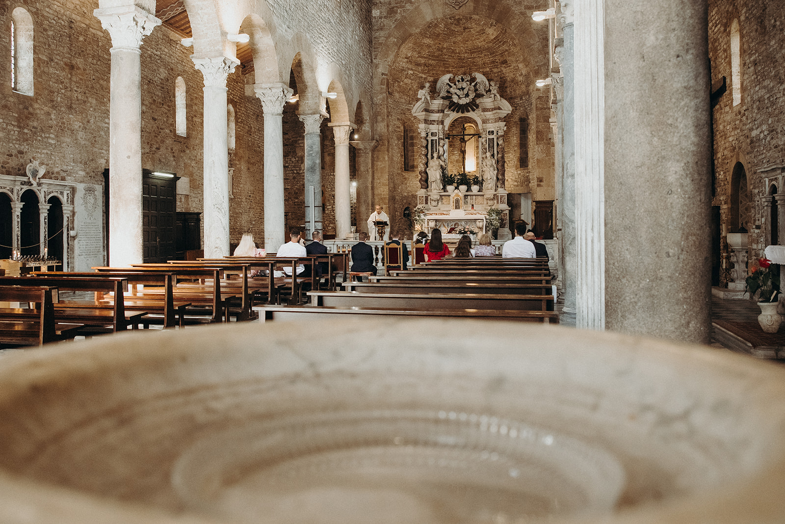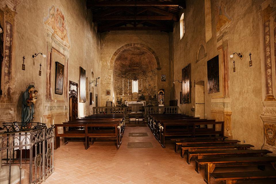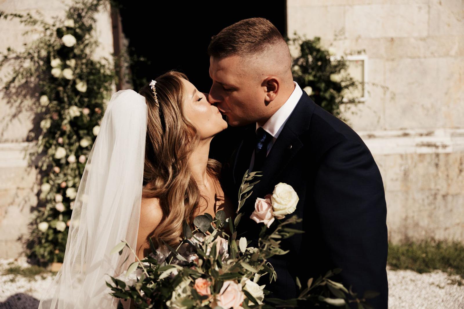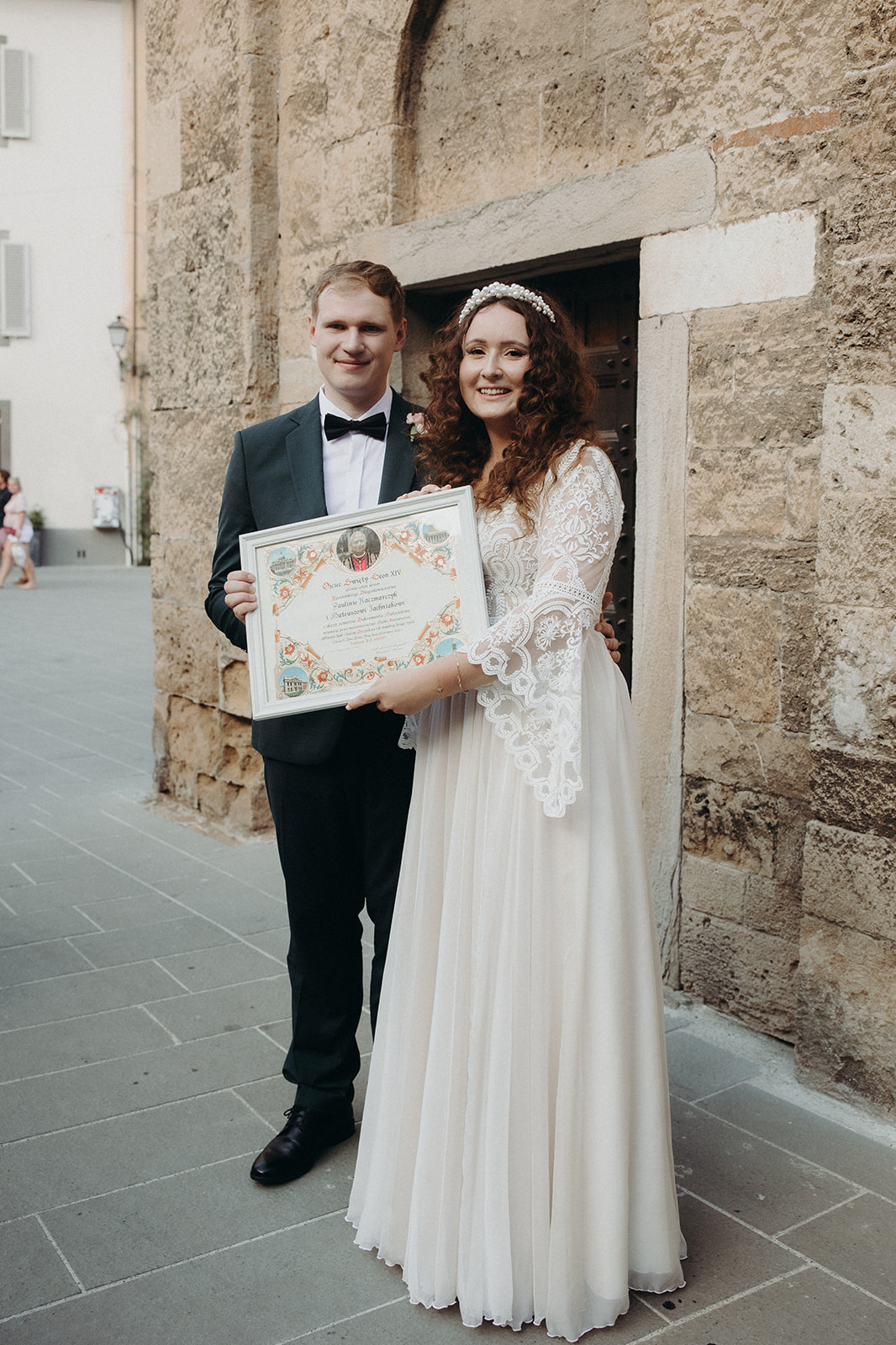 Ślub w pięknym, kamiennym budynku dawnego kościoła, z otwartym dachem.