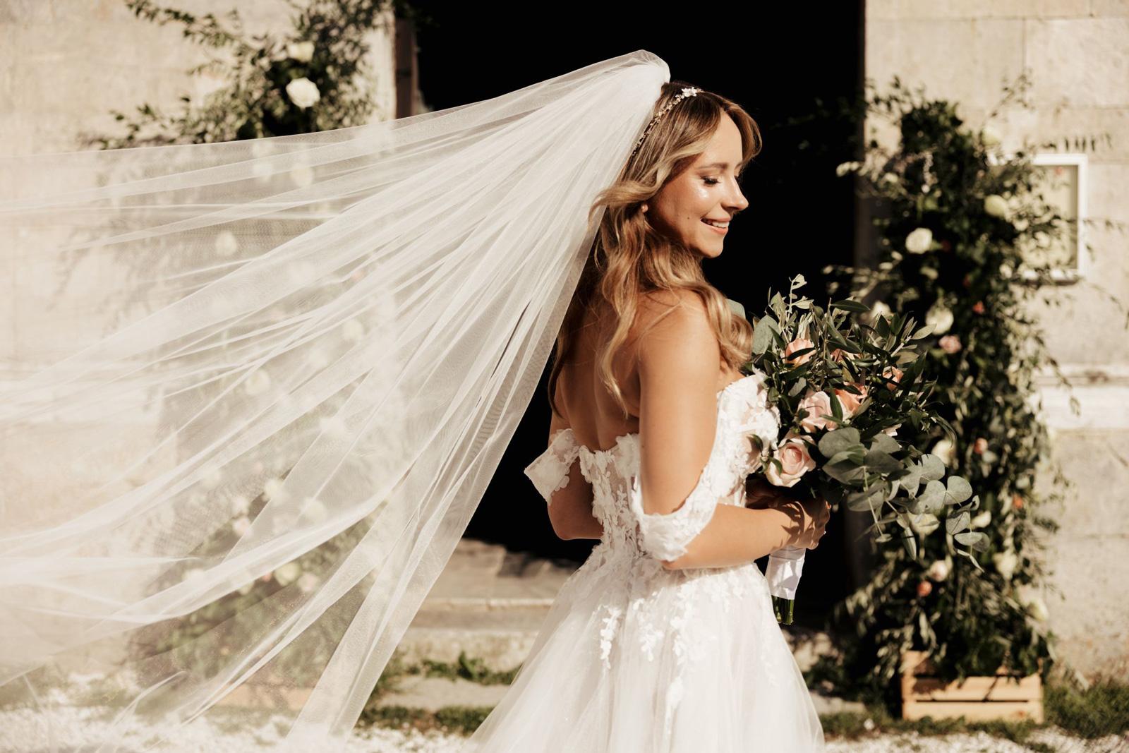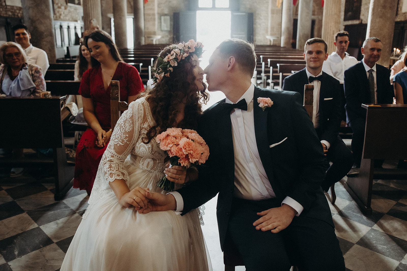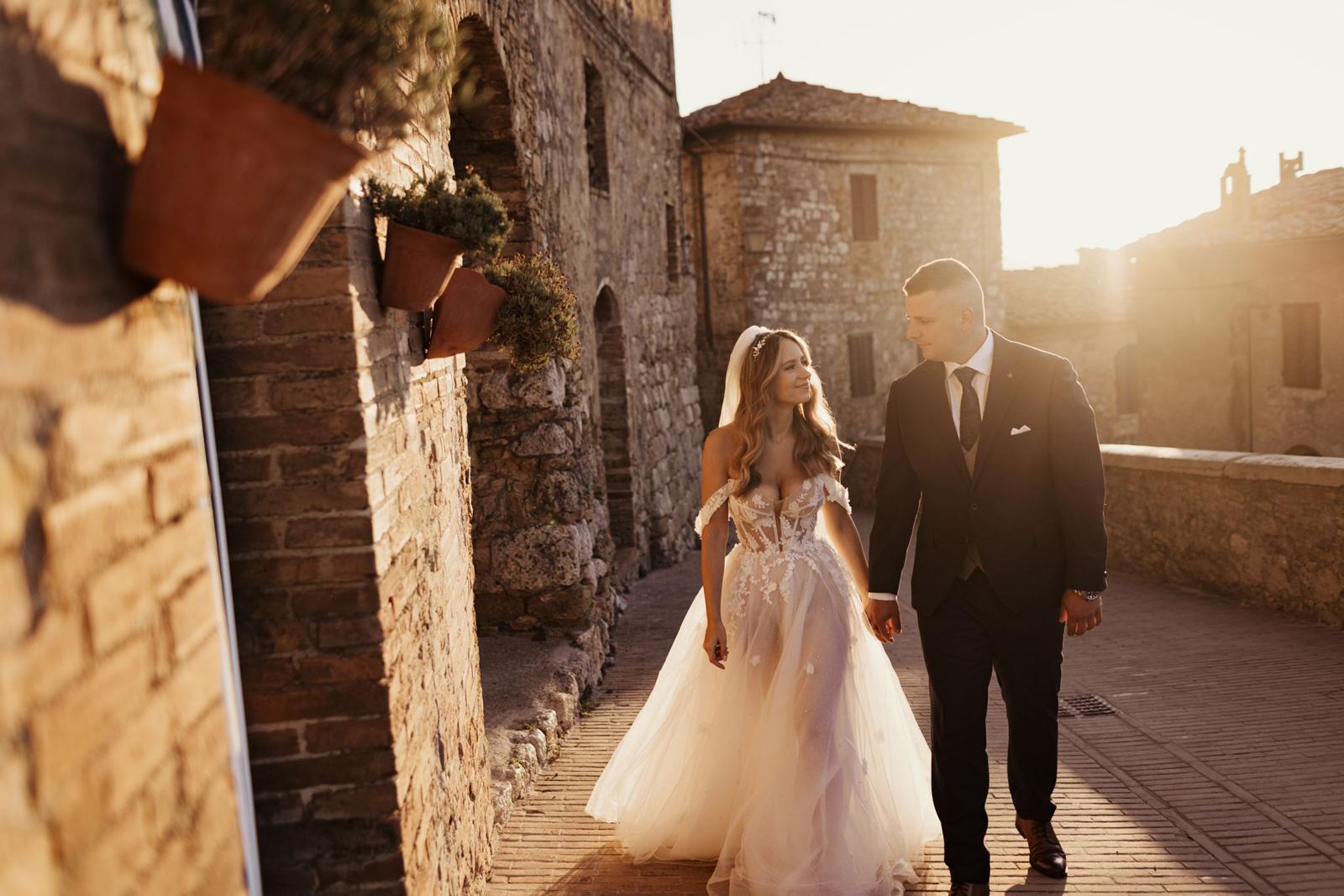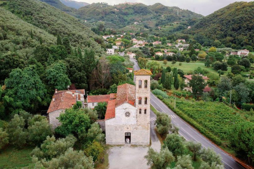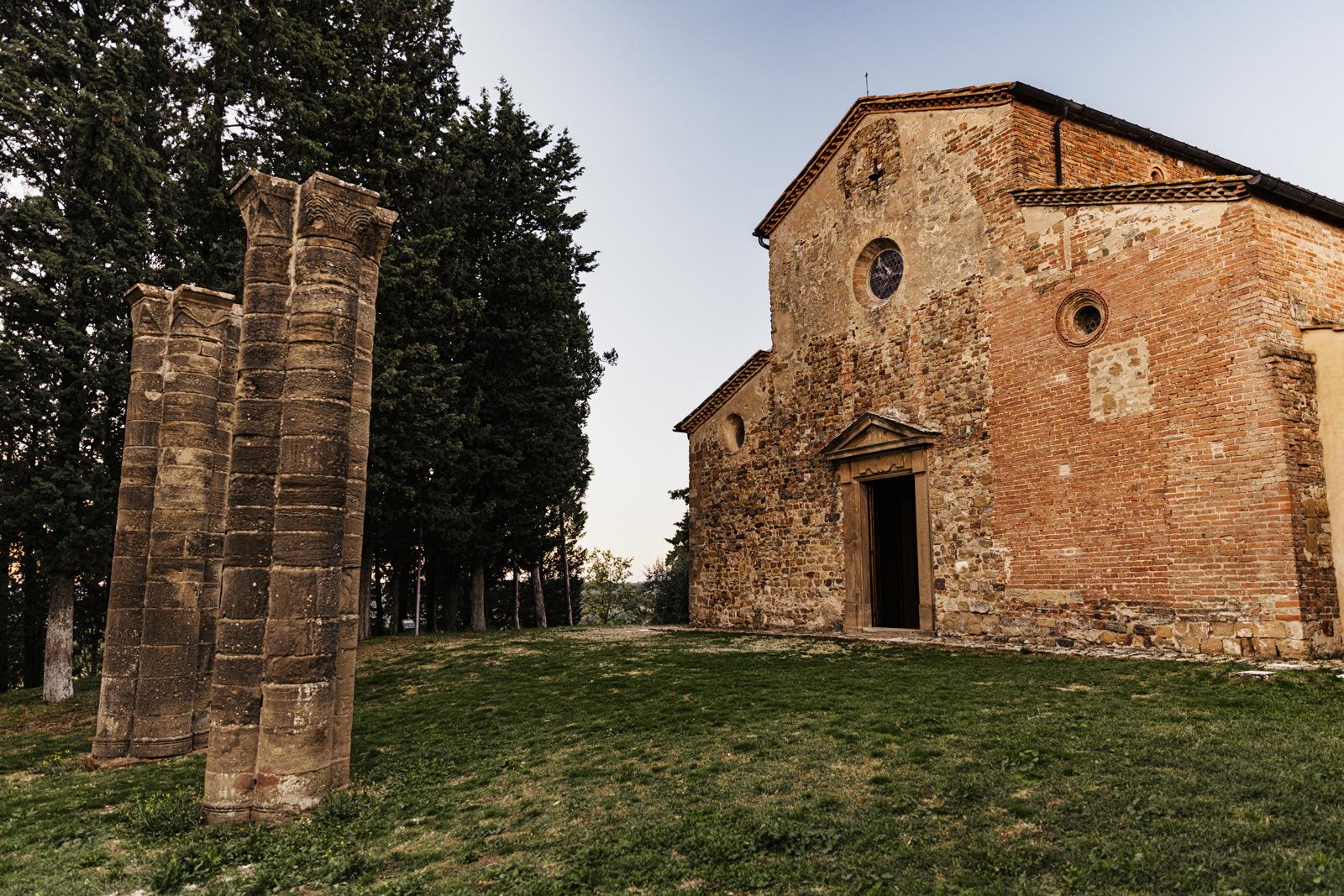 Ślub w pięknym, kamiennym budynku dawnego kościoła, z otwartym dachem.