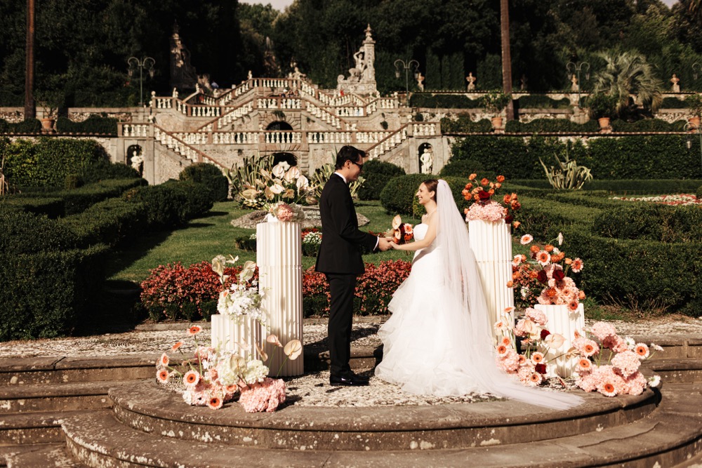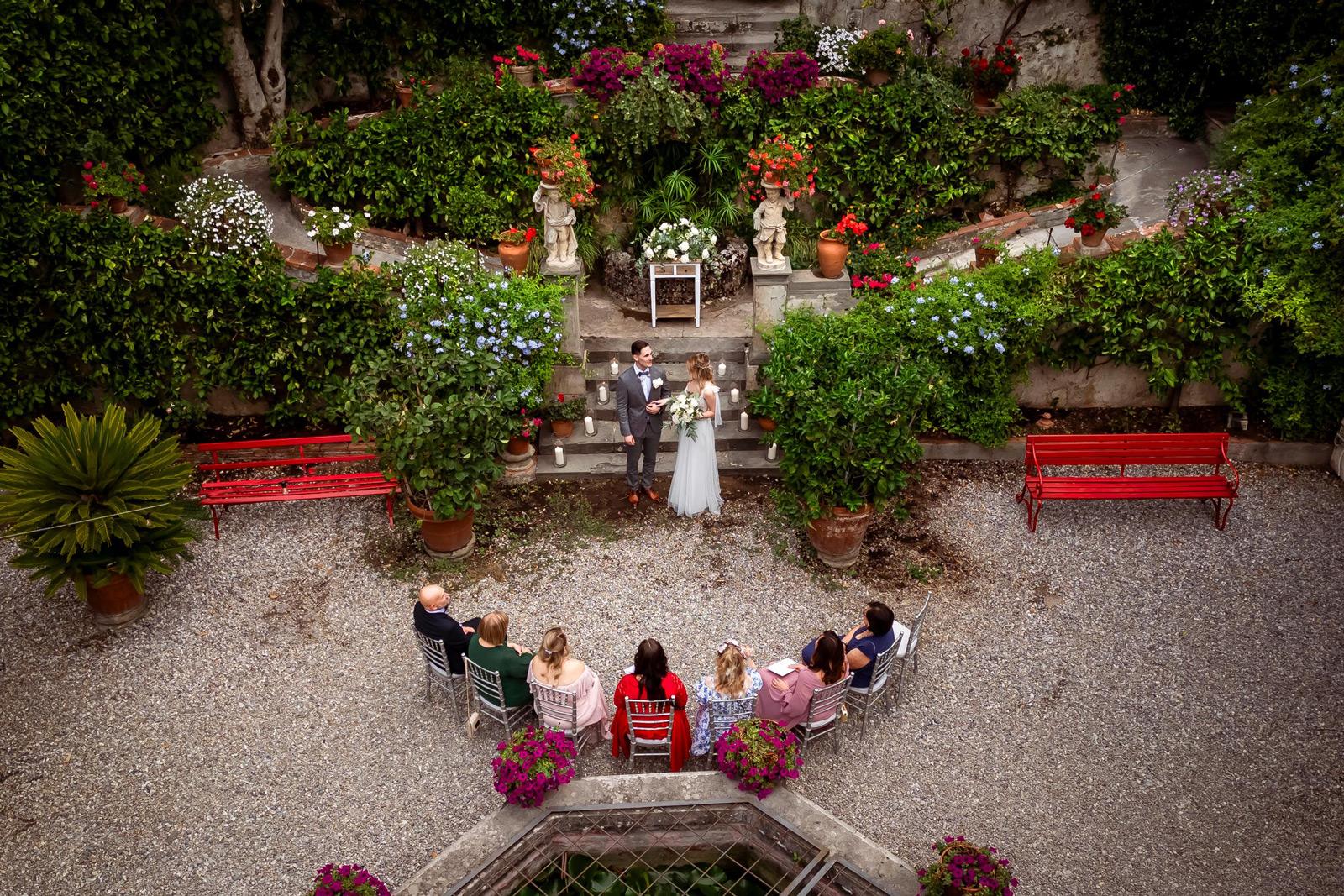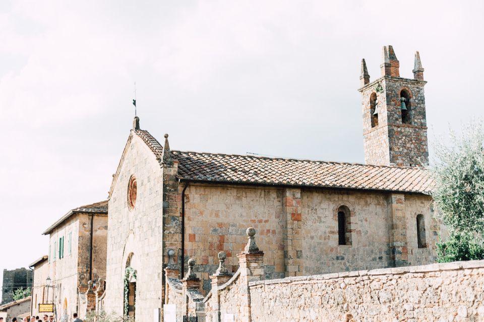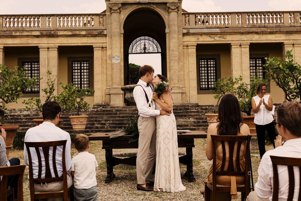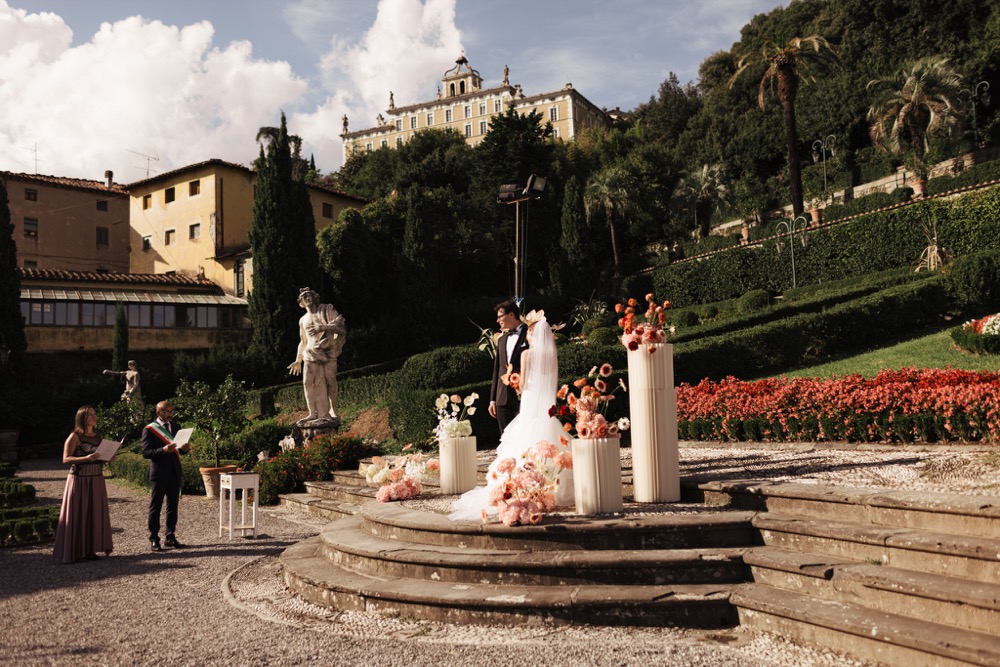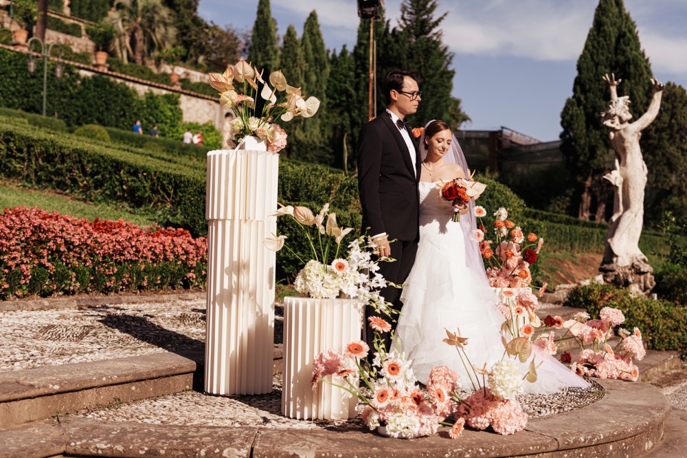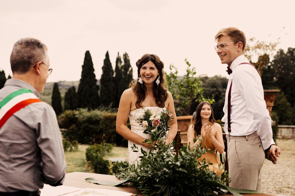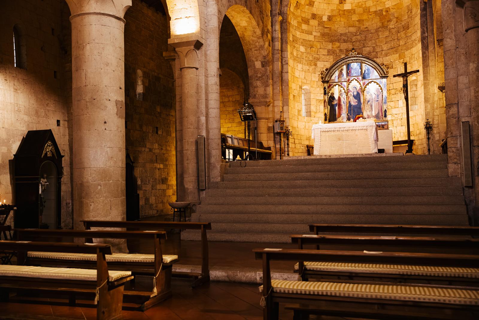 Ślub w pięknym, kamiennym budynku dawnego kościoła, z otwartym dachem.