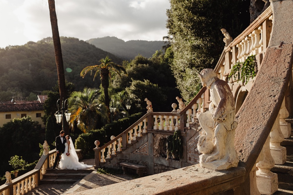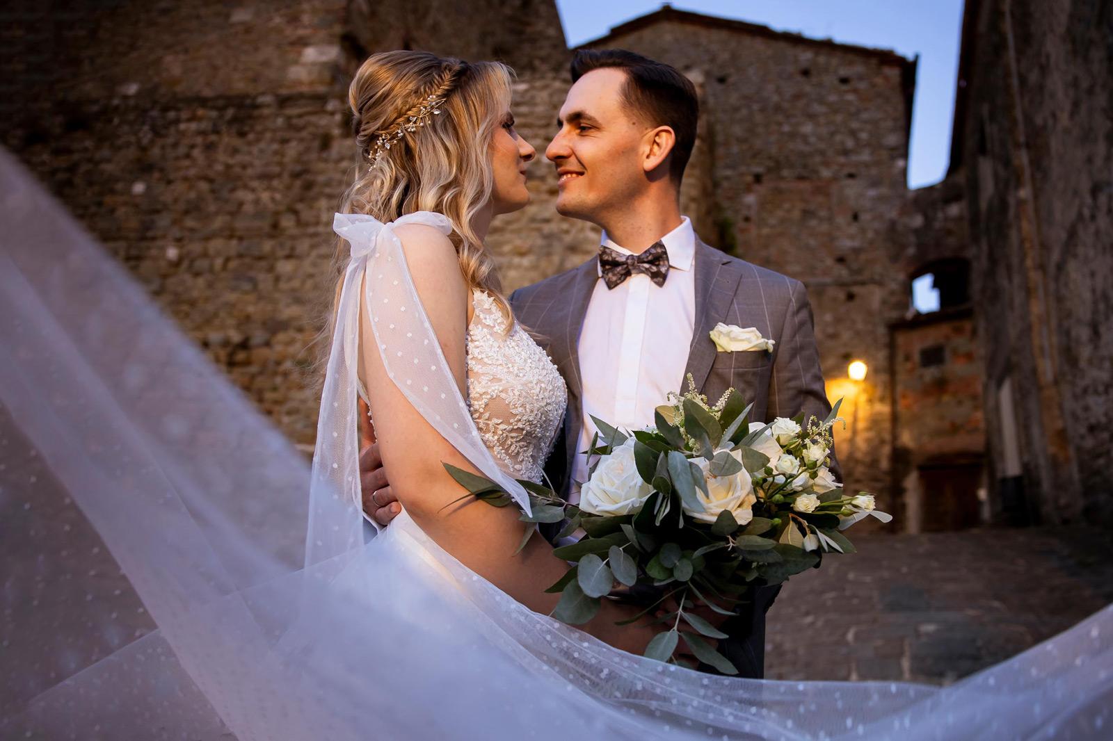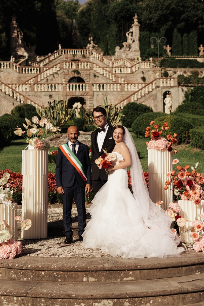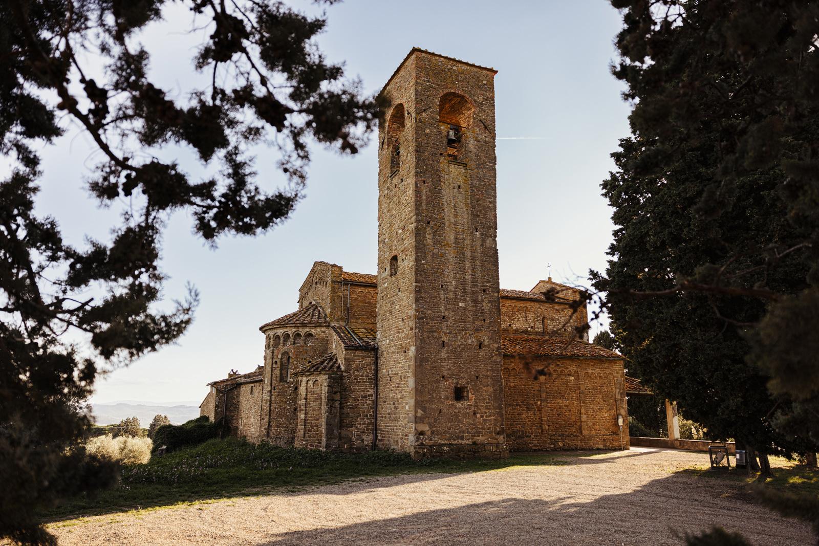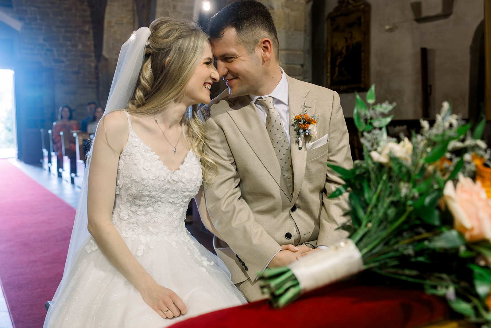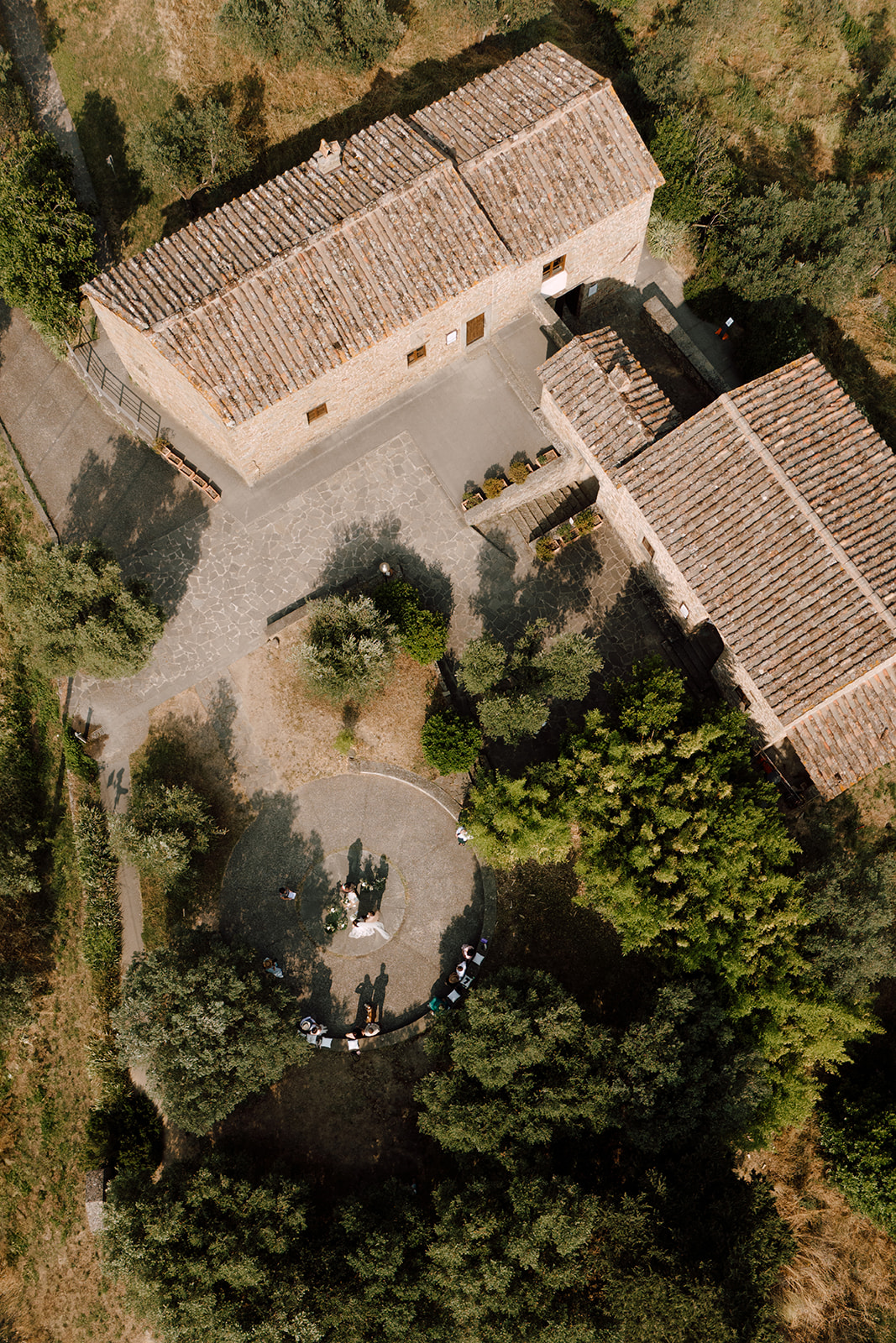 Ślub w pięknym, kamiennym budynku dawnego kościoła, z otwartym dachem.