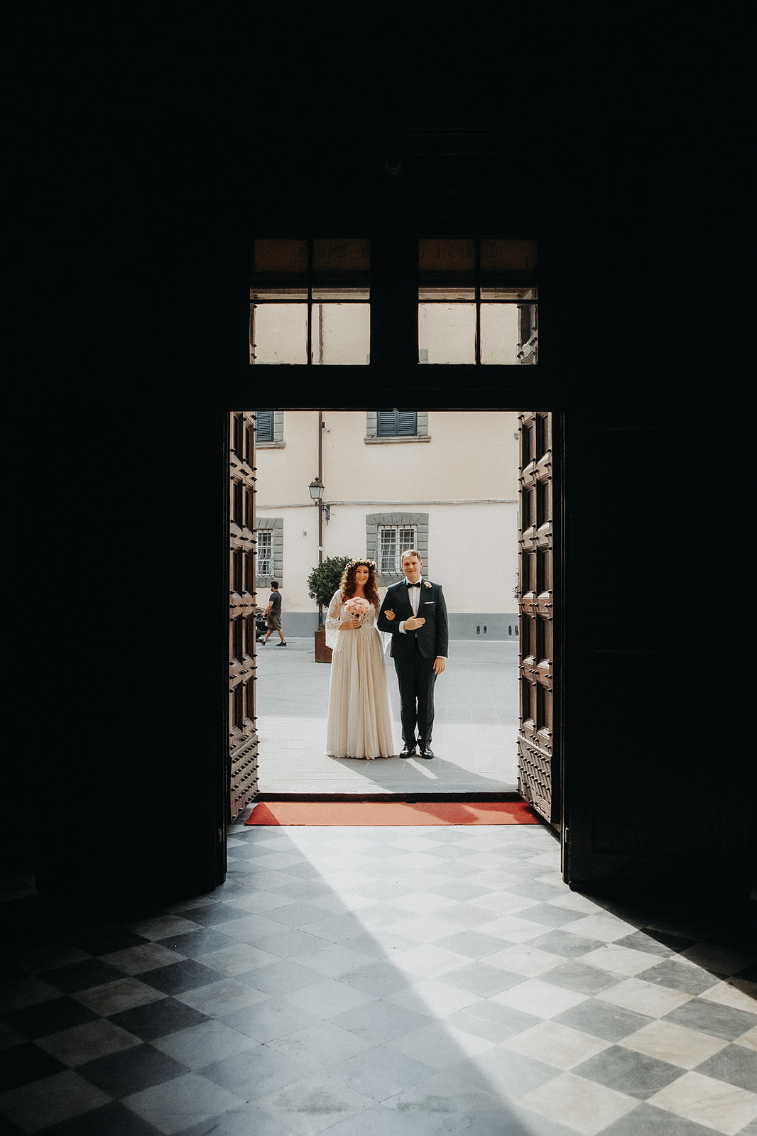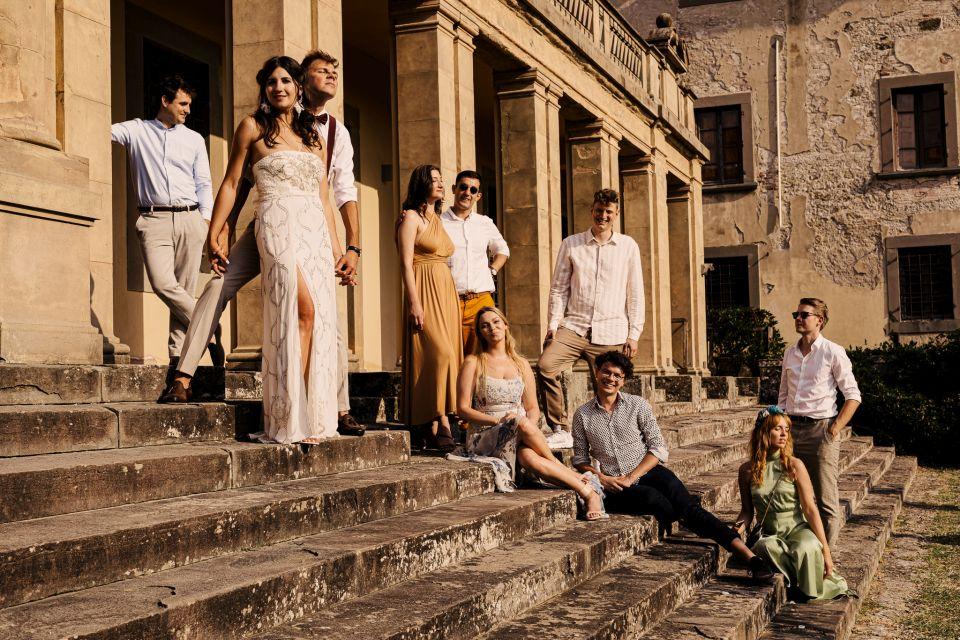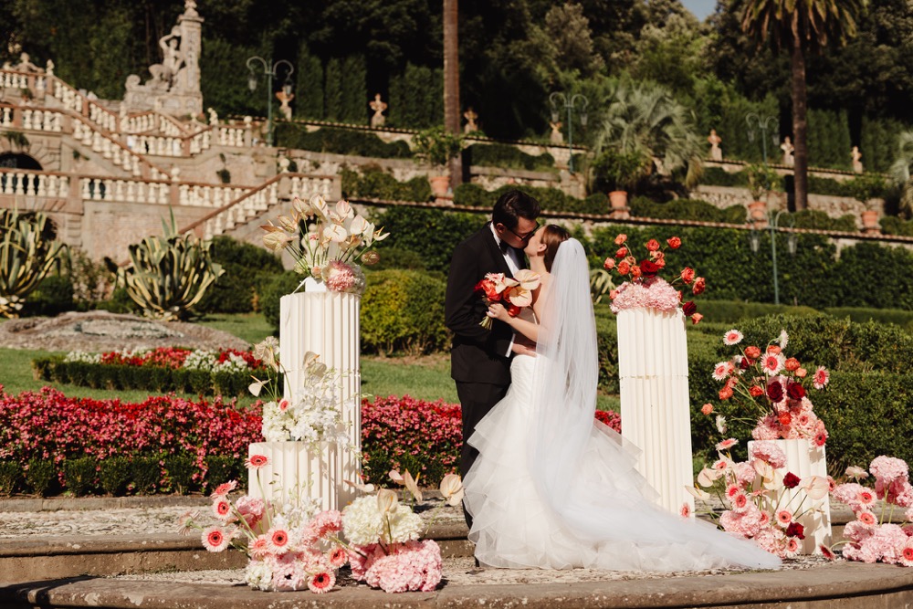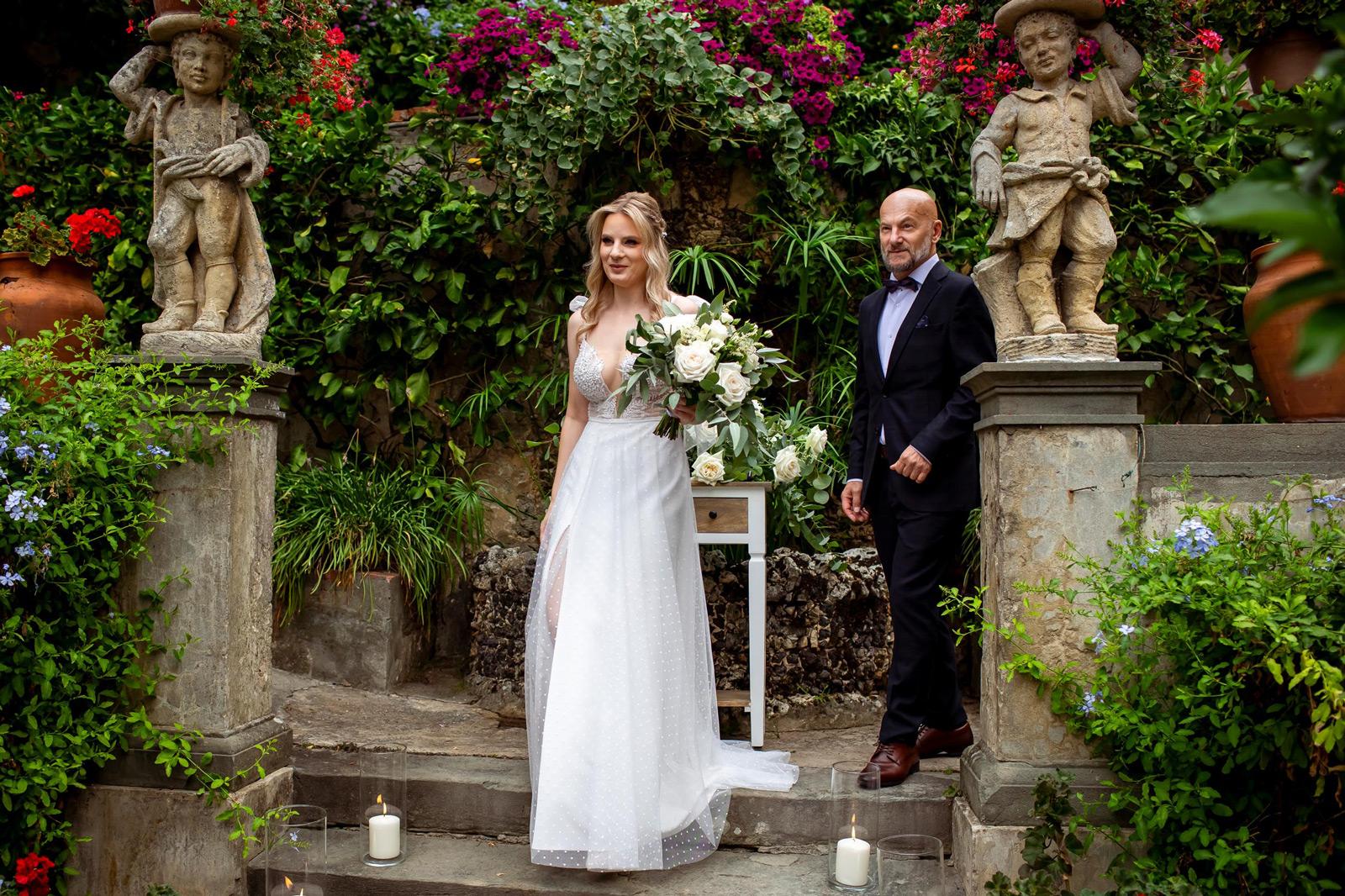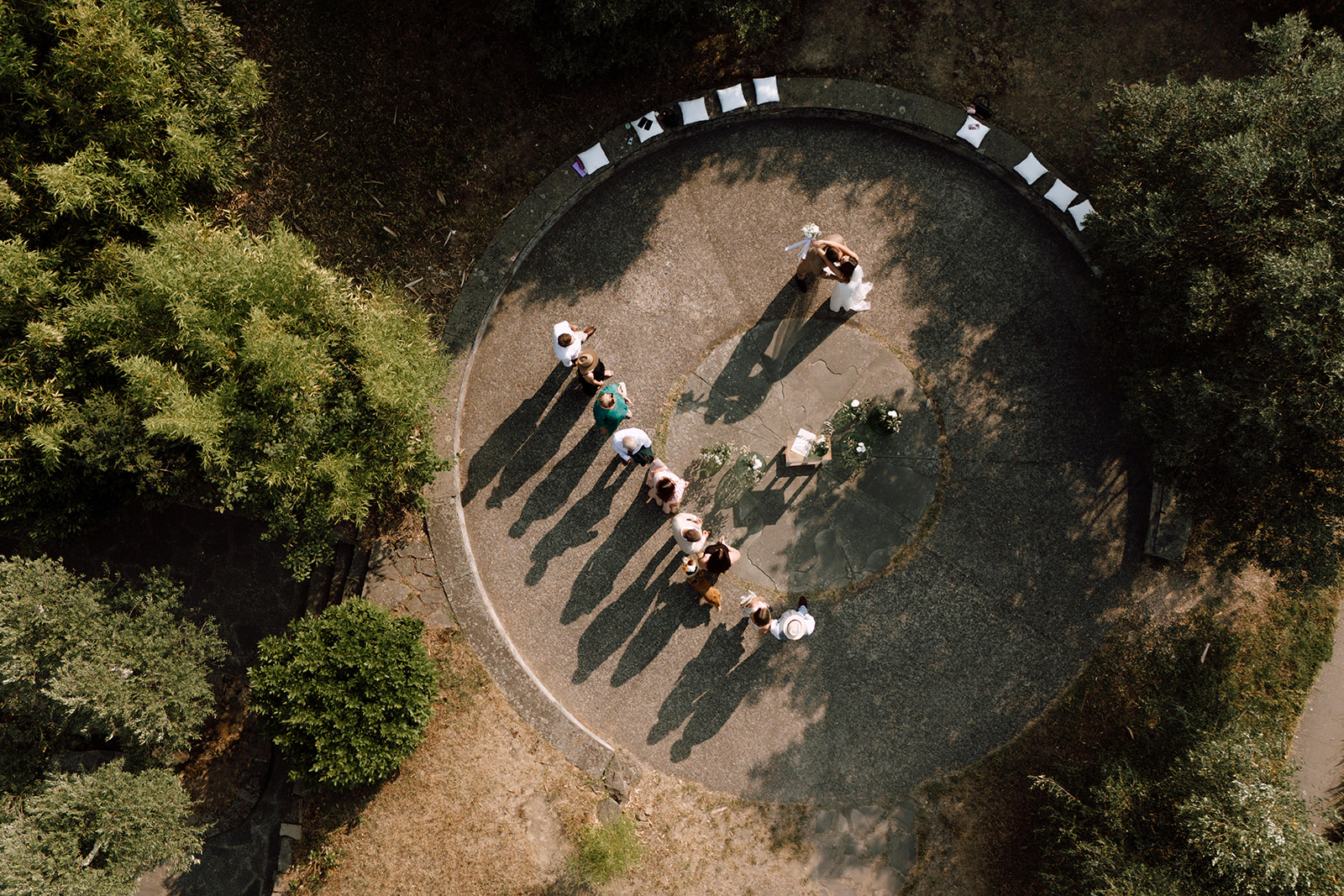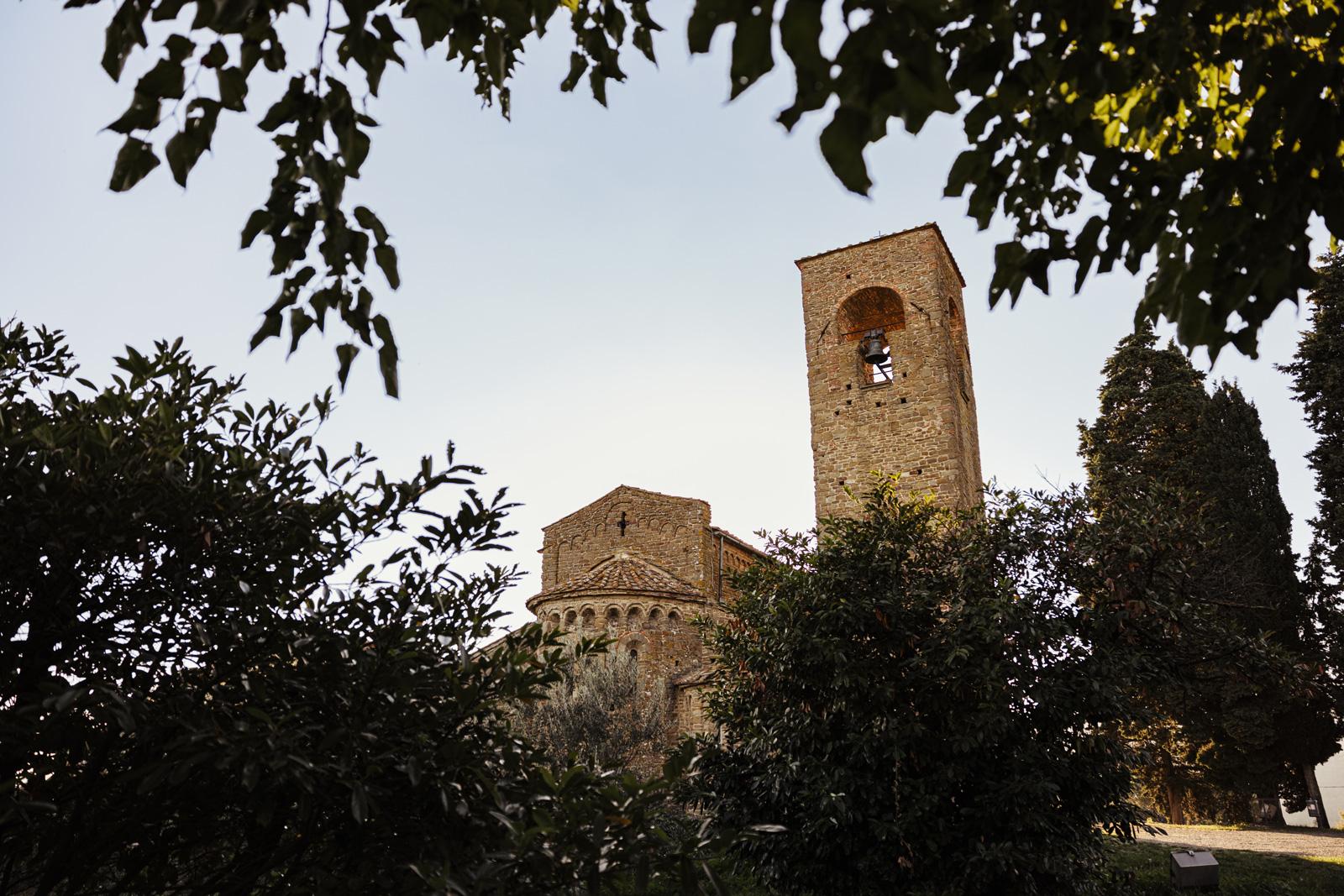 Ślub w pięknym, kamiennym budynku dawnego kościoła, z otwartym dachem.