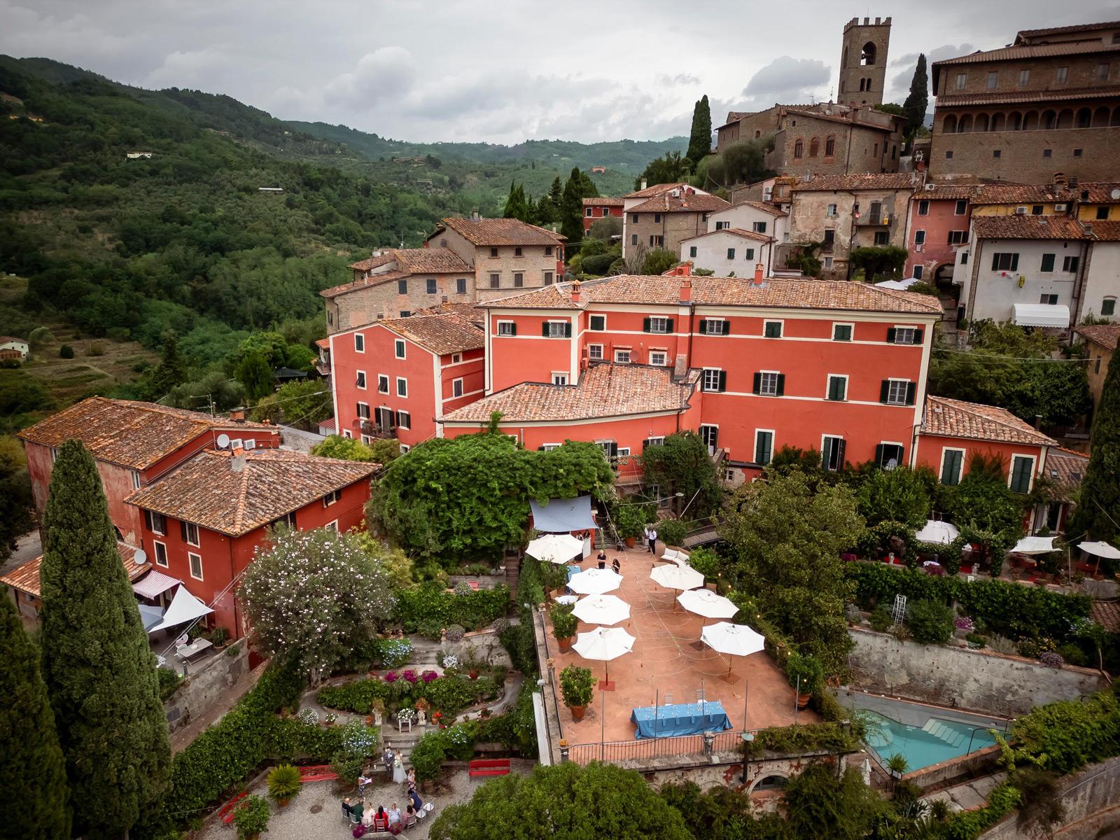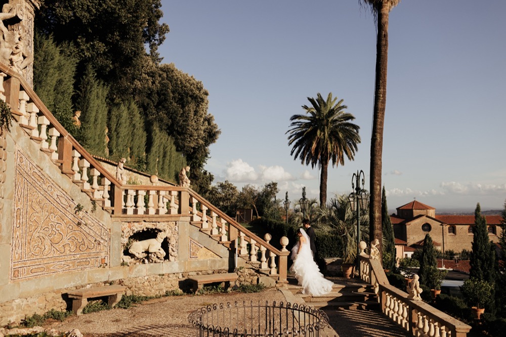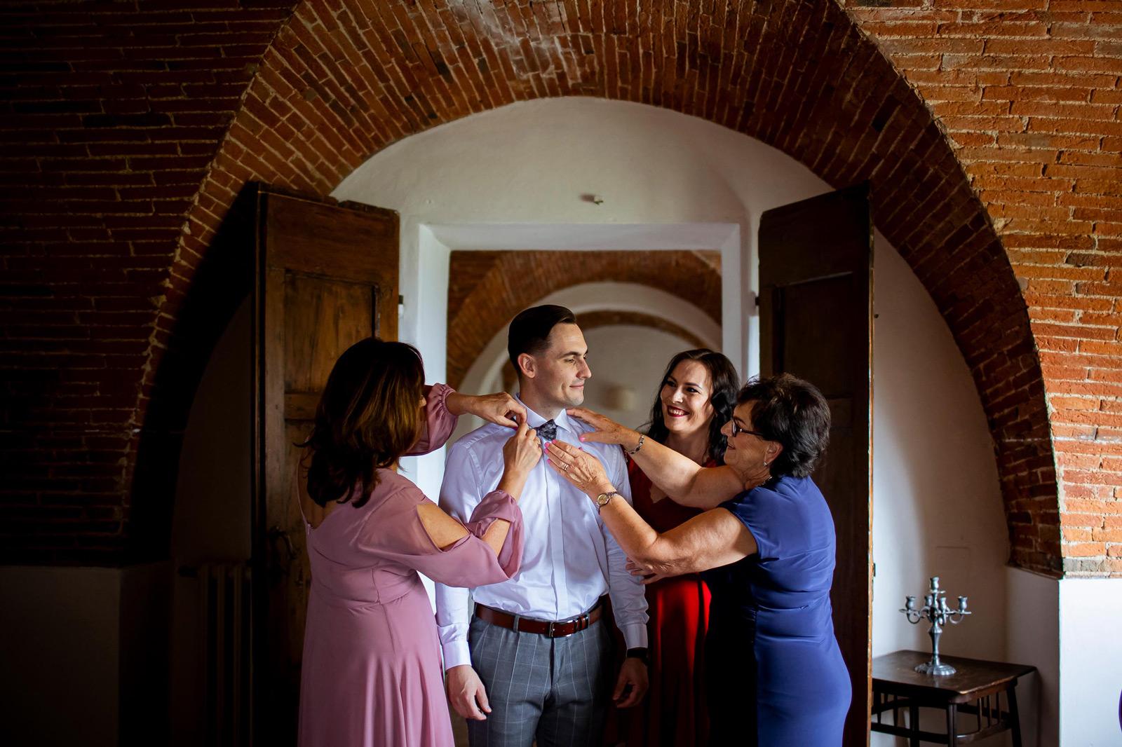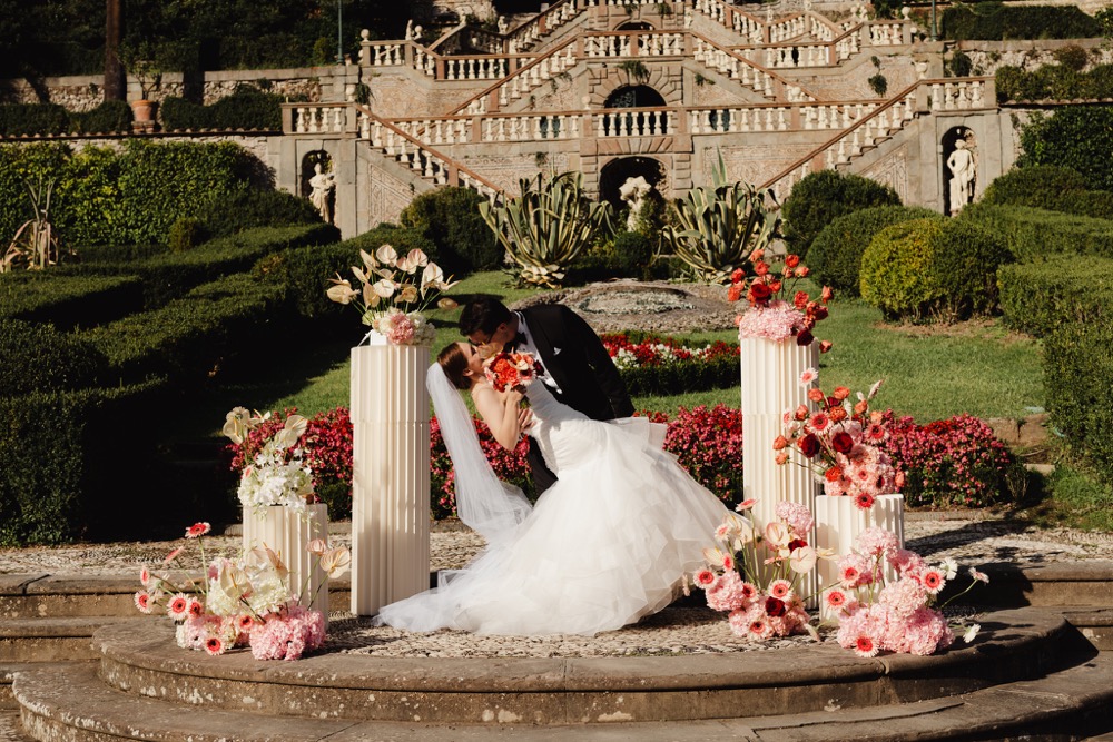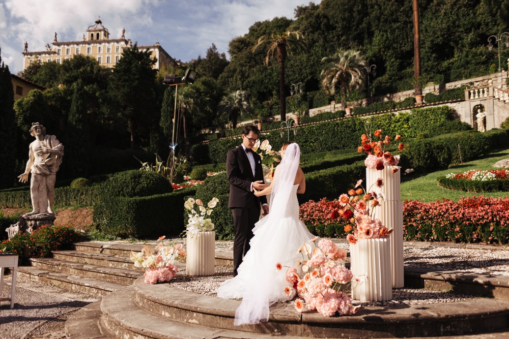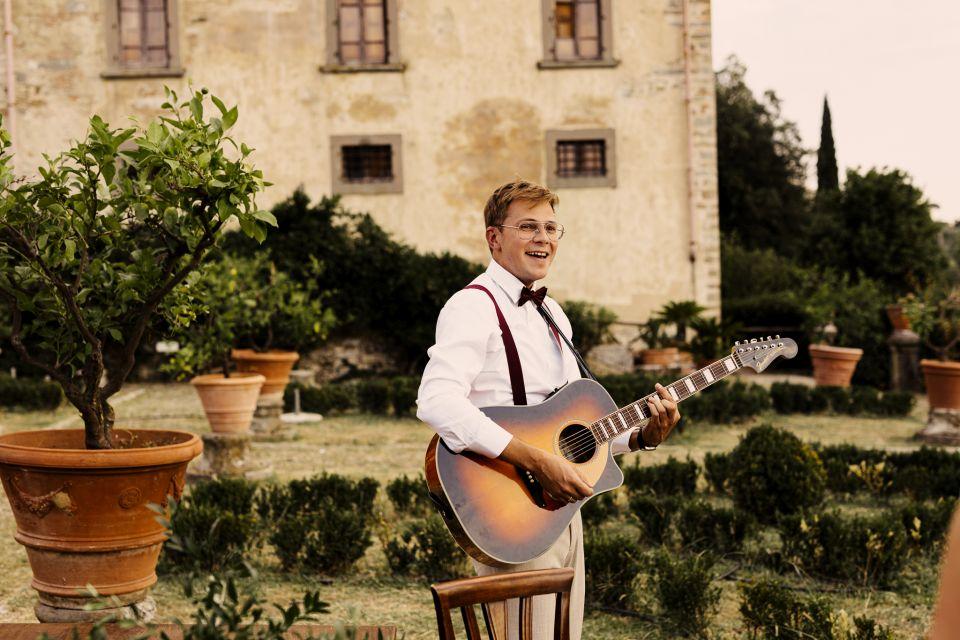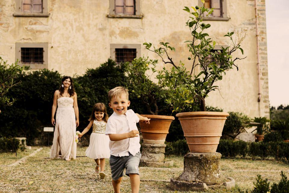 Ślub w pięknym, kamiennym budynku dawnego kościoła, z otwartym dachem.