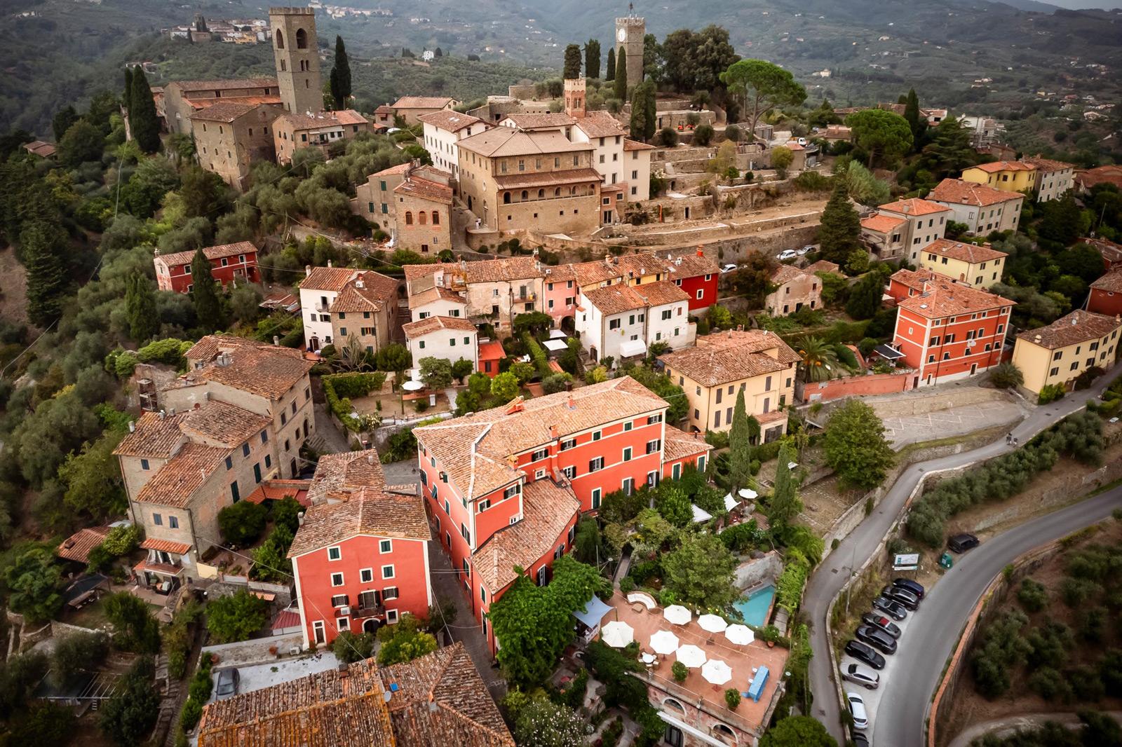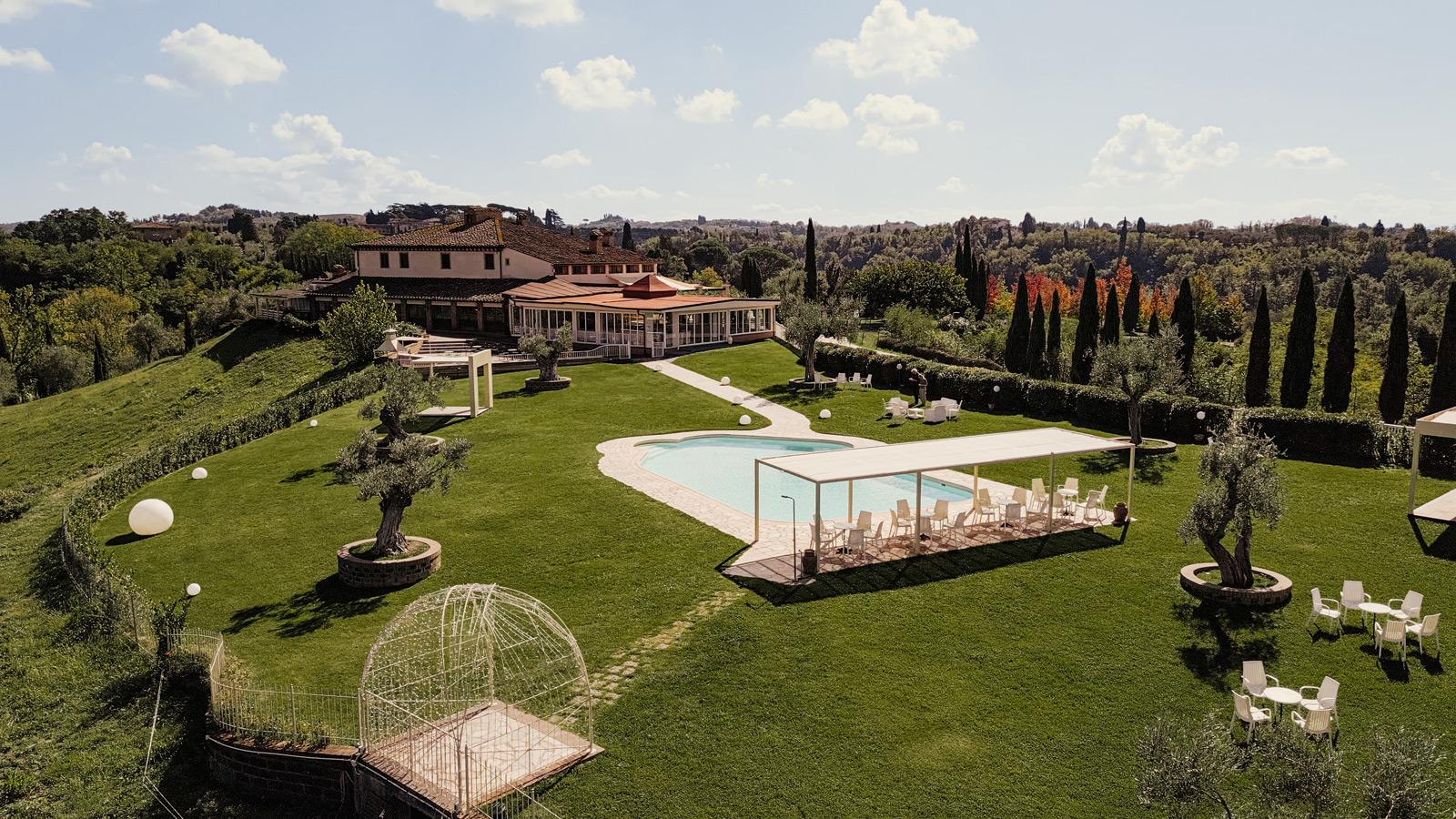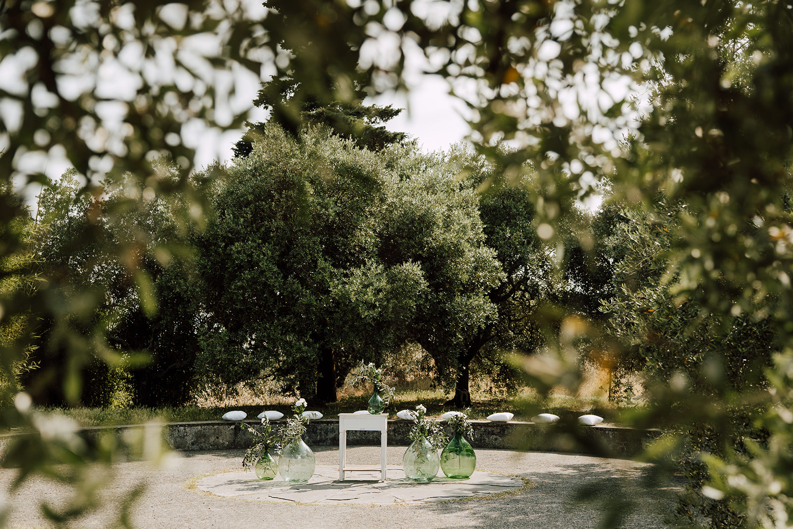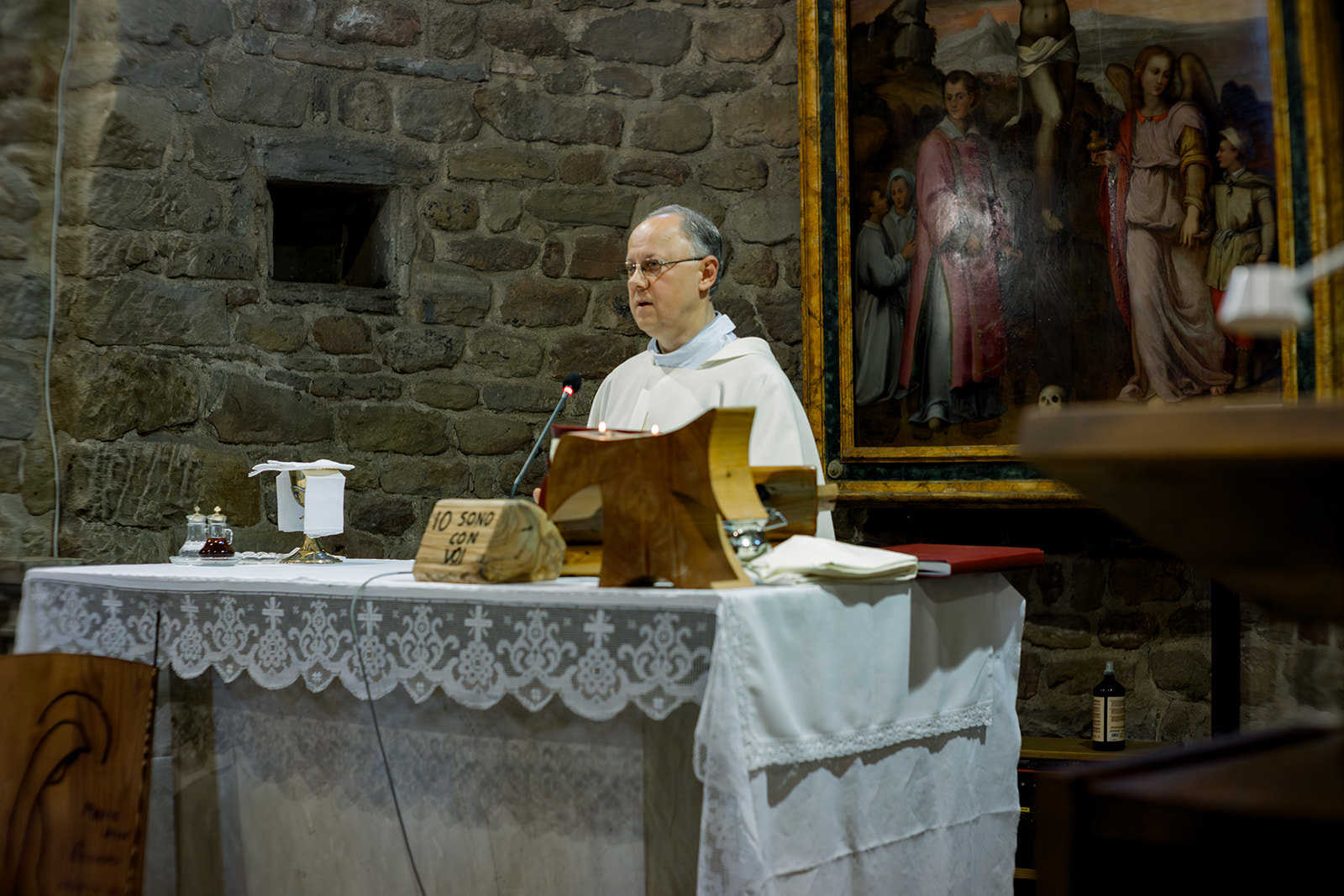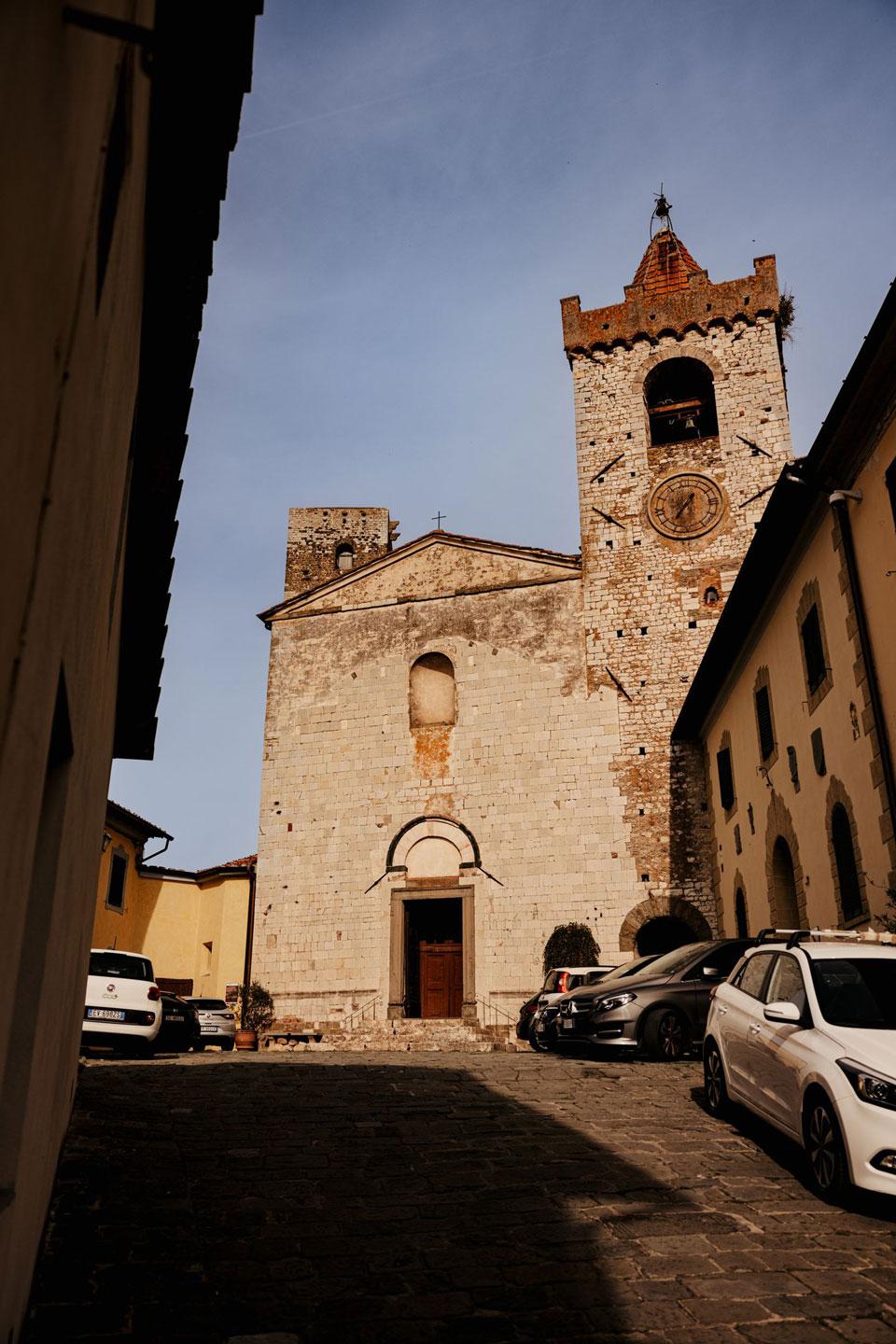 Ślub w pięknym, kamiennym budynku dawnego kościoła, z otwartym dachem.